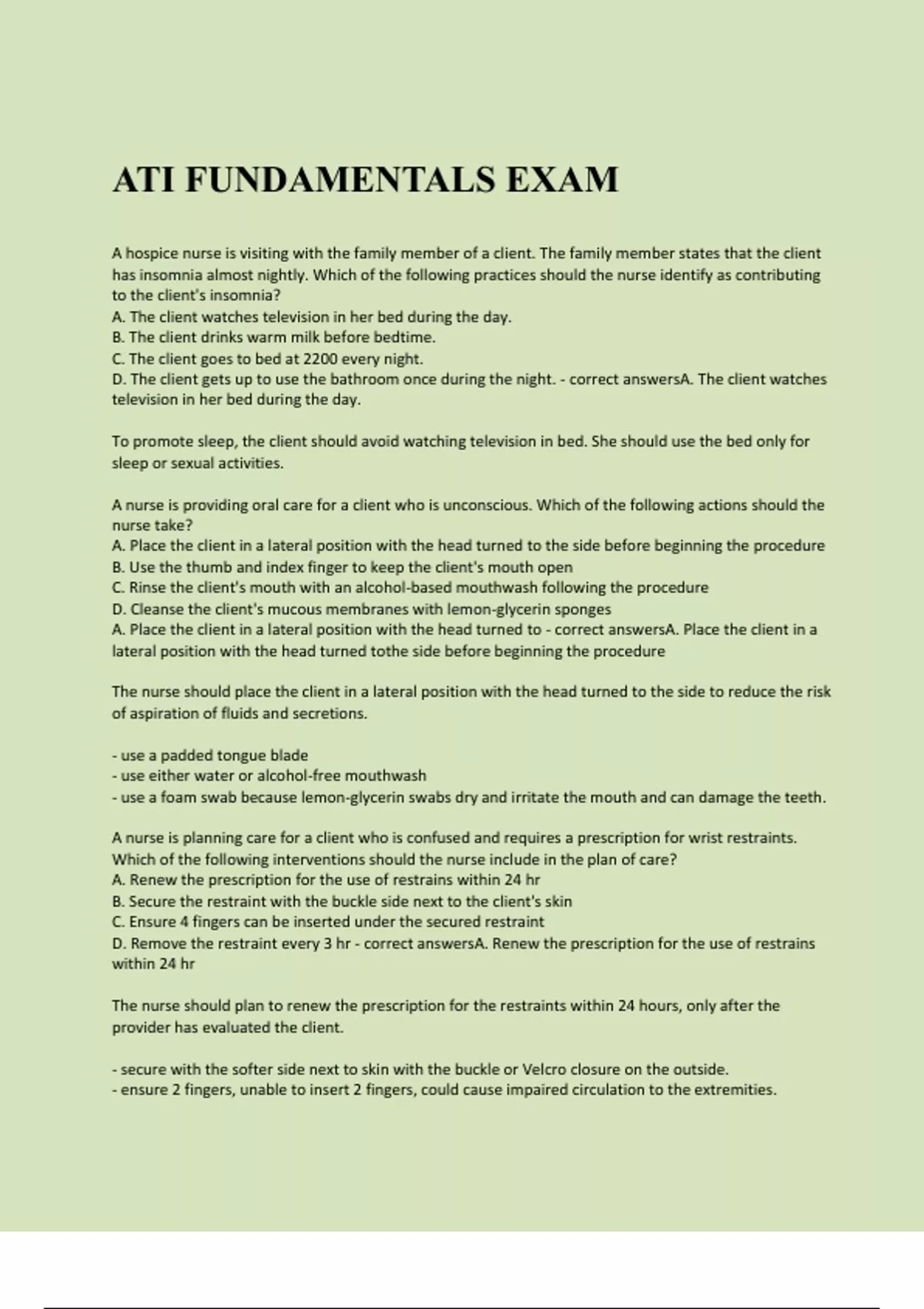 ATI FUNDAMENTALS EXAM A hospice nurse is visiting with the family member of a client. The family member states that the client has insomnia almost nightly. Which of the following practices should the nurse identify as contributing to the client's insomnia? A. The client watches television in her bed during the day. B. The client drinks warm milk before bedtime. C. The client goes to bed at 2200 every night. D. The client gets up to use the bathroom once during the night. - correct answersA. The client watches television in her bed during the day. To promote sleep, the client should avoid watching television in bed. She should use the bed only for sleep or sexual activities. A nurse is providing oral care for a client who is unconscious. Which of the following actions should the nurse take? A. Place the client in a lateral position with the head turned to the side before beginning the procedure B. Use the thumb and index finger to keep the client's mouth open C. Rinse the client's mouth with an alcohol-based mouthwash following the procedure D. Cleanse the client's mucous membranes with lemon-glycerin sponges A. Place the client in a lateral position with the head turned to - correct answersA. Place the client in a lateral position with the head turned tothe side before beginning the procedure The nurse should place the client in a lateral position with the head turned to the side to reduce the risk of aspiration of fluids and secretions. - use a padded tongue blade - use either water or alcohol-free mouthwash - use a foam swab because lemon-glycerin swabs dry and irritate the mouth and can damage the teeth. A nurse is planning care for a client who is confused and requires a prescription for wrist restraints. Which of the following interventions should the nurse include in the plan of care? A. Renew the prescription for the use of restrains within 24 hr B. Secure the restraint with the buckle side next to the client's skin C. Ensure 4 fingers can be inserted under the secured restraint D. Remove the restraint every 3 hr - correct answersA. Renew the prescription for the use of restrains within 24 hr The nurse should plan to renew the prescription for the restraints within 24 hours, only after the provider has evaluated the client. - secure with the softer side next to skin with the buckle or Velcro closure on the outside. - ensure 2 fingers, unable to insert 2 fingers, could cause impaired circulation to the extremities. - remove at least every 2 hours; at that time, check skin, change position, and toilet or exercise the client. A nurse is caring for a client who has major fecal incontinence and reports irritation in the perianal area. Which of the following actions should the nurse take first? A. Apply a fecal collection system B. Apply a barrier cream C. Cleanse and dry the area D. Check the client's perineum - correct answersD. Check the client's perineum Nursing action is for the nurse to collect more data by assessing the area of irritation. - apply a fecal collection system to divert the feces away from the area of skin irritation; - apply a barrier cream to decrease skin breakdown in the perianal area from the feces; - cleanse and dry the perianal area to decrease A newly licensed nurse is preparing to administer medications to a client. The nurse notes that the provider has prescribed a medication that is unfamiliar to him. Which of the following actions should the nurse take? A. Consult the medication reference book available on the unit B. Ask a more experienced nurse for information about the medication C. Call the client's provider and verify the prescription D. Ask the client if she takes this medication at home - correct answersA. Consult the medication reference book available on the unit A nurse must have knowledge about medications to administer them safely. The nurse should become familiar with the medication by looking it up in the medication reference on the unit. - information from this source is not sufficient to allow the nurse to administer the medication safely. - no reason to believe that the medication prescription is in error; not necessary to confirm w/ prescriber A nurse is reviewing the use of side rails with an assistive personnel (AP). Which of the following statements by the AP indicates that further teaching is required? A. "I should not leave all 4 side rails up unless there is a prescription for restraints." B. "An alert client will be safest if I raise the 2 upper side rails at the head of the bed." C. "If the client seems confused, I'll raise all 4 side rails so that he doesn't hurt himself." D. "If a client is sedated, I should raise all 4 side rails to prevent a fall out of bed." - correct answersC. "If the client seems confused, I'll raise all 4 side rails so that he doesn't hurt himself." Raising all 4 side rails can put the client at greater risk for injury. For example, the client might try to climb over the side rails, which could result in a fall. Side Rails as Restraints - correct answers- Raising all 4 side rails can put the client at greater risk for injury. For example, the client might try to climb over the side rails, which could result in a fall. - Side rails are a form of restraint when all 4 rails are raised. This requires a prescription from the provider after less restrictive methods have been unsuccessful. - Leaving the 2 upper side rails up improves the client's ability to turn and move around in bed. The client will also be able to use the rails when getting out of bed, which will help prevent falls. - Raising all 4 side rails is not considered a restraint if the client is sedated. This action reduces the client's risk for injury due to falling out of bed. A nurse is caring for a client who is receiving IV fluid replacement. Which of the following findings should the nurse identify as infiltration of the IV infusion site? A. Redness at the IV catheter entry site B. Palpable cord along the vein used for the infusion C. Taut ski