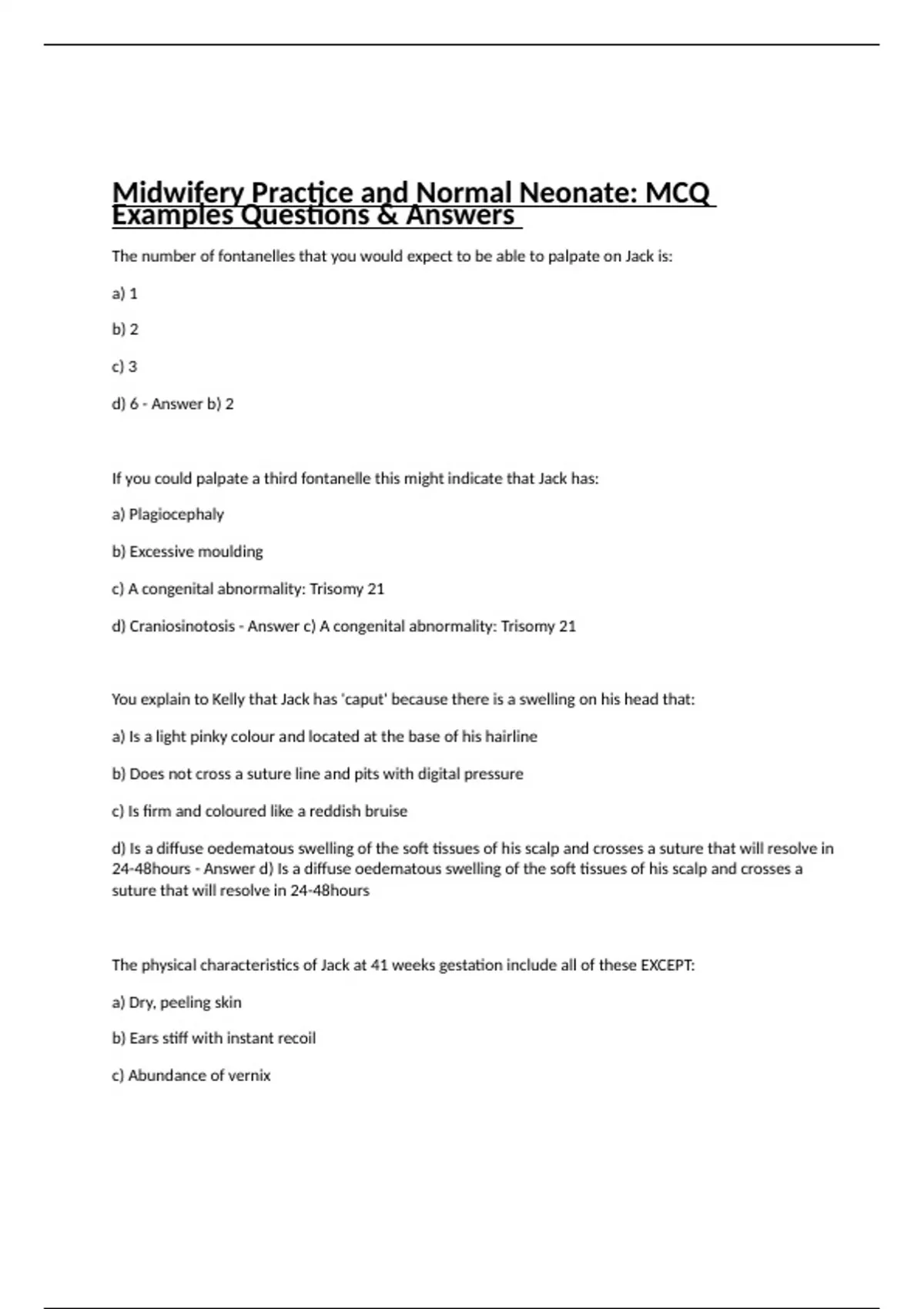 The number of fontanelles that you would expect to be able to palpate on Jack is: a) 1 b) 2 c) 3 d) 6 - Answer b) 2 If you could palpate a third fontanelle this might indicate that Jack has: a) Plagiocephaly b) Excessive moulding c) A congenital abnormality: Trisomy 21 d) Craniosinotosis - Answer c) A congenital abnormality: Trisomy 21 You explain to Kelly that Jack has 'caput' because there is a swelling on his head that: a) Is a light pinky colour and located at the base of his hairline b) Does not cross a suture line and pits with digital pressure c) Is firm and coloured like a reddish bruise d) Is a diffuse oedematous swelling of the soft tissues of his scalp and crosses a suture that will resolve in 24-48hours - Answer d) Is a diffuse oedematous swelling of the soft tissues of his scalp and crosses a suture that will resolve in 24-48hours The physical characteristics of Jack at 41 weeks gestation include all of these EXCEPT: a) Dry, peeling skin b) Ears stiff with instant recoil c) Abundance of vernix d) Scrotum with deep rugae - Answer a) Abundance of vernix Radiation is the most predominate mode of heat loss for Jack. Radiation refers to: a. loss of heat through water evaporation from the baby b. loss of heat through the baby shivering c. loss of heat from the baby's surface to surrounding colder objects d. loss of heat to moving air or fluid around the baby - Answer c. loss of heat from the baby's surface to surrounding colder objects Kelly asks how many hours a day does Jack is likely to sleep. You reply that it is usual for a newborn to sleep: a. 8 - 10 hours b. 10 - 12 hours c. 14 - 16 hours d. 18 - 20 hours - Answer c. 14 - 16 hours You palpate Jacks femoral pulses. If you found an asynchronous pulsation this may indicate: a. poor circulation to the legs b. common finding in the first weeks of examination' c. congenital cardiovascular anomaly d. less blood volume being pumped - Answer d. congenital cardiovascular anomaly Barlow's test is used to: a. Check the baby's buttocks creases are symmetrical b. Check that the limbs are of equal length c. Confirm that the pelvis is stable d. To access if hip is subluxable (can be easily dislocated of the acetabulum). e. None of the above - Answer d. none of the above Which of the following findings is Jack at increased risk of having because it occurred to his sister: a) Breech presentation b) Developmental dysplasia of the hips c) Port wine stain birthmark d) Absent red eye reflex - Answer Developmental dysplasia of the hips You examine Jacks genitalia. The most common finding in the male newborn is: a) Hydrocele b) Epispadias c) Inguinal hernia d) Chordee - Answer a) Hydrocele AT one week Kelly complains that Jack's umbilical cord is smelly. You: a.Tell her that often happens and reassure her all is well b.Inspect the cord and surrounding skin c.Clean the cord with antiseptic d.Phone a pediatrician - Answer b) Inspect the cord and surrounding skin As a midwife you are always ready to resuscitate a baby but which one of the following might reassure you that resuscitation is less likely to be needed for Charlotte's baby a) Meconium in the liquor b) Reassuring heart rate c) Prolonged labour d) Assisted delivery - Answer b) Reassuring heart rate Which of the following is NOT a characteristic of fetal circulation: a) Shunt dependent b) Hypogastric arteries c) Low oxygen affinity haemoglobin d) High pulmonary resistance - Answer c) Low oxygen affinity haemoglobin You explain that Charlottes fetus is able to produce urine from which gestation? a) 8-10 weeks b) 10-12 weeks c) 24-26 weeks d) 32-34 weeks - Answer b) 10-12 weeks Charlotte rapidly gives birth to Rosie in 2 ½ hours. She weighs 4320g and after attempting to feed has been disinterested in the last 32 hours requiring some expressed breast milk top-ups. Rosie is at an increased risk of hypoglycaemia because of: 1) Her size 2) Her disinterest in feeding 3) Her precipitous birth 4) Hypoxia that occurred during labour a) 1 and 2 b) 1, 2 and 3 c) 1, 2, and 4 d) 3 and 4 - Answer b) 1, 2 and 3 You clamp and cut Rosie's cord. This closes the ductus venosus because: a) Higher oxygen concentrations are now present as she is breathing b) The umbilical vein closes and systemic vascular resistance is increased c) The inferior vena cava is now receiving deoxygenated blood d) Higher pressure in the left atrium closes the foramen ovale decreasing vascular resistance - Answer d) Higher pressure in the left atrium closes the foramen ovale decreasing vascular resistance When listening to Rosies' heart you place your stethoscope on the area between the 4th and 5th rib left of the sternum to listen to which heart sound? a) Mitral b) Aortic c) Pulmonic d) Tricuspid - Answer d) Tricuspid Charlotte's has declined Vitamin K. You review the signs and symptoms of Vitamin K deficiency bleeding that could alert her to a problem. Signs of Vitamin K deficiency bleeding are: a) Urates in the nappy b) Lethargy, petechiae and bleeding from umbilicus c) Petechiae, jaundice and ooze from the umbilicus d) Lethargy, temp of <36.5, and delayed meconium passage - Answer b) Lethargy, petechiae and bleeding from umbilicus Fill in the gap: You explain that Rosie is more likely to develop jaundice as she produces ________ bilirubin than an adult? a) twice the amount of b) triple the amount of c) quadruple the amount of d) ten times the amount of - Answer a) twice the amount of