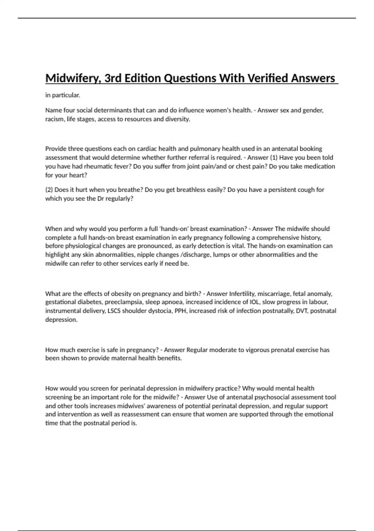 in particular. Name four social determinants that can and do influence women's health. - Answer sex and gender, racism, life stages, access to resources and diversity. Provide three questions each on cardiac health and pulmonary health used in an antenatal booking assessment that would determine whether further referral is required. - Answer (1) Have you been told you have had rheumatic fever? Do you suffer from joint pain/and or chest pain? Do you take medication for your heart? (2) Does it hurt when you breathe? Do you get breathless easily? Do you have a persistent cough for which you see the Dr regularly? When and why would you perform a full 'hands-on' breast examination? - Answer The midwife should complete a full hands-on breast examination in early pregnancy following a comprehensive history, before physiological changes are pronounced, as early detection is vital. The hands-on examination can highlight any skin abnormalities, nipple changes /discharge, lumps or other abnormalities and the midwife can refer to other services early if need be. What are the effects of obesity on pregnancy and birth? - Answer Infertility, miscarriage, fetal anomaly, gestational diabetes, preeclampsia, sleep apnoea, increased incidence of IOL, slow progress in labour, instrumental delivery, LSCS shoulder dystocia, PPH, increased risk of infection postnatally, DVT, postnatal depression. How much exercise is safe in pregnancy? - Answer Regular moderate to vigorous prenatal exercise has been shown to provide maternal health benefits. How would you screen for perinatal depression in midwifery practice? Why would mental health screening be an important role for the midwife? - Answer Use of antenatal psychosocial assessment tool and other tools increases midwives' awareness of potential perinatal depression, and regular support and intervention as well as reassessment can ensure that women are supported through the emotional time that the postnatal period is. What are the estimated rates of family (intimate) violence in pregnant women in Australia and New Zealand? Why are they only 'estimated'? - Answer 42 % of women experienced violence during their pregnancy, with 20% assaulted for the first time during their pregnancy. These are estimated numbers as the stigma and fear around reporting family violence still prevent women from actively reporting. Give two benefits and two disadvantages of routine screening for family violence in pregnancy. - Answer Benefits—allows women to know that there is support and allows them access to it; raises general awareness in the community which has long term benefits for all sections of the community. Disadvantages—women who experience family violence may not attend antenatal appointments and therefore will miss out on screening; fear about reporting and what happens next prevents them from being honest. Name three adverse effects related to smoking cigarettes in pregnancy for (a) the mother and (b) the baby. - Answer a) Hypertension in pregnancy, antepartum haemorrhage, asthma. B) Low birth weight, SIDS, lung disease. What are some of the adverse effects of using heroin in pregnancy? - Answer Miscarriage, preterm labour, IUGR, stillbirth. What are the signs and symptoms of chlamydia infection in women? - Answer Vaginal discharge or abnormal bleeding, abdominal pain, fever due to PID or infection, infertility or ectopic pregnancy, dysuria. What are the main characteristics of a profession and why is it important for midwifery to be a profession? - Answer Midwives are a disciplined group of individuals who adhere to high ethical standards and uphold themselves to, and are accepted by, the public as possessing a unique body of knowledge and skills that are derived from specialised education, Outline the action of the combined oestrogen/progesterone contraceptive pill with reference to the hypothalamic-pituitary-ovarian (HPO) axis. - Answer Hormonal contraceptives contain levels of oestrogen and/or progesterone that cause feedback control on the HPO axis to prevent follicle development and ovulation. Some contraceptives use the cervical mucus-changing properties of progesterone (e.g. the minipill). List three physiological factors that promote successful fertilisation. - Answer (1) The oocyte secretes a chemical that attracts sperm (Sun et al., 2005). (2) Progesterone released after ovulation stimulates the acrosomal reaction (Shah et al., 2003). (3) Increased oestrogen levels at this time have many effects, such as: increasing the contractility of the fallopian tube, which assists sperm transport. Explain why teratogens tend to cause more severe developmental problems when exposure occurs in the first 8 weeks of pregnancy. - Answer The embryo is vulnerable to developmental disruption from a wide range of teratogens— environmental agents such as infections, hyperthermia, drugs and radiation exposure, and nicotine and narcotics exposure, leading to major congenital abnormalities.