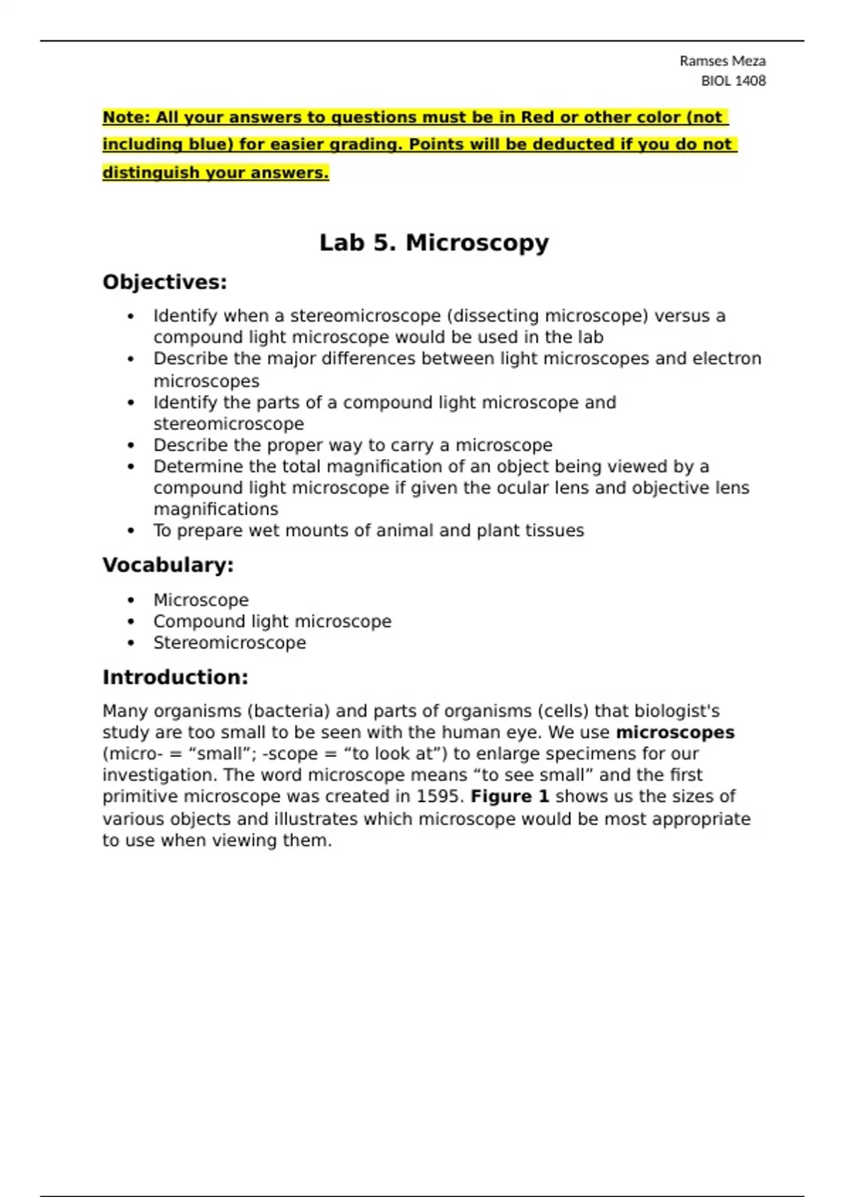 Objectives: Identify when a stereomicroscope (dissecting microscope) versus a compound light microscope would be used in the lab Describe the major differences between light microscopes and electron microscopes Identify the parts of a compound light microscope and stereomicroscope Describe the proper way to carry a microscope Determine the total magnification of an object being viewed by a compound light microscope if given the ocular lens and objective lens magnifications To prepare wet mounts of animal and plant tissues Vocabulary: Microscope Compound light microscope Stereomicroscope Introduction: Many organisms (bacteria) and parts of organisms (cells) that biologist's study are too small to be seen with the human eye. We use microscopes (micro- = “small”; -scope = “to look at”) to enlarge specimens for our investigation. The word microscope means “to see small” and the first primitive microscope was created in 1595. Figure 1 shows us the sizes of various objects and illustrates which microscope would be most appropriate to use when viewing them. Ramses Meza BIOL 1408 Figure 1: Illustration of the sizes of various objects. Credit: Jeremy Seto and derived from works by IgniX, Gringer, Jiver, Ninjatacoshell, Ali Zifan (CC-BYSA) There are several types of microscopes, but you will be mostly using a compound light microscope. This type of microscope uses visible light focused through two lenses, the ocular and the objective, to view a small specimen. Only cells that are thin enough for light to pass through will be visible with a light microscope in a two-dimensional image. Another microscope that you will use in lab is a stereomicrosc