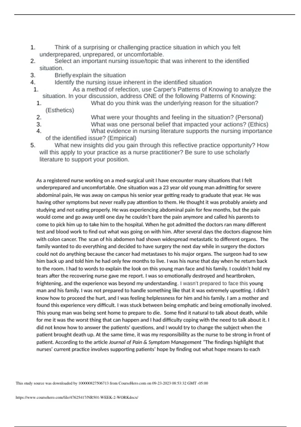 1. As a method of refection, use Carper's Patterns of Knowing to analyze the