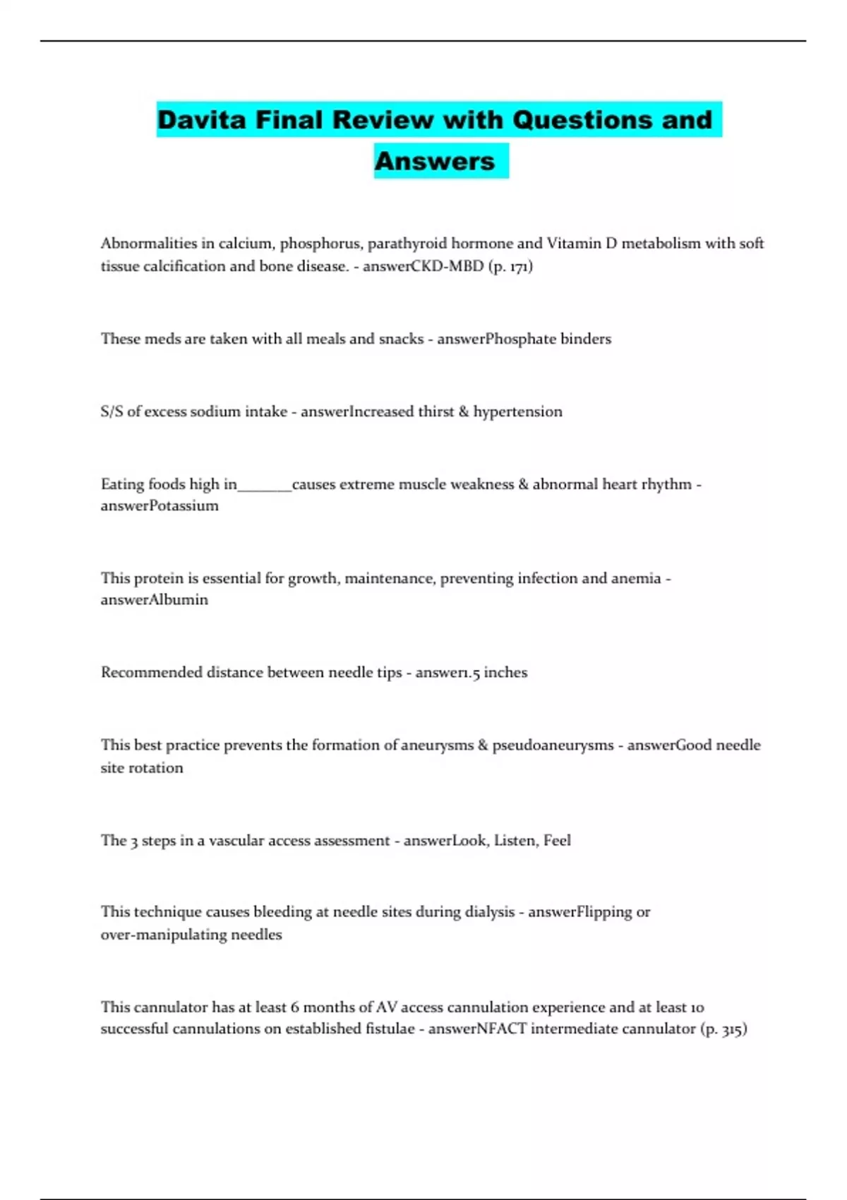 Abnormalities in calcium, phosphorus, parathyroid hormone and Vitamin D metabolism with soft tissue calcification and bone disease. - answerCKD-MBD (p. 171) These meds are taken with all meals and snacks - answerPhosphate binders S/S of excess sodium intake - answerIncreased thirst & hypertension Eating foods high in_______causes extreme muscle weakness & abnormal heart rhythm - answerPotassium This protein is essential for growth, maintenance, preventing infection and anemia - answerAlbumin Recommended distance between needle tips - answer1.5 inches This best practice prevents the formation of aneurysms & pseudoaneurysms - answerGood needle site rotation The 3 steps in a vascular access assessment - answerLook, Listen, Feel This technique causes bleeding at needle sites during dialysis - answerFlipping or over-manipulating needles This cannulator has at least 6 months of AV access cannulation experience and at least 10 successful cannulations on established fistulae - answerNFACT intermediate cannulator (p. 315)
