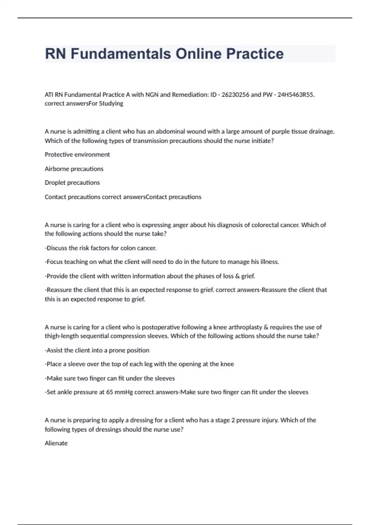 ATI RN Fundamental Practice A with NGN and Remediation: ID - and PW - 24H5463R55. correct answersFor Studying A nurse is admitting a client who has an abdominal wound with a large amount of purple tissue drainage. Which of the following types of transmission precautions should the nurse initiate? Protective environment Airborne precautions Droplet precautions Contact precautions correct answersContact precautions A nurse is caring for a client who is expressing anger about his diagnosis of colorectal cancer. Which of the following actions should the nurse take? -Discuss the risk factors for colon cancer. -Focus teaching on what the client will need to do in the future to manage his illness. -Provide the client with written information about the phases of loss & grief. -Reassure the client that this is an expected response to grief. correct answers-Reassure the client that this is an expected response to grief. A nurse is caring for a client who is postoperative following a knee arthroplasty & requires the use of thigh-length sequential compression sleeves. Which of the following actions should the nurse take? -Assist the client into a prone position -Place a sleeve over the top of each leg with the opening at the knee -Make sure two finger can fit under the sleeves -Set ankle pressure at 65 mmHg correct answers-Make sure two finger can fit under the sleeves A nurse is preparing to apply a dressing for a client who has a stage 2 pressure injury. Which of the following types of dressings should the nurse use? Alienate