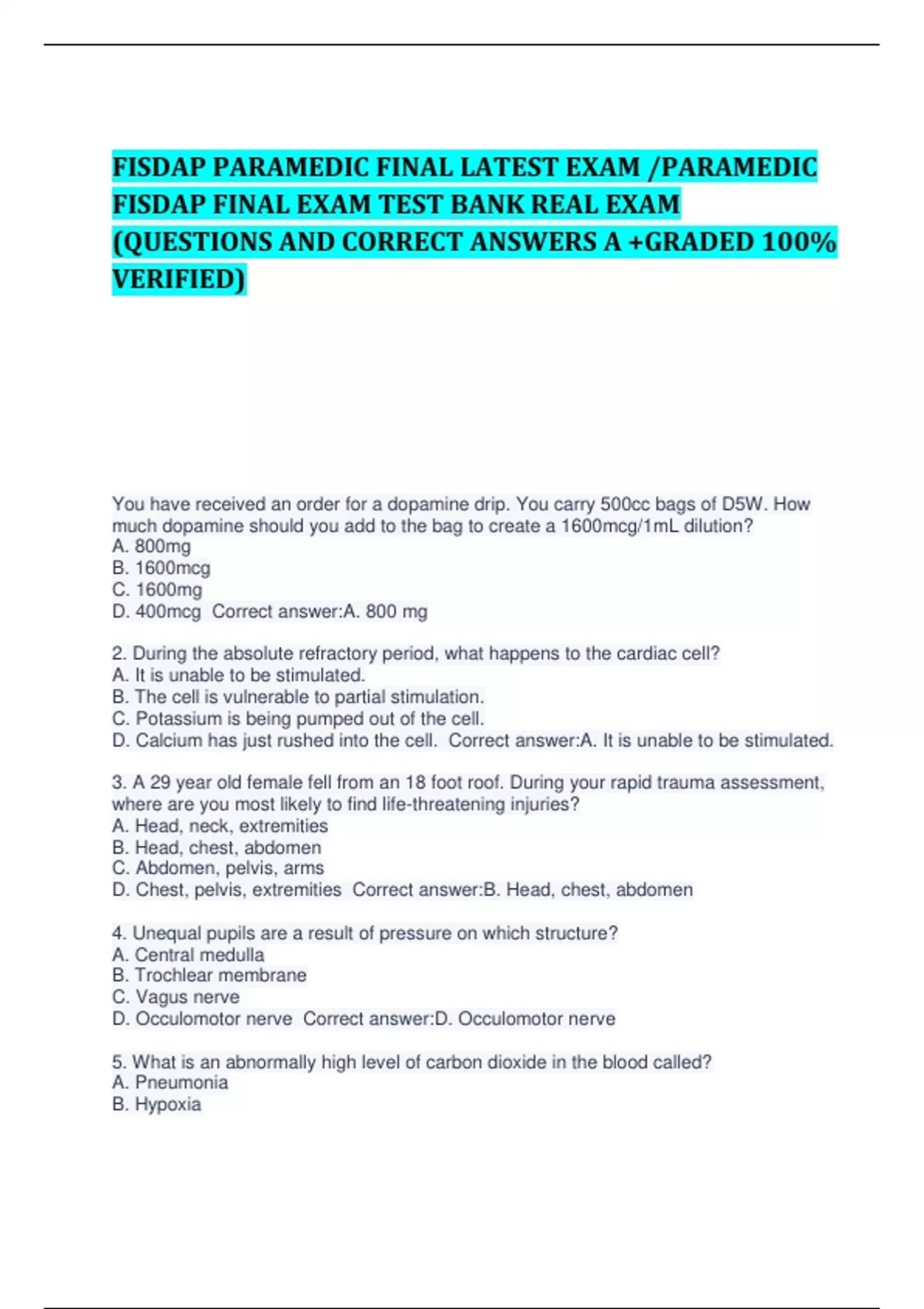 FISDAP PARAMEDIC FINAL LATEST EXAM /PARAMEDIC FISDAP FINAL EXAM TEST BANK REAL EXAM (QUESTIONS AND CORRECT ANSWERS A +GRADED 100% VERIFIED) You have received an order for a dopamine drip. You carry 500cc bags of D5W. How much dopamine should you add to the bag to create a 1600mcg/1mL dilution? A. 800mg B. 1600mcg C. 1600mg D. 400mcg Correct answer:A. 800 mg 2. During the absolute refractory period, what happens to the cardiac cell? A. It is unable to be stimulated. B. The cell is vulnerable to partial stimulation. C. Potassium is being pumped out of the cell. D. Calcium has just rushed into the cell. Correct answer:A. It is unable to be stimulated. 3. A 29 year old female fell from an 18 foot roof. During your rapid trauma assessment, where are you most likely to find life-threatening injuries? A. Head, neck, extremities B. Head, chest, abdomen C. Abdomen, pelvis, arms D. Chest, pelvis, extremities Correct answer:B. Head, chest, abdomen 4. Unequal pupils are a result of pressure on which structure? A. Central medulla B. Trochlear membrane C. Vagus nerve D. Occulomotor nerve Correct answer:D. Occulomotor nerve 5. What is an abnormally high level of carbon dioxide in the blood called? A. Pneumonia B. Hypoxia C. Hypercapnia D. Emphysema Correct answer:C. Hypercapnia 6. What is oxygen deficiency in the body called? A. Hypercarbia B. Hyperoxia C. Hypoxia D. Hypoxemia Correct answer:C. Hypoxia 7. What is your initial priority at a trench collapse? A. Establishing medical command B. Maintaining control of the crowd C. Preventing a secondary collapse D. Protecting the patient's airway Correct answer:A. Establishing medical command 8. A 23 year old male complains of neck stiffness and flu symptoms for the past few days. He also describes a high fever with a severe headache, dizziness and blurred vision. What should you suspect? A. Hemorrhagic stroke B. Migraine C. Meningitis D. Influenza Correct answer:C. Meningitis 9. What causes an emphysema patient to have a pink appearance? A. Elevated PCO2 level B. Polycythemia C. Anemia D. Elevated PO2 level Correct answer:B. Polycythemia 10. Which of the following is a musical, squeaking or whistling sound heard in inspiration and expiration while auscultating lung fields? A. Wheezing B. Snoring C. Stridor D. Gurgling Correct answer:A. Wheezing 11. You are treating a 82 year old male in hypovolemic shock. In order to increase their blood pressure you should administer: A. 0.45% NaCl via IV B. isotonic fluids orally C. dextrose 5% in water via IO D. isotonic crystalloid via IV Correct answer:D. isotonic crystalloid via IV 12. A 35 year old man is pulseless and apneic. He was found in a lake after falling through the ice. His wife says he left the house 3 hours ago. His is cold and rigid. What should you do? A. Perform chest compressions B. Begin active rewarming techniques C. Obtain IO access and administer a warm fluid bolus D. Contact the medical examiner Correct answer:A. Perform chest compressions 13. What does a pulsating mass in the abdomen suggest? A. Abdominal aortic aneurysm B. Perforated ulcer C. Hernia D. Ruptured ectopic pregnancy Correct answer:A. Abdominal aortic aneurysm 14. What is the safest and most effective landing pattern for a helicopter? A. At a slight angle like that of a jet B. Nose of the helicopter pointing up with a tail wind C. Straight up and down in a vertical motion D. Nose of the helicopter pointing down with a slow descent Correct answer:A. At a slight angle like that of a jet 15. During inspiration, what happens to blood flow in the thoracic cavity? A. afterload increases B. blood flow increases to the right atrium C. blood flow through the vena cava is reduced D. pressure in the aorta increases Correct answer:B. blood flow increases to the right atrium 16. What is the period of the cardiac cycle when stimulation will not produce any depolarization? A. Impulse refractory period B. Absolute refractory period C. Relative refractory period D. Transient refractory period Correct answer:B. Absolute refractory period 17. While treating a 56 year old male for chest pain, you note a few PVCs on the monitor. You print a strip and measure the distance between the normal beats on each side of the PVC. The normal sinus rhythm continues on both sides of the PVC as if it were the normal beat, even though the PVC happens sooner than the sinus beat would have. The pause after the PVC would be: A. A sign of continued ischemia B. A compensatory pause C. A non-compensatory pause D. Reynaud's Pause Correct answer:B. A compensatory pause 18. A 5 month old male is in cardiac arrest. Resuscitation efforts have been ongoing for 30 minutes. His heart rhythm is and has been asystolic throughout treatment. What should you do? A. Continue CPR and ACLS drugs for another thirty minutes B. Begin termination of resuscitative efforts C. Report suspected child abuse to the police D. Wait for the coroner before stopping CPR Correct answer:B. Begin termination of resuscitative efforts 19. Which of the following requires ATP? A. Active transport B. Osmosis C. Diffusion D. Facilitated diffusion Correct answer:A. Active transport 20. A 52 year old male was the unrestrained driver in a frontal impact car crash. Which of the following injuries would lead you to believe the patient traveled "up and over" the dashboard instead of "down and under"? A. Patellar dislocation B. Cervical spine fracture C. Ruptured diaphragm D. Flail chest Correct answer:C. Ruptured diaphragm 21. How does the blood flow through the heart? A. Right ventricle to right atrium to lungs to left ventricle to left atrium B. Right atrium to right ventricle to lungs to left atrium to left ventricle C. Left ventricle to left atrium to lungs to right ventricle to right atrium D. Left atrium to left ventricle to lungs to right atrium to right ventricle Correct answer:B. Right atrium to right ventricle to lungs to left atrium to left ventricle 22. As soon as an infant's head is delivered, what should