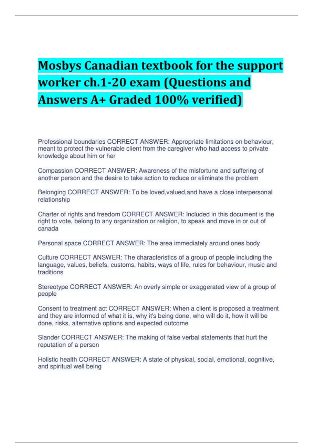Mosbys Canadian textbook for the support worker ch.1-20 exam (Questions and Answers A+ Graded 100% verified) Professional boundaries CORRECT ANSWER: Appropriate limitations on behaviour, meant to protect the vulnerable client from the caregiver who had access to private knowledge about him or her Compassion CORRECT ANSWER: Awareness of the misfortune and suffering of another person and the desire to take action to reduce or eliminate the problem Belonging CORRECT ANSWER: To be loved,valued,and have a close interpersonal relationship Charter of rights and freedom CORRECT ANSWER: Included in this document is the right to vote, belong to any organization or religion, to speak and move in or out of canada Personal space CORRECT ANSWER: The area immediately around ones body Culture CORRECT ANSWER: The characteristics of a group of people including the language, values, beliefs, customs, habits, ways of life, rules for behaviour, music and traditions Stereotype CORRECT ANSWER: An overly simple or exaggerated view of a group of people Consent to treatment act CORRECT ANSWER: When a client is proposed a treatment and they are informed of what it is, why it's being done, who will do it, how it will be done, risks, alternative options and expected outcome Slander CORRECT ANSWER: The making of false verbal statements that hurt the reputation of a person Holistic health CORRECT ANSWER: A state of physical, social, emotional, cognitive, and spiritual well being The PSW must do THIS before touching the client for any reason CORRECT ANSWER: Ask for consent Stigma CORRECT ANSWER: Social disgrace associated with a particular circumstance, quality, or person that causes one to feel shame or embarrassment Substitute Decision Maker CORRECT ANSWER: This person is authorized to make health care decisions on behalf of a living person who is unable to do so Harassment CORRECT ANSWER: This term could include being exposed to inappropriate sexual gestures or comments or being yelled at or pushed by either staff or clients Primary caregiver CORRECT ANSWER: Usually family or a close friend who assumes responsibilities of caring for a dependent person usually in the persons home Interdependence CORRECT ANSWER: The state of relying on one another Touch CORRECT ANSWER: This conveys caring and affection Confidentiality CORRECT ANSWER: Being placed in trust with regards to guarding personal and private information Optimal health CORRECT ANSWER: The achievement of the best possible health in all 5 dimensions of ones life Sympathy CORRECT ANSWER: Feeling compassion for or understanding the difficulties of another person Respect CORRECT ANSWER: The acceptance and regard for another person Negligence CORRECT ANSWER: When a PSW fails to act in a careful and competent manner Prejudice CORRECT ANSWER: An attitude that forms the opinion about a person based on his or her membership in a group Dignity CORRECT ANSWER: A feeling of worth, value and respect This is what a PSW should do when a client has a difficult time falling asleep CORRECT ANSWER: Ask about night time rituals Charter CORRECT ANSWER: Part of the Canadian constitution that lists the basic rights and freedoms to which all Canadians are entitled This is what a PSW should ask when a client stated they are in pain CORRECT ANSWER: Ask intensity, duration, location then report to supervisor 3 important aspects of the charter CORRECT ANSWER: Right to vote, right to belong to any organization or religion, right to speak and to move in and out of canada written consent CORRECT ANSWER: We are never responsible for obtaining written consent Maslow's Hierarchy of Needs CORRECT ANSWER: physiological, safety, love/belonging, esteem, self-actualization 4 Principles of Health Care Ethics CORRECT ANSWER: autonomy, beneficence, non-maleficence, justice Autonomy CORRECT ANSWER: (Self determination) having free choice involving decisions that affects ones life Beneficence CORRECT ANSWER: (Doing good) doing or promoting good, principles central to your work Non-maleficence CORRECT ANSWER: do no harm PSWs are accountable to CORRECT ANSWER: Employer, supervisor, client Occupational Therapist (OT) CORRECT ANSWER: Assists persons to learn or retain skills needed to perform activities of daily living (ADL) Physical Therapist (PT) CORRECT ANSWER: Assists person with musculoskeletal problems; focuses on restoring function and preventing disability from illness or injury social worker CORRECT ANSWER: helps patients and families with social, emotional, and environmental issues affecting illness and recovery Are the resident and family part of the team CORRECT ANSWER: Yes the resident and family are part of the team Delegation CORRECT ANSWER: (Transfer of function) is a process by which a nurse authorized another health care provider to perform certain tasks; If the controlled act is determined to be a routine ADL for a particular client delegation can occur ADL CORRECT ANSWER: Activity of daily living- dressing, personal hygiene, mobility, feeding and toileting Who can delegate to you CORRECT ANSWER: Only a nurse can delegate to you Paraplegia CORRECT ANSWER: Waist down Hemiplegia CORRECT ANSWER: One side Quadraplegia CORRECT ANSWER: All limbs and trunk ( neck down) DIPPS CORRECT ANSWER: Dignity, independence, preferences, privacy, safety Examples of harassment CORRECT ANSWER: Being exposed to inappropriate sexual gestures by client at work Verbal or physical abuse by staff to another staff such as being pushed Notice nude pin up calendar in men's washroom Notice coworker watching porn on break We're told how colour blue looks good on you or how lovely your uniform is What do you do if experience harassment CORRECT ANSWER: Ask the person to STOP and report to your supervisor immediately Case study mrs c- name 2 ways she is trying to meet her need for independence CORRECT ANSWER: By changing her blouse multiple times, her strict housekeeping routine Mrs c case study- What factors could influenc