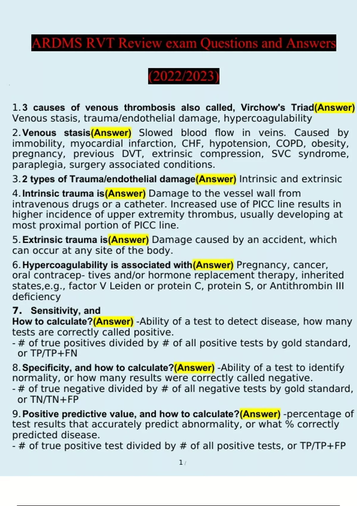 1.3 causes of venous thrombosis also called, Virchow's Triad(Answer) Venous stasis, trauma/endothelial damage, hypercoagulability 2.Venous stasis(Answer) Slowed blood flow in veins. Caused by immobility, myocardial infarction, CHF, hypotension, COPD, obesity, pregnancy, previous DVT, extrinsic compression, SVC syndrome, paraplegia, surgery associated conditions. 3.2 types of Trauma/endothelial damage(Answer) Intrinsic and extrinsic 4.Intrinsic trauma is(Answer) Damage to the vessel wall from intravenous drugs or a catheter. Increased use of PICC line results in higher incidence of upper extremity thrombus, usually developing at most proximal portion of PICC line. 5.Extrinsic trauma is(Answer) Damage caused by an accident, which can occur at any site of the body.