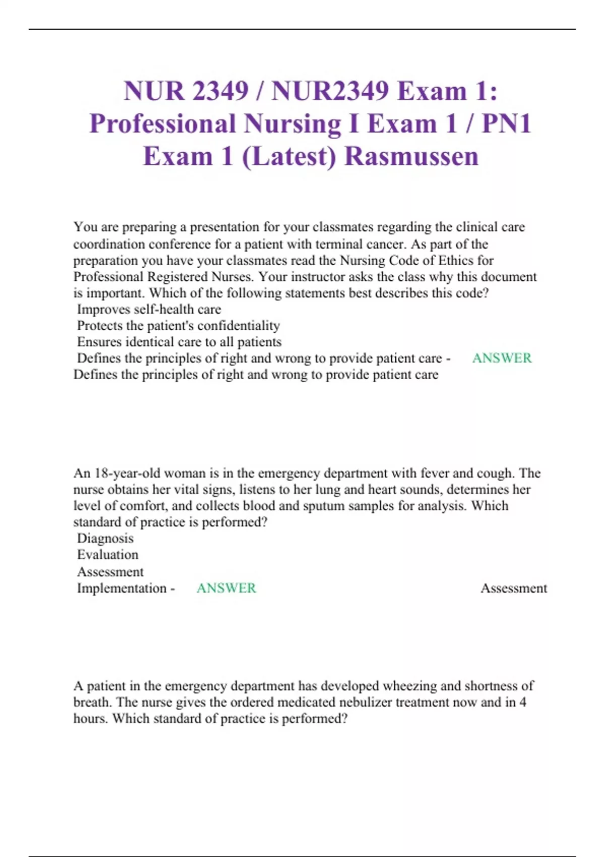 NUR 2349 / NUR2349 Exam 1: Professional Nursing I Exam 1 / PN1 Exam 1 (Latest) Rasmussen You are preparing a presentation for your classmates regarding the clinical care coordination conference for a patient with terminal cancer. As part of the preparation you have your classmates read the Nursing Code of Ethics for Professional Registered Nurses. Your instructor asks the class why this document is important. Which of the following statements best describes this code? Improves self-health care Protects the patient's confidentiality Ensures identical care to all patients Defines the principles of right and wrong to provide patient care - ANSWER Defines the principles of right and wrong to provide patient care An 18-year-old woman is in the emergency department with fever and cough. The nurse obtains her vital signs, listens to her lung and heart sounds, determines her level of comfort, and collects blood and sputum samples for analysis. Which standard of practice is performed? Diagnosis Evaluation Assessment Implementation - ANSWER Assessment A patient in the emergency department has developed wheezing and shortness of breath. The nurse gives the ordered medicated nebulizer treatment now and in 4 hours. Which standard of practice is performed? Planning Evaluation Assessment Implementation - ANSWER Implementation A nurse is caring for a patient with end-stage lung disease. The patient wants to go home on oxygen and be comfortable. The family wants the patient to have a new surgical procedure. The nurse explains the risk and benefits of the surgery to the family and discusses the patient's wishes with them. The nurse is acting as the patient's: Educator Advocate Caregiver Case manager - ANSWER Advocate