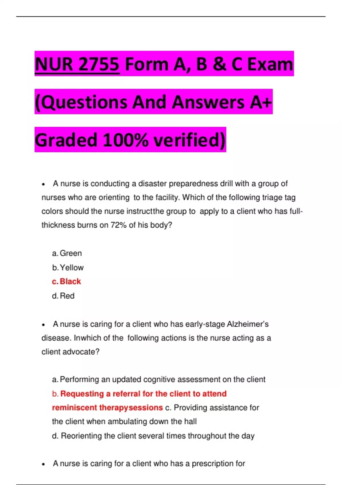 NUR 2755 Form A, B & C Exam (Questions And Answers A+ Graded 100% verified) • A nurse is conducting a disaster preparedness drill with a group of nurses who are orienting to the facility. Which of the following triage tag colors should the nurse instruct the group to apply to a client who has full-thickness burns on 72% of his body? a. Green b. Yellow c. Black d. Red • A nurse is caring for a client who has early-stage Alzheimer’s disease. In which of the following actions is the nurse acting as a client advocate? a. Performing an updated cognitive assessment on the client b. Requesting a referral for the client to attend reminiscent therapy sessions c. Providing assistance for the client when ambulating down the hall d. Reorienting the client several times throughout the day • A nurse is caring for a client who has a prescription for transcutaneous electrical nerve stimulation (TENS). Which of the following members of the interdisciplinary team should the nurse contact for assistance? a. Occupational therapist b. Respiratory therapist c. Pharmacist d. Physical therapist • A nurse is caring for a client who has a pressure ulcer on the coccyx. Which of the following findings indicates the need for a referral to a wound care specialist? a. Minimal signs of induration at the wound edges b. Presence of granulated tissue over the wound c. Presence of slough in the wound bed d. Epithelialization noted in areas of tissue loss • A nurse is planning discharge for a client who has a new diagnosis of COPD and lives alone. Which of the following actions is the nurse’s priority? a. Suggest participating in a community support group b. Provide printed materials for new prescriptions c. Set up appointments for in-home physical therapy d. Request a referral for a home safety assessment • A charge nurse witnesses an assistive personnel (AP) giving an oral medication to a client who has dysphagia. Upon questioning, the AP states that a nurse poured the medication into a cup and asked the AP to give it to the client. Which of the following actions should the charge nurse take first? a. Reinforce facility policy regarding medication administration with the AP b. Discuss the situation with the nurse who poured the medication c. Complete the appropriate documentation of the incident d. Auscultate the client’s breath sounds • A nurse is observing assistive personnel (AP) administer a 0.9% sodium chloride enema to an adult client. For which of the following actions by the AP should the nurse intervene? a. Administers the solution at room temperature b. Positions the client on her left side with knees flexed c. Inserts the tubing 8 cm (3.1 in) into the rectum d. Points tubing in the direction of the umbilicus during insertion • A nurse is preparing to transfer a client to the radiology department using a wheelchair. Which of the following actions should the nurse take? a. Leave a transfer belt in place until the client returns from radiology b. Keep the footplates lowered throughout the transfer process c. Push the wheelchair into the elevator, large wheels last d. Test the locks on both wheels of the chair prior to transfer • A nurse manager is preparing to institute a new system for scheduling staff. Several nurses have verbalized concern over the possible changes that will occur. Which of the following is an appropriate method to facilitate the adoption of the new scheduling system? a. Introduce the new scheduling system by describing how it will save the institution money b. Offer to reassign staff who do not support the change to another unit c. Identify nurses who accept the change to help influence other staff nurses - check d. Provide a brief overview of the new scheduling system immediately before its implementation • A nurse is planning discharge for a client following a hip arthroplasty. The client tells the nurse that she lives alone. Which of the following actions should the nurse take first? a. Report the information to the provider b. Contact the case manager for a consultation c. Determine the specific needs of the client d. Document the client’s living situation in the medical record • A charge nurse is making assignments for a medical-surgical unit. Which of the following clients is appropriate to assign to a licensed practical nurse? a. A client who has emphysema and has an oxygen saturation level of 92% b. A client who is scheduled to start oral nutrition 2 days after stroke c. A client who is scheduled to receive 2 units of RBCs following a hip replacement d. A client who has dehydration and is being admitted from the emergency department • A nurse enters a client’s room and identifies that the client is receiving too much IV fluid because the IV pump is not working properly. Which of the following actions should the nurse take first? a. Place a faulty equipment tag on the pump b. Auscultate the client’s lungs c. Complete an incident report d. Notify the provider • A nurse is discussing advance directives with a client. Which of the following statements by the client indicates an understanding of advance directives? a. I know I have the right to determine if I remain on a breathing machine b. I know I’ll need a lawyer to change them later, so I want to get them right c. I trust my doctor, so I’m going to leave it to him to do what’s best for me d. By naming a health care proxy, I give up the right to make my own medical decisions • A nurse manager is receiving report and is faced with the following situations that require intervention. Which of the following should the nurse manager address first? a. Two nurses had a heated disagreement about a scheduling issue b. No transport assistance is available to take a client to physical therapy c. Three staff members have called to say they will be absent d. A client is refusing care from assistive personnel of the opposite gender • A nurse is considering placing wrist restraints on a client who has co