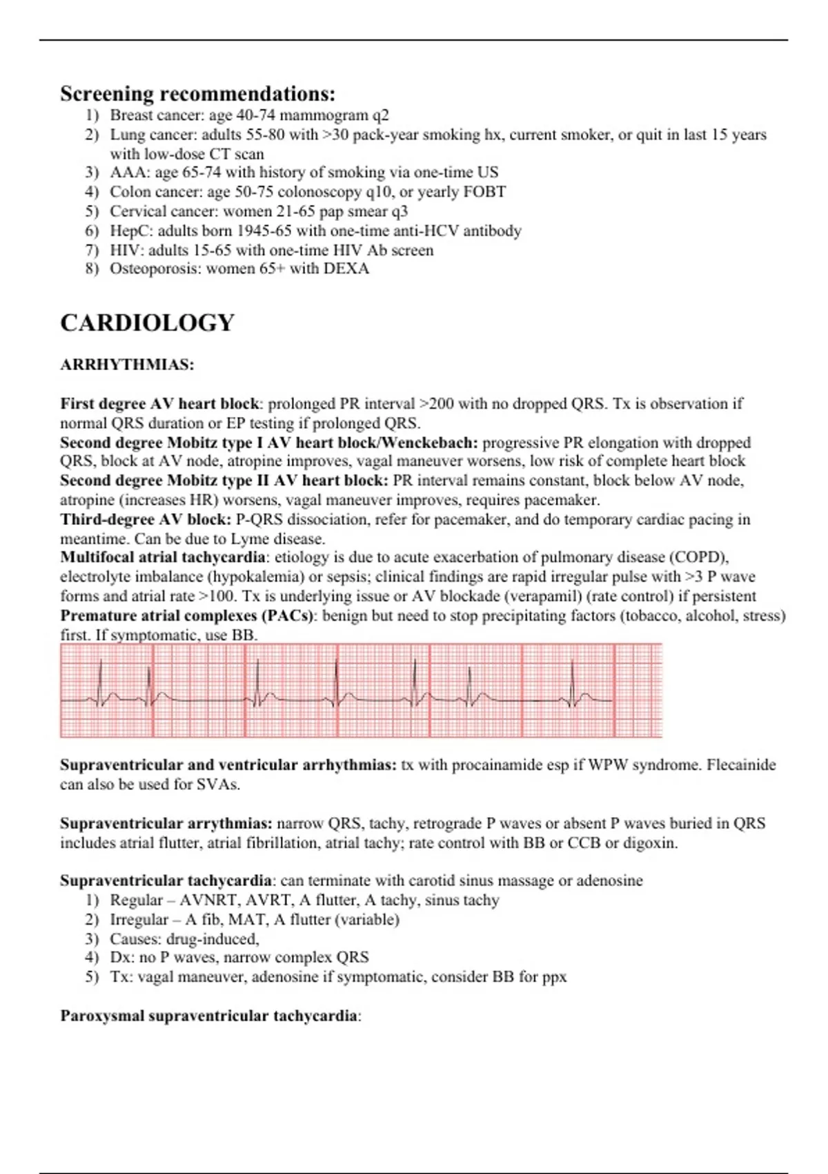 Screening recommendations: 1) Breast cancer: age 40-74 mammogram q2 2) Lung cancer: adults 55-80 with >30 pack-year smoking hx, current smoker, or quit in last 15 years with low-dose CT scan 3) AAA: age 65-74 with history of smoking via one-time US 4) Colon cancer: age 50-75 colonoscopy q10, or yearly FOBT 5) Cervical cancer: women 21-65 pap smear q3 6) HepC: adults born 1945-65 with one-time anti-HCV antibody 7) HIV: adults 15-65 with one-time HIV Ab screen 8) Osteoporosis: women 65+ with DEXA CARDIOLOGY ARRHYTHMIAS: First degree AV heart block: prolonged PR interval >200 with no dropped QRS. Tx is observation if normal QRS duration or EP testing if prolonged QRS. Second degree Mobitz type I AV heart block/Wenckebach: progressive PR elongation with dropped QRS, block at AV node, atropine improves, vagal maneuver worsens, low risk of complete heart block Second degree Mobitz type II AV heart block: PR interval remains constant, block below AV node, atropine (increases HR) worsens, vagal maneuver improves, requires pacemaker. Third-degree AV block: P-QRS dissociation, refer for pacemaker, and do temporary cardiac pacing in meantime. Can be due to Lyme disease. Multifocal atrial tachycardia: etiology is due to acute exacerbation of pulmonary disease (COPD), electrolyte imbalance (hypokalemia) or sepsis; clinical findings are rapid irregular pulse with >3 P wave forms and atrial rate >100. Tx is underlying issue or AV blockade (verapamil) (rate control) if persistent Premature atrial complexes (PACs): benign but need to stop precipitating factors (tobacco, alcohol, stress) first. If symptomatic, use BB. Supraventricular and ventricular arrhythmias: tx with procainamide esp if WPW syndrome. Flecainide can also be used for SVAs. Supraventricular arrythmias: narrow QRS, tachy, retrograde P waves or absent P waves buried in QRS includes atrial flutter, atrial fibrillation, atrial tachy; rate control with BB or CCB or digoxin. Supraventricular tachycardia: can terminate with carotid sinus massage or adenosine 1) Regular – AVNRT, AVRT, A flutter, A tachy, sinus tachy 2) Irregular – A fib, MAT, A flutter (variable) 3) Causes: drug-induced, 4) Dx: no P waves, narrow complex QRS 5) Tx: vagal maneuver, adenosine if symptomatic, consider BB for ppx Paroxysmal supraventricular tachycardia: 1) Most commonly AVNRT and palpitations is most common presentation. AVNRT is due to a fast and slow pathway that leads to reentry mechanism. Vagal maneuvers (carotid sinus massage, cold-water immersion, Valsalva) increase parasympathetic tone and slows down AV node conduction, terminating AVNRT. 2) Can also be due to AVRT (WPW) or paroxysmal atrial tachycardia. Ventricular fibrillation: chaotic, irregular waveforms with no identifiable P waves, QRS, or T waves. Tx is shock (defibrillation). V fib most common arrhythmia peri-MI responsible for cardiac arrest. Ventricular tachycardia: EKG shows regular, wide-complex tachycardia and can alter jugular venous pulsations (Cannon A waves). Due to reentry in ventricular muscle. Can be due to loop diuretics. Tx with amiodarone/procainamide/lidocaine if stable or synchronized cardioversion if unstable. Torsades de Pointes (TdP): twisting of points, due to acquired QT prolongation, hypokalemia, hypomagnesemia, hypocalcemia 1) Causes: a. Diuretics, macrolides, fluoroquinolones, amiodarone, flecainide, SSRI, haloperidol, ondansetron, methadone 2) Tx: a. Stable – IV magnesium b. Unstable – defibrillation Causes of QT prolongation 1) Electrolytes: hypocalcemia, hypokalemia, hypomagnesemia 2) Medications: a. antiarrhythmics b. antibiotics c. psychotropics, d. opioids (methadone, oxycodone) e. antiemetics 2) Inherited a. Romano-Ward syndrome (auto dominant) b. Jervell & Lange-Nielsen syndrome (auto recessive) Atrial fibrillation: irregular rhythm and absent P waves. Foci comes from pulmonary veins. Treat rate with BB or CCB if stable to get under 110 bpm. If want to tx rhythm cause unstable, then use TTE to make sure no clots and then cardiovert (synchronized) or use flecainide (class 1C drug with slowest rate of binding and dissociation so has “use dependence” at faster heart rates. Widens QRS). CHADS-VASC score determines AC indication (warfarin, apixaban). Afib with mitral stenosis requires warfarin AC regardless of score. Lone Afib is not treated with anything. 1) Causes of Afib include: a. mitral stenosis, mitral regurg, hypertensive heart disease (most common), CAD, hypertrophic cardiomyopathy, ASD, post cardiac surgery, b. Hyperthyroidism is common cause of sudden-onset Afib so need TSH and T4 workup; obesity, alcohol abuse, and drugs (cocaine, theophylline, amphetamines) c. OSA, PE, COPD, acute hypoxia 2) Tx: a. Rate control (ABCD) – amiodarone, BB, CCB, digoxin Atrial Flutter: back-to-back atrial depolarizations that show sawtooth pattern. Tx same as afib (BB, CCB, and anticoagulation) Sinus bradycardia: symptoms are syncope, lightheadedness, and fatigue. Will have hypotension and pulse <50. Tx is oxygen for hypoxemia; if no hypotension, AMS, chest pain, or failure à observe. If have those, give atropine (increases HR). If no response, do transcutaneous pacing or IV dopamine or IV epi. If no response, transvenous pacing. Wolff-Parkinson-White syndrome: paroxysmal supraventricular tachycardia (AVRT) due to accessory pathway (bundle of Kent) that goes from atrium to ventricle bypassing AV node. EKG shows delta waves (preexcitation impulse), short PR interval, ST/T wave abnormalities. Atrial fib can occur in 30%. Can lead to V fib and reentrant tachycardia. Tx with cardioversion if unstable and with procainamide (class IA)/amiodarone if stable. Do not block AV node (avoid carotid sinus massage, BB) since will worsen WPW into atrial fib. AVNRT – reentrant pathway is localized to AV node and goes around and around. AVRT – reentrant is not in AV node (Ex: WPW) Arrythmias: 1) Holter monitoring is for catching intermittent arrhythmias outpatient. MYOCARDIAL INFAR
