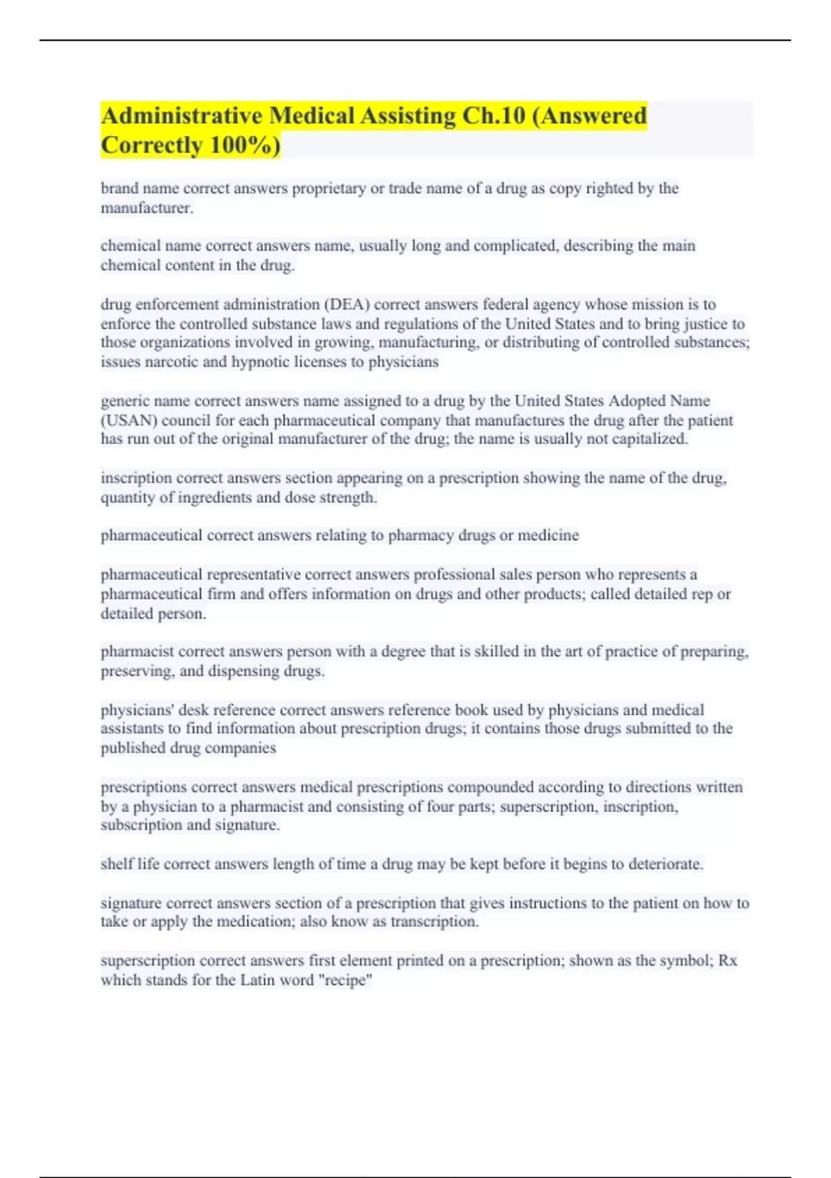 brand name correct answers proprietary or trade name of a drug as copy righted by the manufacturer. chemical name correct answers name, usually long and complicated, describing the main chemical content in the drug. drug enforcement administration (DEA) correct answers federal agency whose mission is to enforce the controlled substance laws and regulations of the United States and to bring justice to those organizations involved in growing, manufacturing, or distributing of controlled substances; issues narcotic and hypnotic licenses to physicians generic name correct answers name assigned to a drug by the United States Adopted Name (USAN) council for each pharmaceutical company that manufactures the drug after the patient has run out of the original manufacturer of the drug; the name is usually not capitalized. inscription correct answers section appearing on a prescription showing the name of the drug, quantity of ingredients and dose strength. pharmaceutical correct answers relating to pharmacy drugs or medicine pharmaceutical representative correct answers professional sales person who represents a pharmaceutical firm and offers information on drugs and other products; called detailed rep or detailed person. pharmacist correct answers person with a degree that is skilled in the art of practice of preparing, preserving, and dispensing drugs. physicians' desk reference correct answers reference book used by physicians and medical assistants to find information about prescription drugs; it contains those drugs submitted to the published drug companies prescriptions correct answers medical prescriptions compounded according to directions written by a physician to a pharmacist and consisting of four parts; superscription, inscription, subscription and signature. shelf life correct answers length of time a drug may be kept before it begins to deteriorate. signature correct answers section of a prescription that gives instructions to the patient on how to take or apply the medication; also know as transcription. superscription correct answers first element printed on a prescription; shown as the symbol; Rx which stands for the Latin word "recipe"