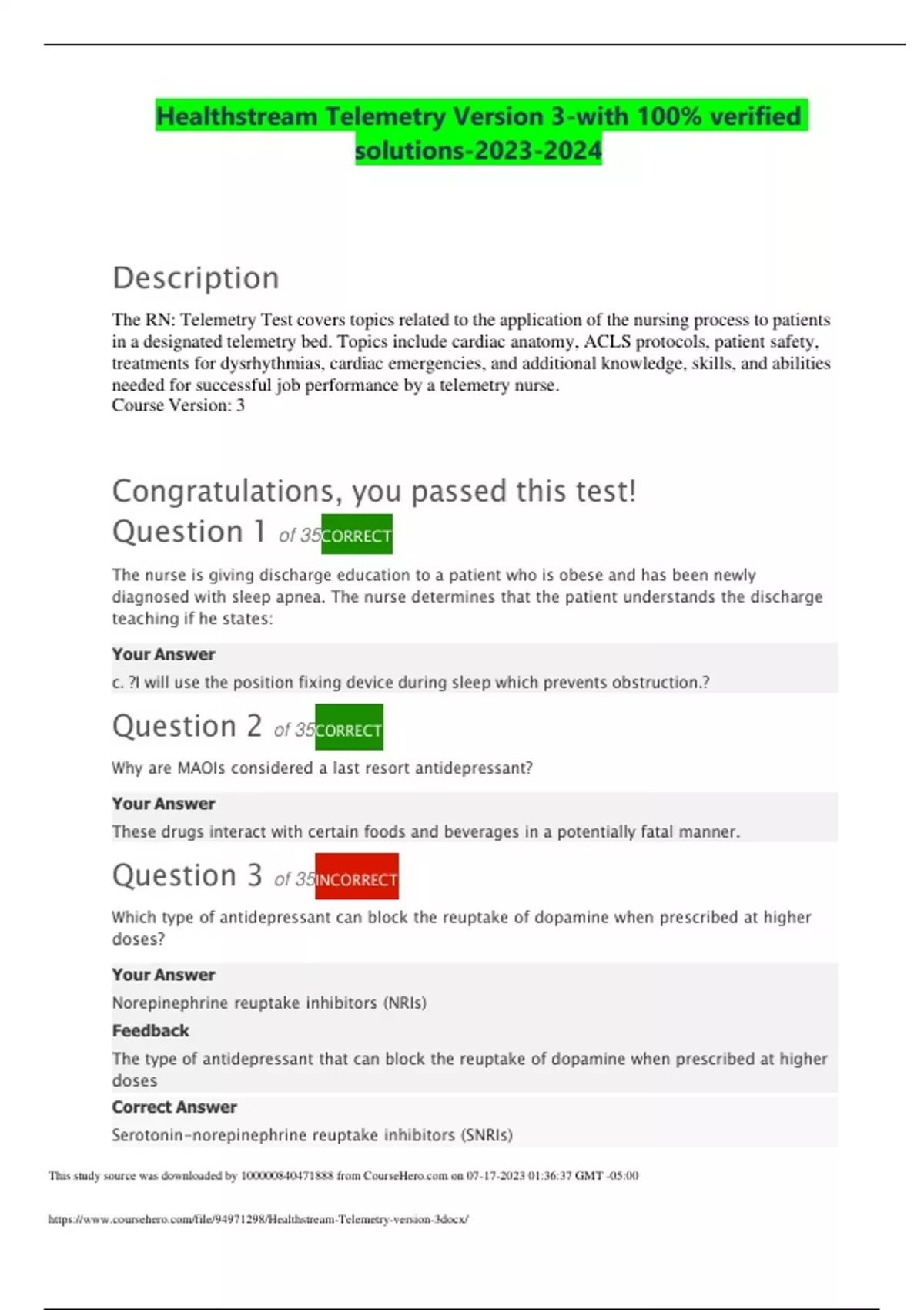 ACTUAL Healthstream Telemetry Version 3-with 100% verified solutions-
