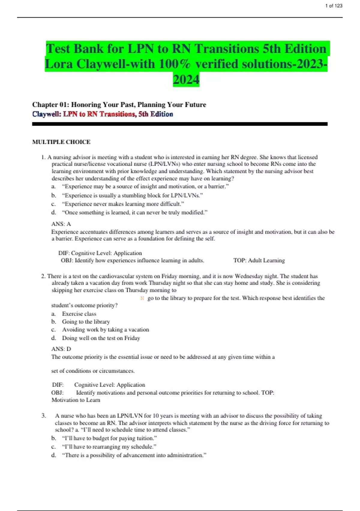 ACTUAL Test Bank for LPN to RN Transitions 5th Edition Lora Claywell-with 100% verified solutions-