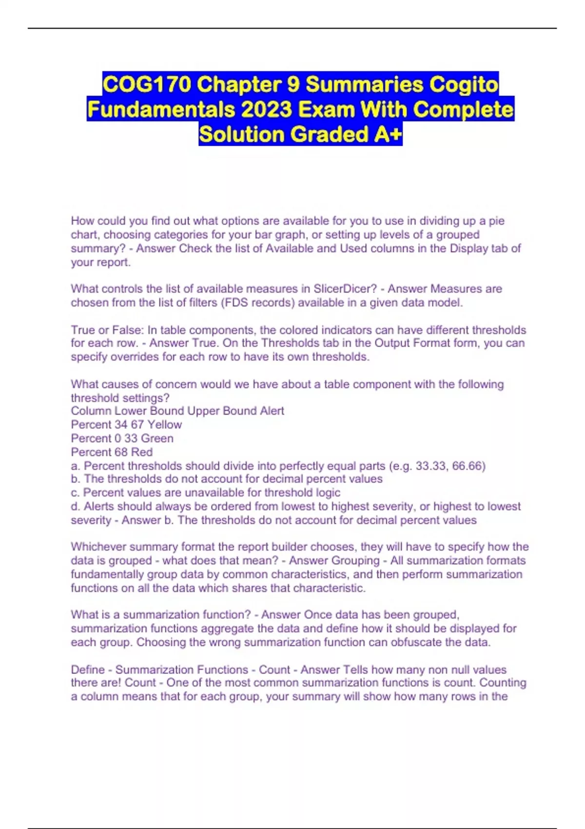 COG170 Chapter 9: Summaries Cogito Fundamentals 100% SOLUTIONS QUESTION AND CORRECT ANSWER How could you find out what options are available for you to use in dividing up a pie chart, choosing categories for your bar graph, or setting up levels of a grouped summary? - ANSWER Check the list of Available and Used columns in the Display tab of your report. What controls the list of available measures in SlicerDicer? - ANSWER Measures are chosen from the list of filters (FDS records) available in a given data model. True or False: In table components, the colored indicators can have different thresholds for each row. - ANSWER True. On the Thresholds tab in the Output Format form, you can specify overrides for each row to have its own thresholds. What causes of concern would we have about a table component with the following threshold settings? Column Lower Bound Upper Bound Alert Percent 34 67 Yellow Percent 0 33 Green Percent 68 Red a. Percent thresholds should divide into perfectly equal parts (e.g. 33.33, 66.66) b. The thresholds do not account for decimal percent values c. Percent values are unavailable for threshold logic d. Alerts should always be ordered from lowest to highest severity, or highest to lowest severity - ANSWER b. The thresholds do not account for decimal percent values Whichever summary format the report builder chooses, they will have to specify how the data is grouped - what does that mean? - ANSWER Grouping - All summarization formats fundamentally group data by common characteristics, and then perform summarization functions on all the data which shares that characteristic. What is a summarization function? - ANSWER Once data has been grouped, summarization functions aggregate the data and define how it should be displayed for each group. Choosing the wrong summarization function can obfuscate the data