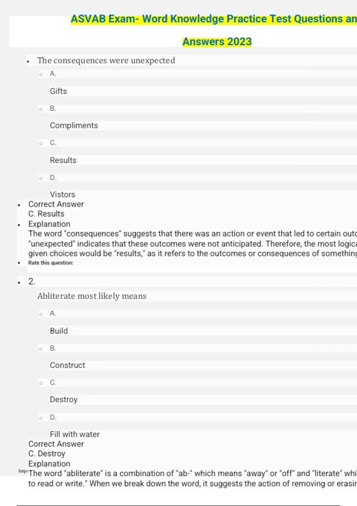 ASVAB Exam- Word Knowledge Practice Test Questions and Answers 2023
