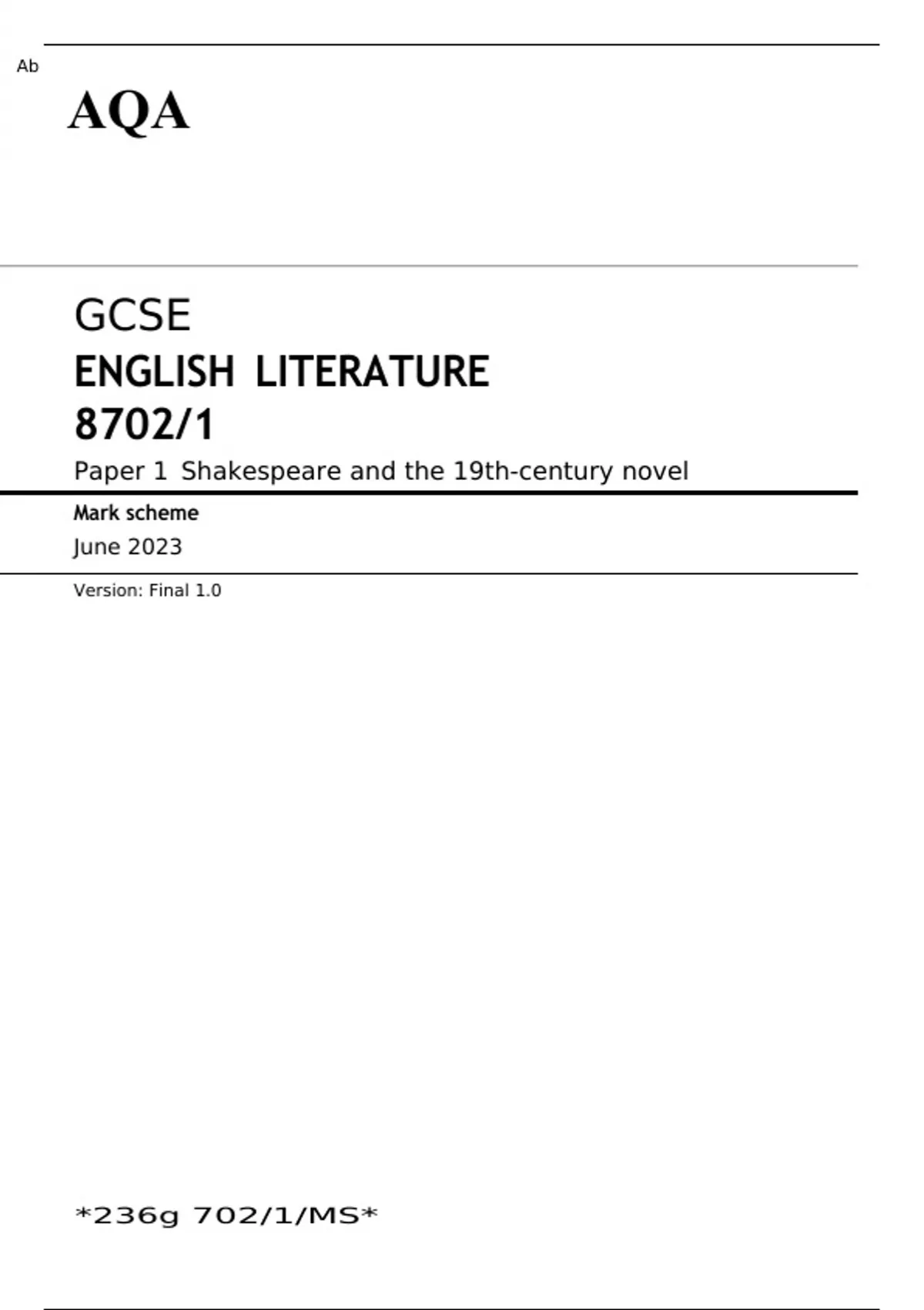 AQA GCSE ENGLISH LITERATURE Paper 1 MARK SCHEME 2023: Shakespeare and the 19th-century novel