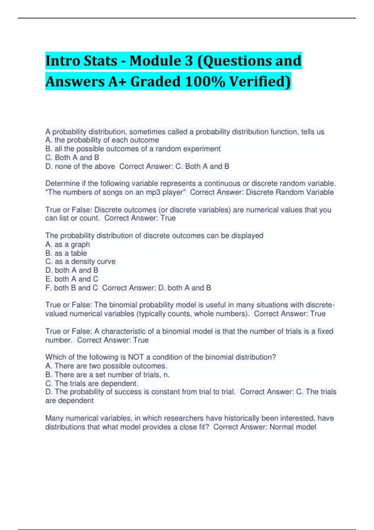 Intro Stats - Module 3 (Questions and Answers A+ Graded 100% Verified) A probability distribution, sometimes called a probability distribution function, tells us A. the probability of each outcome B. all the possible outcomes of a random experiment C. Both A and B D. none of the above Correct Answer: C. Both A and B Determine if the following variable represents a continuous or discrete random variable. "The numbers of songs on an mp3 player" Correct Answer: Discrete Random Variable True or False: Discrete outcomes (or discrete variables) are numerical values that you can list or count. Correct Answer: True The probability distribution of discrete outcomes can be displayed A. as a graph B. as a table C. as a density curve D. both A and B E. both A and C F. both B and C Correct Answer: D. both A and B True or False: The binomial probability model is useful in many situations with discrete-valued numerical variables (typically counts, whole numbers). Correct Answer: True True or False: A characteristic of a binomial model is that the number of trials is a fixed number. Correct Answer: True Which of the following is NOT a condition of the binomial distribution? A. There are two possible outcomes. B. There are a set number of trials, n. C. The trials are dependent. D. The probability of success is constant from trial to trial. Correct Answer: C. The trials are dependent Many numerical variables, in which researchers have historically been interested, have distributions that what model provides a close fit? Correct Answer: Normal model In the Normal curve, if the standard deviation is large, then the normal curve is Correct Answer: Wide and low In the Normal curve, if the standard deviation is small, then the normal curve is Correct Answer: Narrow and tall When you are finding probabilities with normal models, the most helpful step is to A. sketch the curve to represent the normal model B. shade in the region of interest C. label the curve appropriately D. all of the above, in that order Correct Answer: D. all of the above, in that order True or False: The standard Normal model has a mean of 1 and a standard deviation of 0. Correct Answer: False The standard normal model is an important concept because it allows us to find the probabilities of any normal model using Correct Answer: The z-score To convert a value to its z-score, take the data value and Correct Answer: Subtract the mean, then divide by the standard deviation We use the InverseNormal function when we want to find A. A measurement, given the probability B. A measurement, given the percentile C. A measurement, given the left area under the normal curve D. All of the above Correct Answer: D. All of the above TRUE OR FALSE. A sample is a collection of people or objects taken from the population of interest. Correct Answer: True A numerical value that characterizes some aspect of a population is called a Correct Answer: Parameter A numerical characteristic of a sample of data is called a Correct Answer: Statistic TRUE OR FALSE. We use parameters to estimate statistics. Correct Answer: False TRUE OR FALSE. An important difference between parameters and statistics is that parameters are knowable. Correct Answer: False TRUE OR FALSE. Statisticians have developed notation for keeping track of parameters and statistics. In general, Greek characters are used to represent population parameters. Statistics (estimates based on a sample) are represented by English letters. Correct Answer: True In which way(s) can bias (a tendency to produce an untrue value) enter a survey? A. From taking a sample that is not representative of the population B. From asking questions that do not produce a true answer C. From statistics that are naturally biased D. All of the above Correct Answer: D. All of the above TRUE OR FALSE. No matter how many different samples we take, the value of p (the population proportion) changes from sample to sample, but the value of p-hat is always the same. Correct Answer: False The probability distribution of p-hat has a special name: Correct Answer: Sampling distribution TRUE OR FALSE. Bias is measured using the center of the sampling distribution. It is the distance between the center and the population value. Correct Answer: True Which of the following condition(s) on the sample must be met for applying the Central Limit Theorem for estimating proportions in a population? A. Random and independent B. Large sample C. Big population D. All of the above Correct Answer: D. All of the above How can we tell if the sample size is big enough before applying the Central Limit Theorem? (Let n be the sample size and let p-hat be the proportion of the sample having the desired characteristic.) CHOOSE ALL THAT APPLY. A. n(p-hat) has to be less than or = to 10. B. n(p-hat) has to be greater than or = 10 AND n(1 - p-hat) has to be greater than or = to 10. C. There has to be at least 10 success and 10 failures. D. The sample size has to be at least 50. E. The sample size has to be at least 100. Correct Answer: B. n(p-hat) has to be greater than or = 10 AND n(1 - p-hat) has to be greater than or = to 10. C. There has to be at least 10 success and 10 failures. If a sample size is n = 100 and p-hat = 9%, is the sample size large enough to apply the Central Limit Theorem for Sample Proportions? Correct Answer: No