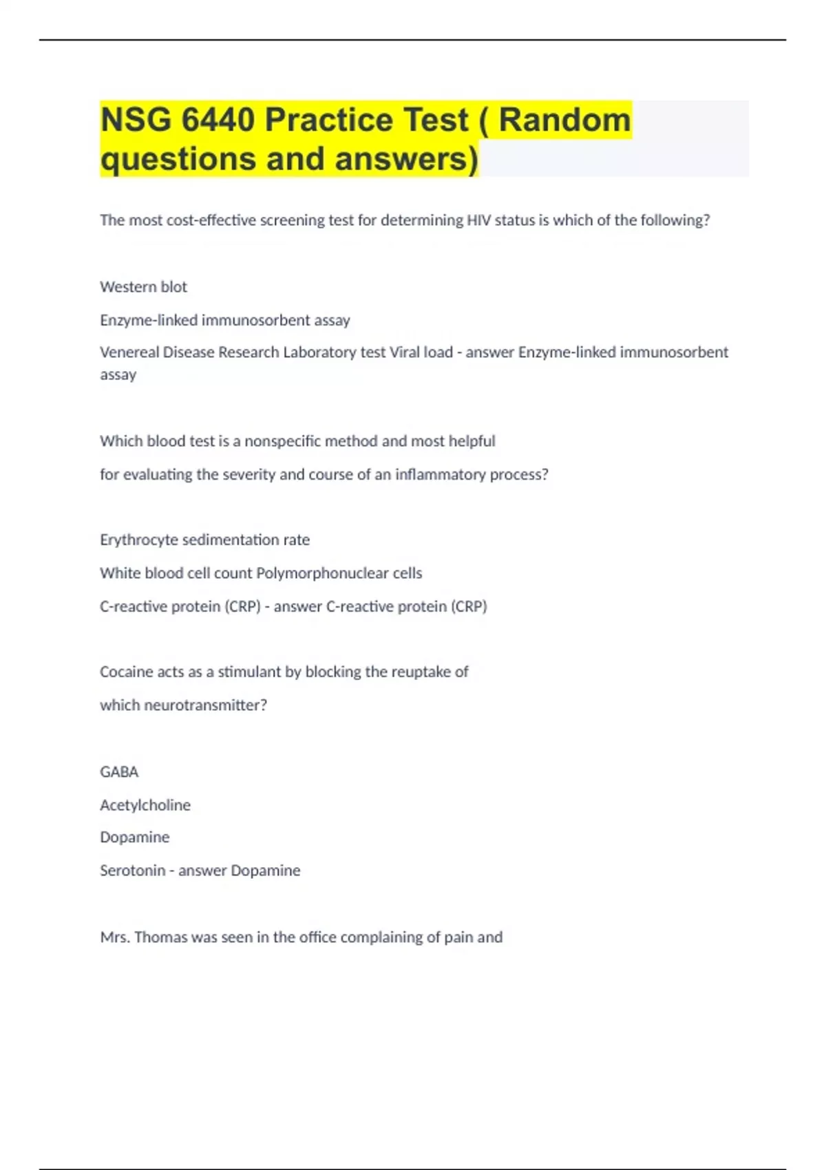 The most cost-effective screening test for determining HIV status is which of the following? Western blot Enzyme-linked immunosorbent assay Venereal Disease Research Laboratory test Viral load Enzyme-linked immunosorbent assay Which blood test is a nonspecific method and most helpful for evaluating the severity and course of an inflammatory process? Erythrocyte sedimentation rate White blood cell count Polymorphonuclear cells C-reactive protein (CRP) C-reactive protein (CRP) Cocaine acts as a stimulant by blocking the reuptake of which neurotransmitter? GABA Acetylcholine Dopamine Serotonin Dopamine Mrs. Thomas was seen in the office complaining of pain and point tenderness in the area of her elbow. The pain has increased following a day of gardening one week ago. A physical finding that differentiates the diagnosis and is most consistent with lateral epicondylitis (tennis elbow) is: Ecchymosis, edema, and erythema over the lateral epicondyle Pain at the elbow with resisted movements at the wrist and forearm Inability to supinate and pronate the arm Inability to flex or extend the elbow against resistance Pain at the elbow with resisted movements at the wrist and forearm Which of the following statements concerning the musculoskeletal examination is true? The uninvolved side should be examined initially and then compared to the involved side. The part of the body that is causing the patient pain should be examined first. When possible, the patient should not be asked to perform active range-of-motion (ROM) exercises to avoid causing pain. Radiographs should always be obtained prior to examination so as not to cause further injury to the patient. The uninvolved side should be examined initially and then compared to the involved side. Which of the following signs or symptoms indicate an inflammatory etiology to musculoskeletal pain? Decreased C-reactive protein Hyperalbuminemia Morning stiffness Weight gain Morning stiffness Which causes the greatest percentage of mammalian bites? Dogs Cats Humans Rodents Dogs A 48-year-old woman is seen in the clinic with complaints of prolonged heavy menstrual periods. She is pale and states she can no longer exercise. Pelvic exam reveals a single, very large mass. Which of the following diagnostic tests should the clinician order first? Transvaginal ultrasound Endometrial biopsy MRI Abdominal computed tomography scan Transvaginal ultrasound A diabetic patient asks the clinician why he needs to check his blood sugar at home even when he feels good. Which of the following responses would be most appropriate? "Control of glucose will help postpone or delay complications." "Regularly checking blood sugar will help establish a routine." "Monitoring glucose will promote a sense of control." All of the above All of the above "Control of glucose will help postpone or delay complications." "Regularly checking blood sugar will help establish a routine." "Monitoring glucose will promote a sense of control." A 25-year-old patient presents to the clinic with fatigue, cold intolerance, weight gain, and constipation for the past 3 months. On physical examination, the clinician notices a sinus bradycardia; muscular stiffness; coarse, dry hair; and a delay in relaxation in deep tendon reflexes. Which of the following tests should be ordered next? Serum calcium TSH Electrolytes Urine specific gravity TSH Which of the following medications for type 2 diabetes mellitus should not be prescribed during pregnancy? Insulin Metformin Glucotrol Precose Glucotrol During a DRE on a 75-year-old man, the clinician suspects the patient has prostate cancer. What physical finding should make the clinician suspicious? An enlarged rubbery gland A hard irregular gland A tender gland A boggy gland An enlarged rubbery gland Eddie, age 4, presents to the ED with a live insect trapped in his ear canal causing a lot of distress. What should be your first step? Remove the insect with tweezers. Immobilize the insect with 2% lidocaine. Sedate Eddie with diazepam. Shine a light in the ear for the insect to "find its way out." Immobilize the insect with 2% lidocaine. What is the most common cause of microcytic anemia? Anemia of chronic disease Sideroblastic anemia Iron-deficiency anemia Thalassemia Iron-deficiency anemia An 82-year-old man is seen in the primary care office with complaints of dribbling urine and difficulty starting his stream. Which of the following should be included in the list of differential diagnoses? Benign prostatic hyperplasia (BPH) Parkinson's disease Prostate cancer All of the above All of the above Early rheumatoid disease is characterized by: Pain and swelling in both small and large peripheral joints Rigid joints with diminished range of motion Joint swelling and immobility on rising A cardiac rub or pulmonary friction rub Joint swelling and immobility on rising A 70-year-old female has fallen 2 weeks ago and developed immediate pain in her left wrist. She thought she just bruised it but is worried because it has not improved. She has used Tylenol® and ice at home, and that has helped slightly. You examine her and find she has moderate swelling and ecchymosis but no overtly obvious deformity. Her ROM is uncomfortable and severely diminished due to the pain. No crepitus is heard or felt. Her fingers are warm; her pulse is strong; and capillary refill is less than 2 seconds. What should you do? Make an immediate referral for an orthopedic evaluation without further assessment. Tell her that it takes time for these bruises to improve, so she should be patient. Obtain a wrist x-ray and place her wrist in a splint or prescribe a splint. Send her to the emergency room for reduction of this obvious wrist fracture. Obtain a wrist x-ray and place her wrist in a splint or prescribe a splint. The criteria for diagnosing generalized anxiety disorder in the American Psychiatric Association's Diagnostic and Statistical Manual of Mental Disorders, 5th edition (text revision) state t