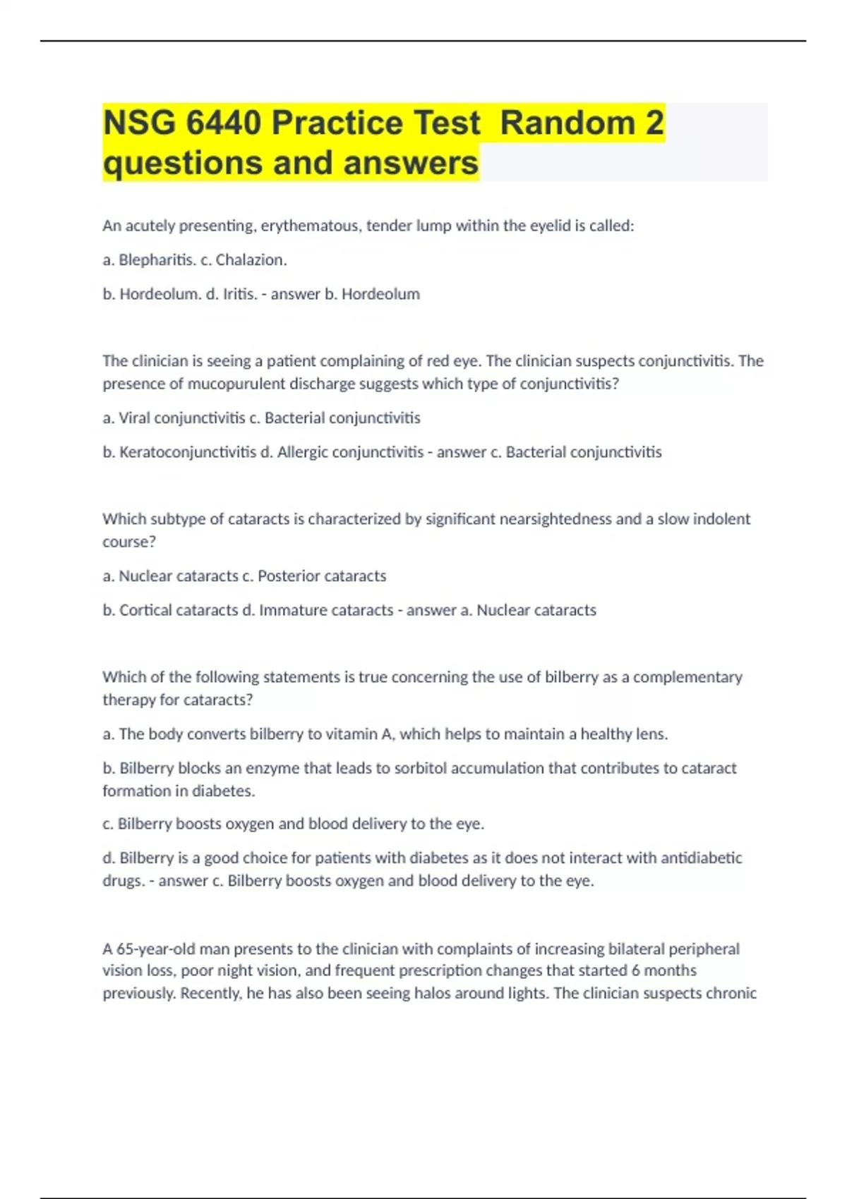 An acutely presenting, erythematous, tender lump within the eyelid is called: a. Blepharitis. c. Chalazion. b. Hordeolum. d. Iritis. b. Hordeolum The clinician is seeing a patient complaining of red eye. The clinician suspects conjunctivitis. The presence of mucopurulent discharge suggests which type of conjunctivitis? a. Viral conjunctivitis c. Bacterial conjunctivitis b. Keratoconjunctivitis d. Allergic conjunctivitis c. Bacterial conjunctivitis Which subtype of cataracts is characterized by significant nearsightedness and a slow indolent course? a. Nuclear cataracts c. Posterior cataracts b. Cortical cataracts d. Immature cataracts a. Nuclear cataracts Which of the following statements is true concerning the use of bilberry as a complementary therapy for cataracts? a. The body converts bilberry to vitamin A, which helps to maintain a healthy lens. b. Bilberry blocks an enzyme that leads to sorbitol accumulation that contributes to cataract formation in diabetes. c. Bilberry boosts oxygen and blood delivery to the eye. d. Bilberry is a good choice for patients with diabetes as it does not interact with antidiabetic drugs. c. Bilberry boosts oxygen and blood delivery to the eye. A 65-year-old man presents to the clinician with complaints of increasing bilateral peripheral vision loss, poor night vision, and frequent prescription changes that started 6 months previously. Recently, he has also been seeing halos around lights. The clinician suspects chronic open-angle glaucoma. Which of the following statements is true concerning the diagnosis of chronic open-angle glaucoma? a. The presence of increased intraocular pressure measured by tonometry is definitive for the diagnosis of open-angle glaucoma. b. The clinician can definitively diagnosis open-angle glaucoma based on the subjective complaints of the patient. c. Physical diagnosis relies on goniscopic evaluation of the angle by an ophthalmologist. d. Early diagnosis is essential in order to reverse any damage that has occurred to the optic nerve. c. Physical diagnosis relies on goniscopic evaluation of the angle by an ophthalmologist. 6. Acute angle-closure glaucoma involves a sudden severe rise in intraocular pressure. Which of the following ranges represents normal intraocular pressure? a. 0 to 7 mm Hg c. 22 to 40 mm Hg b. 8 to 21 mm Hg d. 40 to 80 mm Hg b. 8 to 21 mm Hg As diabetic retinopathy progresses, the presence of "cotton wool" spots can be detected. Cotton wool spots refer to: a. Nerve fiber layer infarctions. c. Venous beading. b. Blood vessel proliferation. d. Retinal hemorrhage. a. Nerve fiber layer infarctions. Which of the following is an example of sensorineural hearing loss? a. Perforation of the tympanic membrane c. Cholesteatoma b. Otosclerosis d. Presbycusis d. Presbycusis The clinician is assessing a patient complaining of hearing loss. The clinician places a tuning fork over the patient's mastoid process, and when the sound fades away, the fork is placed without restriking it over the external auditory meatus. The patient is asked to let the clinician know when the sound fades away. This is an example of which type of test? a. Weber test b. Schwabach test c. Rinne test d. Auditory brainstem response (ABR) test c. Rinne test A patient presents to the clinician complaining of ear pain. On examination, the clinician finds that the patient has tenderness on traction of the pinna as well as when applying pressure over the tragus. These findings are classic signs of which condition? a. Otitis media c. Tinnitus b. Meniere's disease d. Otitis externa d. Otitis externa Otitis media is considered chronic when: a. Inflammation persists more than 3 months with intermittent or persistent otic discharge. b. There are more than six occurrences of otitis media in a 1-year period. c. Otitis media does not resolve after two courses of antibiotics. d. All of the above a. Inflammation persists more than 3 months with intermittent or persistent otic discharge. The most significant precipitating event leading to otitis media with effusion is: a. Pharyngitis. b. Allergies. c. Viral upper respiratory infection (URI). d. Perforation of the eardrum. c. Viral upper respiratory infection (URI). Patients with acute otitis media should be referred to a specialist in which of the following situations? a. Concurrent vertigo or ataxia b. Failed closure of a ruptured tympanic membrane c. If symptoms worsen after 3 or 4 days of treatment d. All of the above d. All of the above Which immunoglobulin mediates the type 1 hypersensitivity reaction involved in allergic rhinitis? a. IgA c. IgG b. IgE d. IgM b. IgE Fluctuations and reductions in estrogen may be a contributing factor in which type of rhinitis? a. Vasomotor rhinitis c. Atrophic rhinitis b. Rhinitis medicamentosum d. Viral rhinitis a. Vasomotor rhinitis Sinusitis is considered chronic when there are episodes of prolonged inflammation with repeated or inadequately treated acute infection lasting greater than: a. 4 weeks. c. 12 weeks. b. 8 weeks. d. 16 weeks. c. 12 weeks. Which of the following antibiotics provides the best coverage in acute or chronic sinusitis when gram-negative organisms are suspected? a. Penicillin V c. Levofloxacin b. Amoxicillin d. Clindamycin c. Levofloxacin In which of the following situations would referral to a specialist be needed for sinusitis? a. Recurrent sinusitis b. Allergic sinusitis c. Sinusitis that is refractory to antibiotic therapy d. All of the above d. All of the above Which type of stomatitis results in necrotic ulceration of the oral mucous membranes? a. Vincent's stomatitis c. Apthous stomatitis b. Allergic stomatitis d. Herpetic stomatitis a. Vincent's stomatitis The presence of hairy leukoplakia in a person with no other symptoms of immune suppression is strongly suggestive of which type of infection? a. HSV Type 2 c. Pneumonia b. HIV d. Syphilis b. HIV Heart valve damage resulting from acute rheumatic fever is a long-term sequelae resulting from i