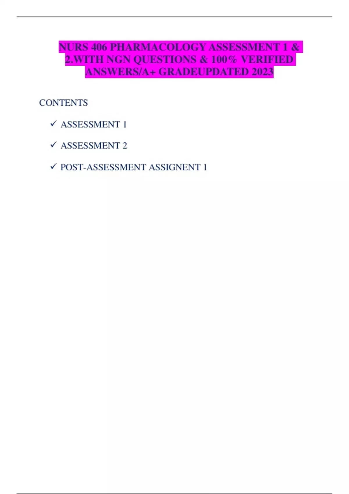 NURS 406 PHARMACOLOGY ASSESSMENT 1 & 2.WITH NGN QUESTIONS & 100% VERIFIED ANSWERS/A+ GRADEUPDATED 2023 CONTENTS ASSESSMENT 1 ASSESSMENT 2 POST-ASSESSMENT ASSIGNENT 1