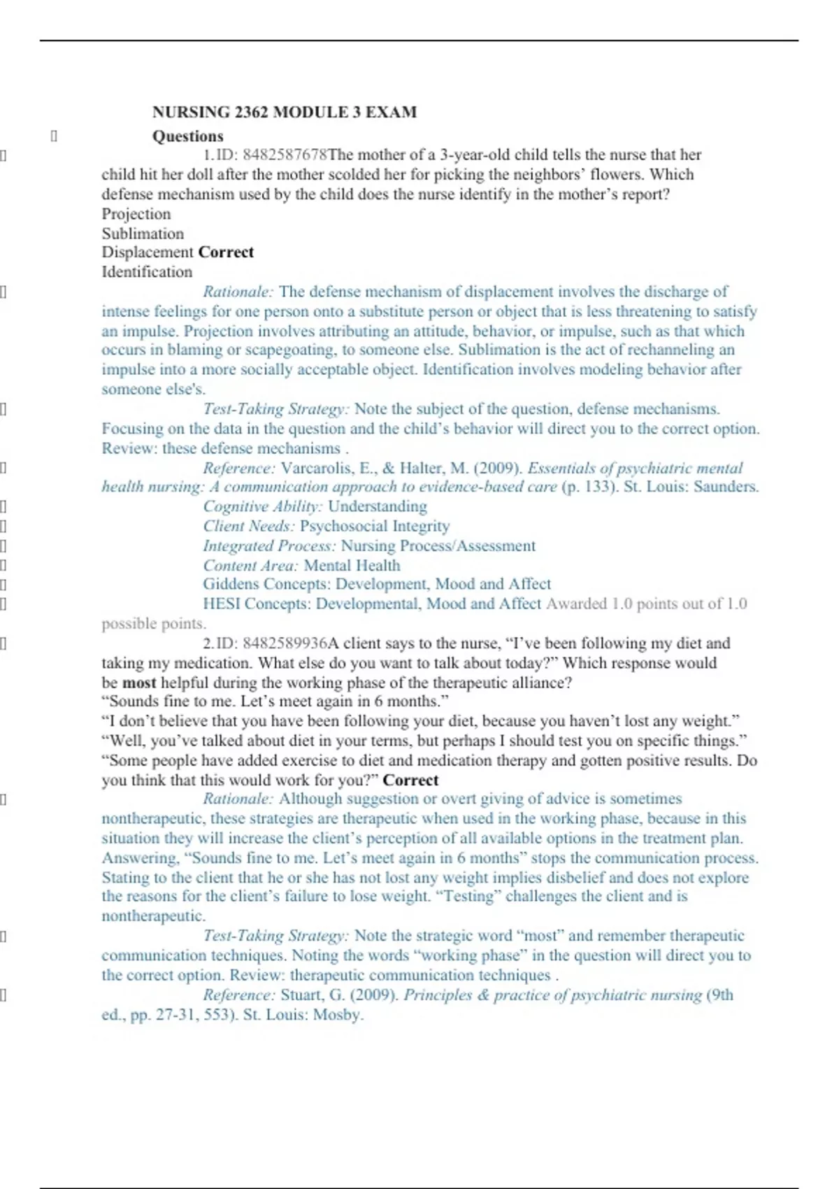 NURSING 2362 MODULE 3 EXAM Questions 1. ID: The mother of a 3-year-old child tells the nurse that her child hit her doll after the mother scolded her for picking the neighbors’ flowers. Which defense mechanism used by the child does the nurse identify in the mother’s report? Projection Sublimation Displacement Correct Identification Rationale: The defense mechanism of displacement involves the discharge of intense feelings for one person onto a substitute person or object that is less threatening to satisfy an impulse. Projection involves attributing an attitude, behavior, or impulse, such as that which occurs in blaming or scapegoating, to someone else. Sublimation is the act of rechanneling an impulse into a more socially acceptable object. Identification involves modeling behavior after someone else's. Test-Taking Strategy: Note the subject of the question, defense mechanisms. Focusing on the data in the question and the child’s behavior will direct you to the correct option. Review: these defense mechanisms . Reference: Varcarolis, E., & Halter, M. (2009). Essentials of psychiatric mental health nursing: A communication approach to evidence-based care (p. 133). St. Louis: Saunders. Cognitive Ability: Understanding Client Needs: Psychosocial Integrity Integrated Process: Nursing Process/Assessment Content Area: Mental Health Giddens Concepts: Development, Mood and Affect HESI Concepts: Developmental, Mood and Affect Awarded 1.0 points out of 1.0 possible points. 2. ID: A client says to the nurse, “I’ve been following my diet and taking my medication. What else do you want to talk about today?” Which response would be most helpful during the working phase of the therapeutic alliance? “Sounds fine to me. Let’s meet again in 6 months.” “I don’t believe that you have been following your diet, because you haven’t lost any weight.” “Well, you’ve talked about diet in your terms, but perhaps I should test you on specific things.” “Some people have added exercise to diet and medication therapy and gotten positive results. Do you think that this would work for you?” Correct Rationale: Although suggestion or overt giving of advice is sometimes nontherapeutic, these strategies are therapeutic when used in the working phase, because in this situation they will increase the client’s perception of all available options in the treatment plan. Answering, “Sounds fine to me. Let’s meet again in 6 months” stops the communication process. Stating to the client that he or she has not lost any weight implies disbelief and does not explore the reasons for the client’s failure to lose weight. “Testing” challenges the client and is nontherapeutic. Test-Taking Strategy: Note the strategic word “most” and remember therapeutic communication techniques. Noting the words “working phase” in the question will direct you to the correct option. Review: therapeutic communication techniques . Reference: Stuart, G. (2009). Principles & practice of psychiatric nursing (9th ed., pp. 27-31, 553). St. Louis: Mosby. Cognitive Ability: Applying Client Needs: Psychosocial Integrity Integrated Process: Communication and Documentation Content Area: Mental Health Giddens Concepts: Communication, Health Promotion HESI Concepts: Communication, Health, Wellness, and Illness—Health Promotion Awarded 1.0 points out of 1.0 possible points. 3. ID: As the nurse prepares to interview a client being admitted to the mental health unit, the client says, “I asked my family to bring me in here to talk to someone, but now I don’t know where to begin.” Which response by the nurse would be most helpful? “Why not just start talking and see where it takes you?” “If I were you, I’d begin with what you were doing this morning.” “Perhaps you can start by sharing some of your most recent concerns.” Correct “Don’t worry. Everyone who comes in here for the first time feels reluctant to talk.” Rationale: The intake interview is usually the first contact with the client. It is intended to establish rapport, to help the nurse understand the client’s current problem and level of functioning, and to help the nurse formulate a nursing care plan. The clinician usually allows the client to set the pace of the interview and uses open-ended questions to elicit a comprehensive diagnostic picture of the client’s problems and level of coping. Sharing concerns is a good place to start the conversation, because it will allow the client to express feelings. The response “Why not just start talking and see where it takes you?” is too general and does not provide the client with a focus on self. Telling the client not to worry is nontherapeutic and avoids addressing the client’s concerns. Test-Taking Strategy: Note the strategic word “most.” Use your knowledge of therapeutic communication techniques. Focusing on the client’s feelings will direct you to the correct option. Review: therapeutic communication techniques . References: Stuart, G. (2009). Principles & practice of psychiatric nursing (9th ed., pp. 27-31). St. Louis: Mosby. Varcarolis, E., & Halter, M. (2009). Essentials of psychiatric mental health nursing: A communication approach to evidence-based care (pp. 117-118). St. Louis: Saunders. Cognitive Ability: Applying Client Needs: Psychosocial Integrity Integrated Process: Communication and Documentation Content Area: Mental Health Giddens Concepts: Communication, Mood and Affect HESI Concepts: Communication, Mood and Affect Awarded 1.0 points out of 1.0 possible points. 4. ID: During a mental health intake interview, a young adult client who lives with his family rent free says, “I’m tired of not being able to offer my friends a beer just because my folks don’t believe in taking a drink socially.” Which nursing response would be therapeutic? “Well, I guess you could move out and live on your own if you wanted to.” “It seems that your parents expect 