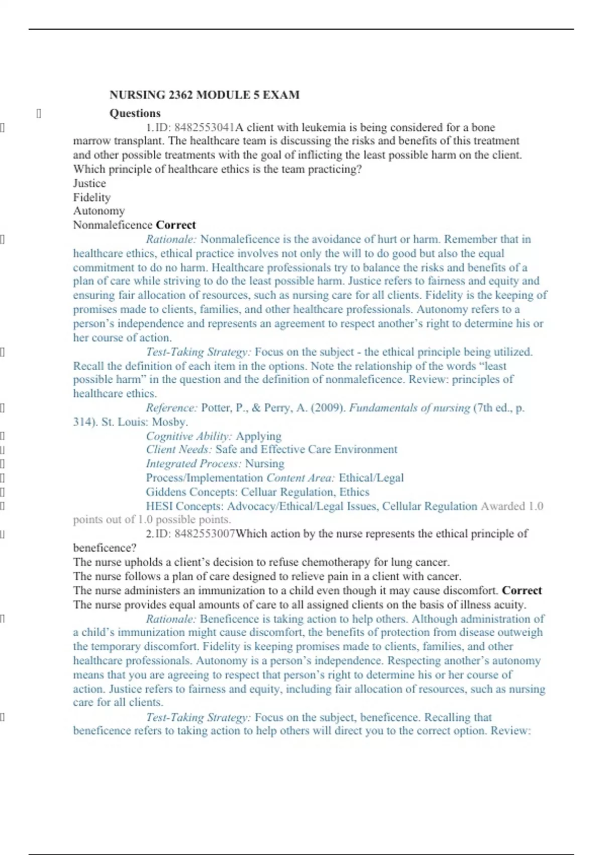 NURSING 2362 MODULE 5 EXAM Questions 1. ID: A client with leukemia is being considered for a bone marrow transplant. The healthcare team is discussing the risks and benefits of this treatment and other possible treatments with the goal of inflicting the least possible harm on the client. Which principle of healthcare ethics is the team practicing? Justice Fidelity Autonomy Nonmaleficence Correct Rationale: Nonmaleficence is the avoidance of hurt or harm. Remember that in healthcare ethics, ethical practice involves not only the will to do good but also the equal commitment to do no harm. Healthcare professionals try to balance the risks and benefits of a plan of care while striving to do the least possible harm. Justice refers to fairness and equity and ensuring fair allocation of resources, such as nursing care for all clients. Fidelity is the keeping of promises made to clients, families, and other healthcare professionals. Autonomy refers to a person’s independence and represents an agreement to respect another’s right to determine his or her course of action. Test-Taking Strategy: Focus on the subject - the ethical principle being utilized. Recall the definition of each item in the options. Note the relationship of the words “least possible harm” in the question and the definition of nonmaleficence. Review: principles of healthcare ethics. Reference: Potter, P., & Perry, A. (2009). Fundamentals of nursing (7th ed., p. 314). St. Louis: Mosby. Cognitive Ability: Applying Client Needs: Safe and Effective Care Environment Integrated Process: Nursing Process/Implementation Content Area: Ethical/Legal Giddens Concepts: Celluar Regulation, Ethics HESI Concepts: Advocacy/Ethical/Legal Issues, Cellular Regulation Awarded 1.0 points out of 1.0 possible points. 2. ID: Which action by the nurse represents the ethical principle of beneficence? The nurse upholds a client’s decision to refuse chemotherapy for lung cancer. The nurse follows a plan of care designed to relieve pain in a client with cancer. The nurse administers an immunization to a child even though it may cause discomfort. Correct The nurse provides equal amounts of care to all assigned clients on the basis of illness acuity. Rationale: Beneficence is taking action to help others. Although administration of a child’s immunization might cause discomfort, the benefits of protection from disease outweigh the temporary discomfort. Fidelity is keeping promises made to clients, families, and other healthcare professionals. Autonomy is a person’s independence. Respecting another’s autonomy means that you are agreeing to respect that person’s right to determine his or her course of action. Justice refers to fairness and equity, including fair allocation of resources, such as nursing care for all clients. Test-Taking Strategy: Focus on the subject, beneficence. Recalling that beneficence refers to taking action to help others will direct you to the correct option. Review: the principles of healthcare ethics . Reference: Potter, P., & Perry, A. (2009). Fundamentals of nursing (7th ed., p. 314). St. Louis: Mosby. Cognitive Ability: Applying Client Needs: Safe and Effective Care Environment Integrated Process: Nursing Process/Implementation Content Area: Ethical/Legal Giddens Concepts: Ethics, Immunity HESI Concepts: Advocacy/Ethical/Legal Issues, Immunity Awarded 1.0 points out of 1.0 possible points. 3. ID: The nursing instructor asks a student to name an example of false imprisonment. Which situation reflects a violation of this client right? Performing a procedure without consent Telling the client that he or she may not leave the hospital Correct Threatening to give a client a medication against his or her will Observing the provision of care to the client without the client’s permission Rationale: Telling a client that he or she may not leave the hospital constitutes false imprisonment. Performing a procedure without consent is an example of battery. Threatening to give a client a medication against his or her will is assault. Invasion of privacy takes place with unreasonable intrusion into an individual’s private affairs. Observing the provision of care to a client without the client’s permission is an example of invasion of privacy. Test-Taking Strategy: Focus on the subject, an example of false imprisonment. Note the relationship of the subject and the words in the correct option. Review: the concept of false imprisonment. References: Cherry, B., & Jacob, S. (2008). Contemporary nursing issues: Trends & management (4th ed., pp. 175, 176). St. Louis: Mosby. Zerwekh, J., & Claborn, J. (2009). Nursing today: Transition and trends (6th ed., p. 424). Cognitive Ability: Evaluating Client Needs: Safe and Effective Care Environment Integrated Process: Teaching and Learning Content Area: Ethical/Legal Giddens Concepts: Health Care Law, Leadership HESI Concepts: Advocacy/Ethical/Legal Issues, Health Policy/Systems—Health Care Law Awarded 1.0 points out of 1.0 possible points. 4. ID: The nurse and an unlicensed assistive personnel (UAP)enter a client’s room to provide care and find the client lying on the floor. Which action should the nurse take first? Ask the nursing assistant to complete an incident report Check the client’s level of consciousness and vital signs Correct Ask the nursing assistant to assist in getting the client back to bed Contact the unit secretary on the intercom and ask that the client’s health care provider be called Rationale: When a client sustains a fall, the nurse must first assess the client. The nurse should check the client’s level of consciousness and vital signs and look for any bruises or injuries sustained in the fall. If the nurse determines that the client has not sustained any injuries and that it is safe to move the client, the nurse should ask the UAP to assist in getting the client into bed. The nurse should then contact the health care provider and file an incident report.