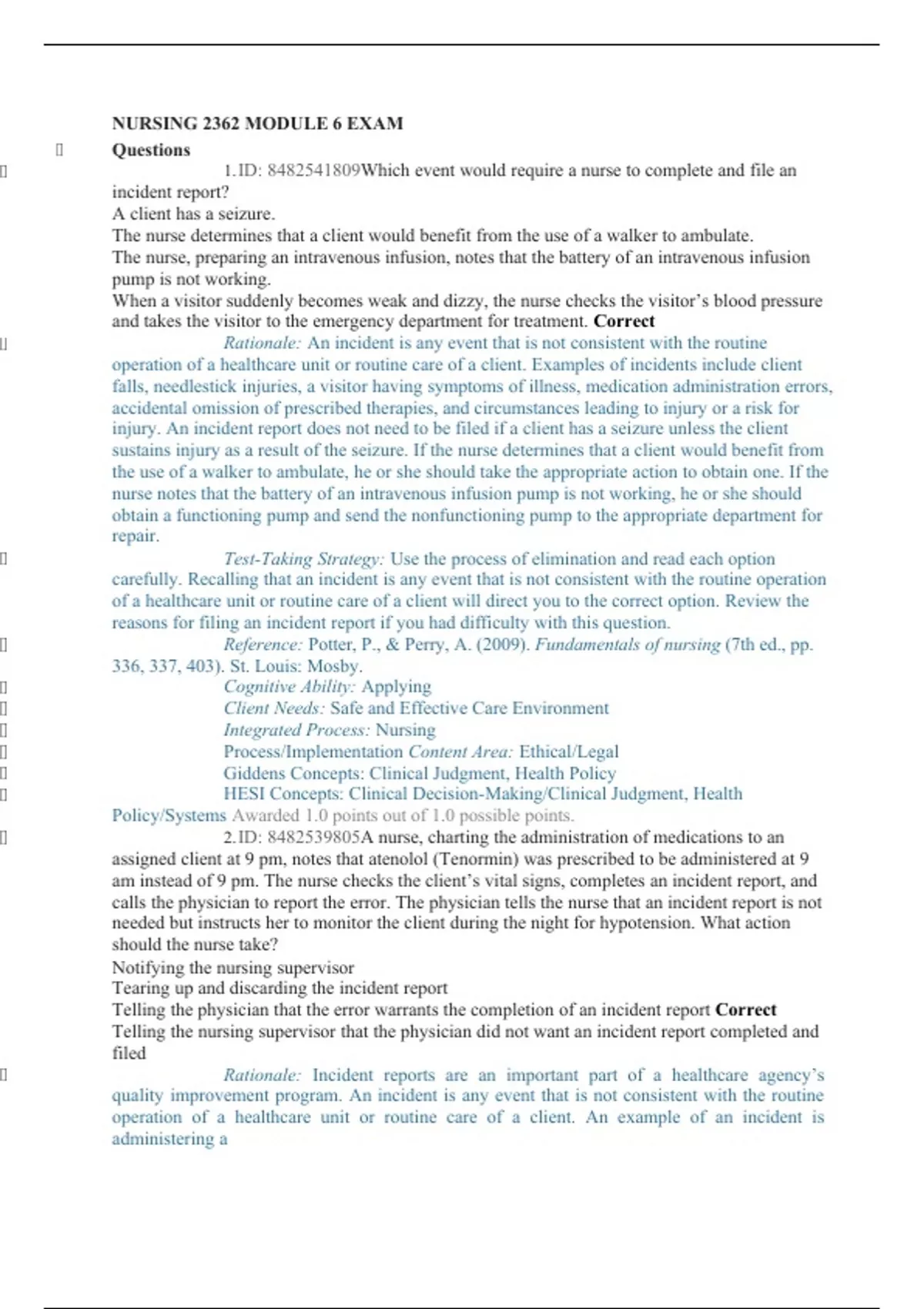 NURSING 2362 MODULE 6 EXAM Questions 1. ID: Which event would require a nurse to complete and file an incident report? A client has a seizure. The nurse determines that a client would benefit from the use of a walker to ambulate. The nurse, preparing an intravenous infusion, notes that the battery of an intravenous infusion pump is not working. When a visitor suddenly becomes weak and dizzy, the nurse checks the visitor’s blood pressure and takes the visitor to the emergency department for treatment. Correct Rationale: An incident is any event that is not consistent with the routine operation of a healthcare unit or routine care of a client. Examples of incidents include client falls, needlestick injuries, a visitor having symptoms of illness, medication administration errors, accidental omission of prescribed therapies, and circumstances leading to injury or a risk for injury. An incident report does not need to be filed if a client has a seizure unless the client sustains injury as a result of the seizure. If the nurse determines that a client would benefit from the use of a walker to ambulate, he or she should take the appropriate action to obtain one. If the nurse notes that the battery of an intravenous infusion pump is not working, he or she should obtain a functioning pump and send the nonfunctioning pump to the appropriate department for repair. Test-Taking Strategy: Use the process of elimination and read each option carefully. Recalling that an incident is any event that is not consistent with the routine operation of a healthcare unit or routine care of a client will direct you to the correct option. Review the reasons for filing an incident report if you had difficulty with this question. Reference: Potter, P., & Perry, A. (2009). Fundamentals of nursing (7th ed., pp. 336, 337, 403). St. Louis: Mosby. Cognitive Ability: Applying Client Needs: Safe and Effective Care Environment Integrated Process: Nursing Process/Implementation Content Area: Ethical/Legal Giddens Concepts: Clinical Judgment, Health Policy HESI Concepts: Clinical Decision-Making/Clinical Judgment, Health Policy/Systems Awarded 1.0 points out of 1.0 possible points. 2. ID: A nurse, charting the administration of medications to an assigned client at 9 pm, notes that atenolol (Tenormin) was prescribed to be administered at 9 am instead of 9 pm. The nurse checks the client’s vital signs, completes an incident report, and calls the physician to report the error. The physician tells the nurse that an incident report is not needed but instructs her to monitor the client during the night for hypotension. What action should the nurse take? Notifying the nursing supervisor Tearing up and discarding the incident report Telling the physician that the error warrants the completion of an incident report Correct Telling the nursing supervisor that the physician did not want an incident report completed and filed Rationale: Incident reports are an important part of a healthcare agency’s quality improvement program. An incident is any event that is not consistent with the routine operation of a healthcare unit or routine care of a client. An example of an incident is administering a medication at a time at which it is not prescribed to be given. Whenever an incident occurs, an incident report is completed and filed in accordance with agency guidelines. The nursing supervisor would be notified of the incident; however, on the basis of the data in the question, the nurse should tell the physician that the error warrants completion and follow-through with an incident report. Therefore, the other options are incorrect. Test-Taking Strategy: Focus on the subject of the question, the physician’s telling the nurse that an incident report is not needed. Eliminate the options that are comparable or alike in that they involve notifying the nursing supervisor. To select from the remaining options, recall the purpose of an incident report to select the correct option. Review the procedures involved in completing and filing incident reports if you had difficulty with this question. Reference: Huber, D. (2010). Leadership and nursing care management (4th ed., pp. 557, 558). St. Louis: Saunders. Cognitive Ability: Applying Client Needs: Safe and Effective Care Environment Integrated Process: Nursing Process/Implementation Content Area: Ethical/Legal Giddens Concepts: Clinical Judgment, Health Policy HESI Concepts: Clinical Decision-Making/Clinical Judgment, Health Policy/Systems Awarded 1.0 points out of 1.0 possible points. 3. ID: Contact precautions are initiated for a client with methicillin- resistant Staphylococcus aureus (MRSA) infection. The nurse, providing instructions to a nursing assistant about caring for the client, tells the assistant: To transfer the client to a semiprivate room That gloves only are needed to care for the client To wear gloves and a gown when changing the client's bed linen. Correct To wear a gown when caring for the client and remove the gown immediately after leaving the client’s room Rationale: Contact precautions require the use of gloves, gown, and goggles if direct client contact is anticipated. Goggles are worn to protect the mucous membranes of the eye during interventions that may produce splashes of blood or body fluids, secretions, or excretions. The client should be placed in a private room or, if a private room is not available, in a semiprivate room with another client who has active infection with the same microorganism but no other infection. The nursing assistant would remove the protective gear before leaving the client’s room. Test-Taking Strategy: Use the process of elimination. Eliminate the option that includes the closed-ended word “only.” Next eliminate the option that involves removal of the gown after leaving the client’s room. To select from the remaining options, read each carefully and visualize the procedure instituted for contact precautions, which will direct y