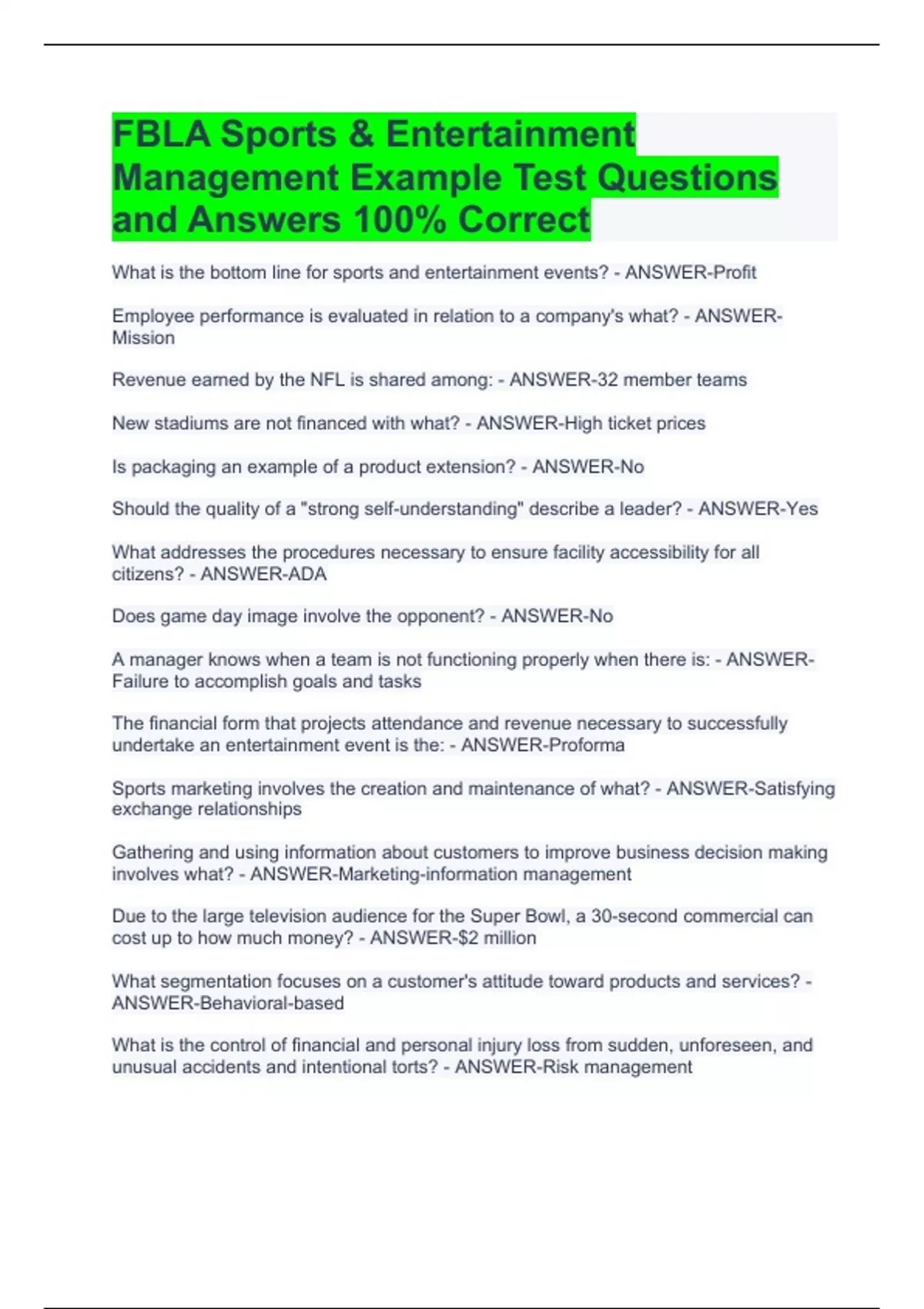 FBLA Sports & Entertainment Management Example Test Questions and Answers 100% Correct