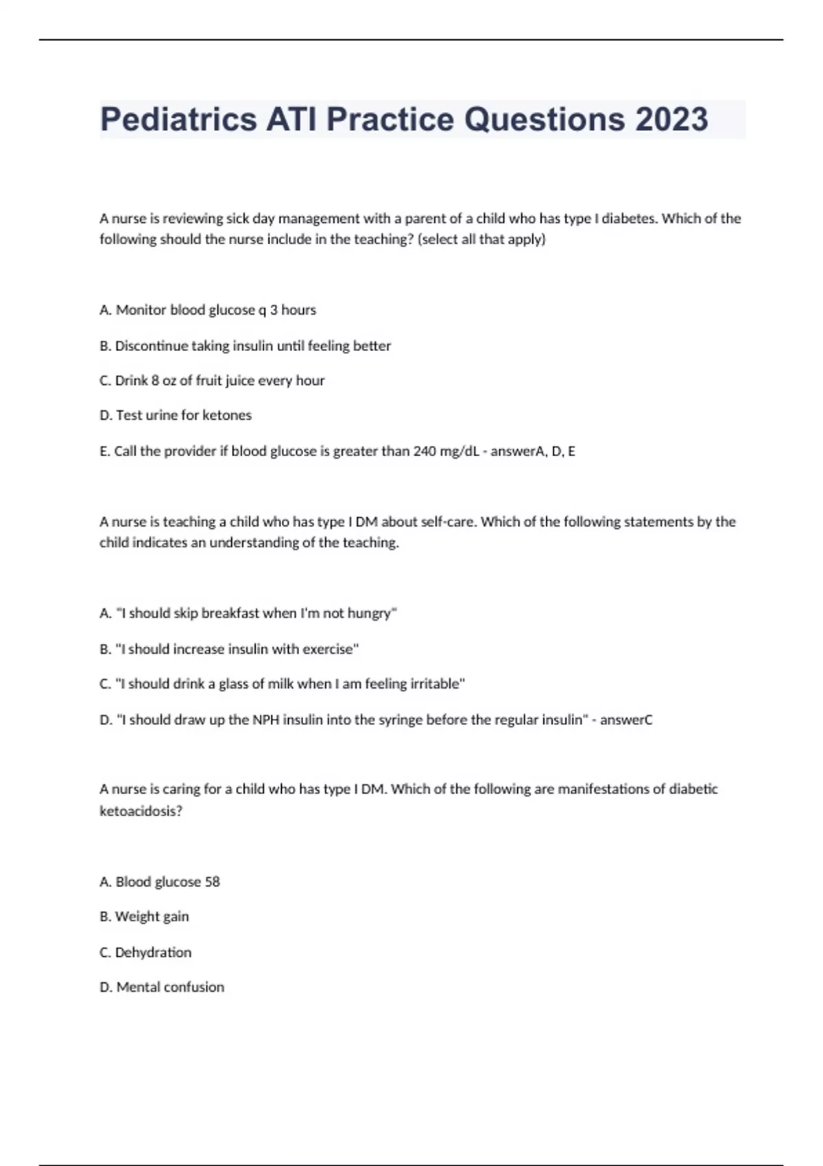 Pediatrics ATI Test Questions with answers 2023 A nurse is reviewing sick day management with a parent of a child who has type I diabetes. Which of the following should the nurse include in the teaching? (select all that apply) A. Monitor blood glucose q 3 hours B. Discontinue taking insulin until feeling better C. Drink 8 oz of fruit juice every hour D. Test urine for ketones E. Call the provider if blood glucose is greater than 240 mg/dL A, D, E A nurse is teaching a child who has type I DM about self-care. Which of the following statements by the child indicates an understanding of the teaching. A. "I should skip breakfast when I'm not hungry" B. "I should increase insulin with exercise" C. "I should drink a glass of milk when I am feeling irritable" D. "I should draw up the NPH insulin into the syringe before the regular insulin" C A nurse is caring for a child who has type I DM. Which of the following are manifestations of diabetic ketoacidosis? A. Blood glucose 58 B. Weight gain C. Dehydration D. Mental confusion E. Fruity breath C, D, E A nurse is teaching an adolescent who has DM about manifestations of hypoglycemia. Which should the nurse include in the teaching? (select all that apply) A. Increased urination B. Hunger C. Poor skin turgor D. Irritability E. Sweating/pallor F. Kussmaul respirations B, D, E A nurse is teaching a school aged child who has DM about insulin administration. Which should she include? A. "You should inject the needle at a 30 degree angle" B. "You should combine the glargine and regular insulin in the same syringe" C. "You should aspirate for blood prior to administration" D. "You should give four to six injections in one area before rotating sites" D