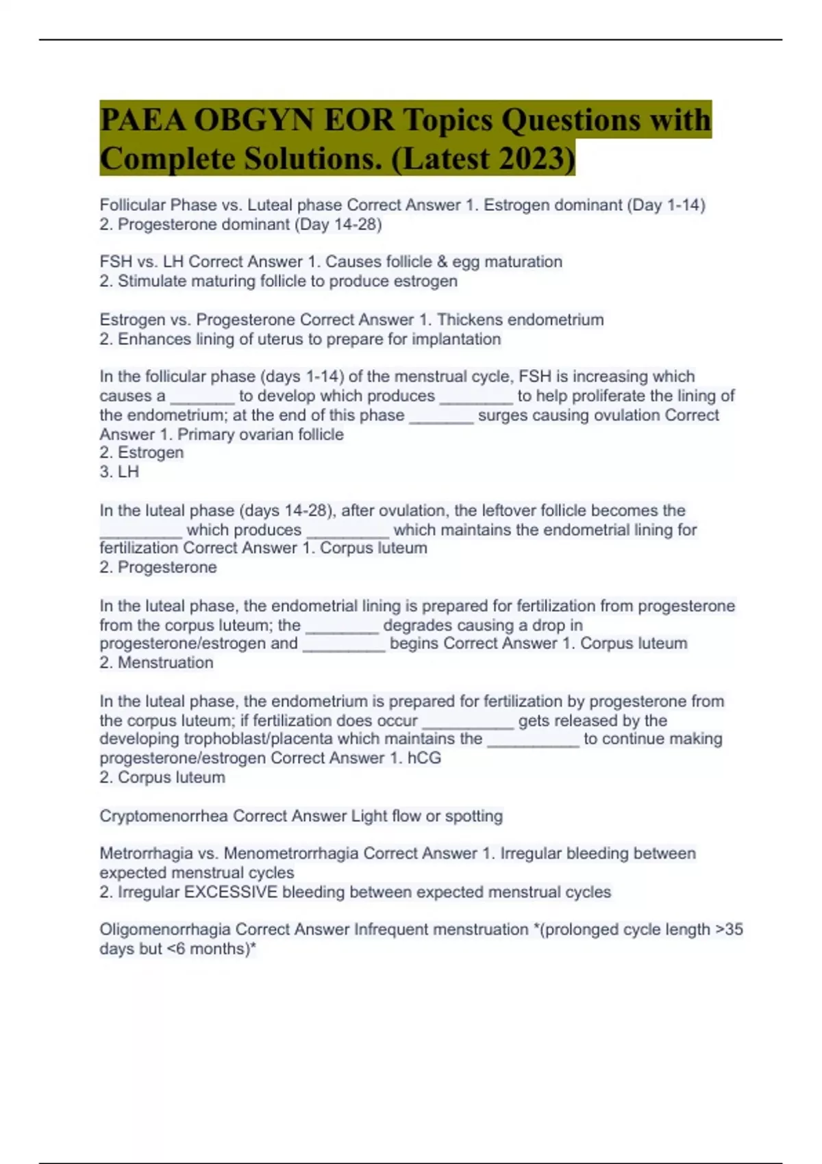 PAEA OBGYN EOR Topics Questions with Complete Solutions. (Latest 2023)