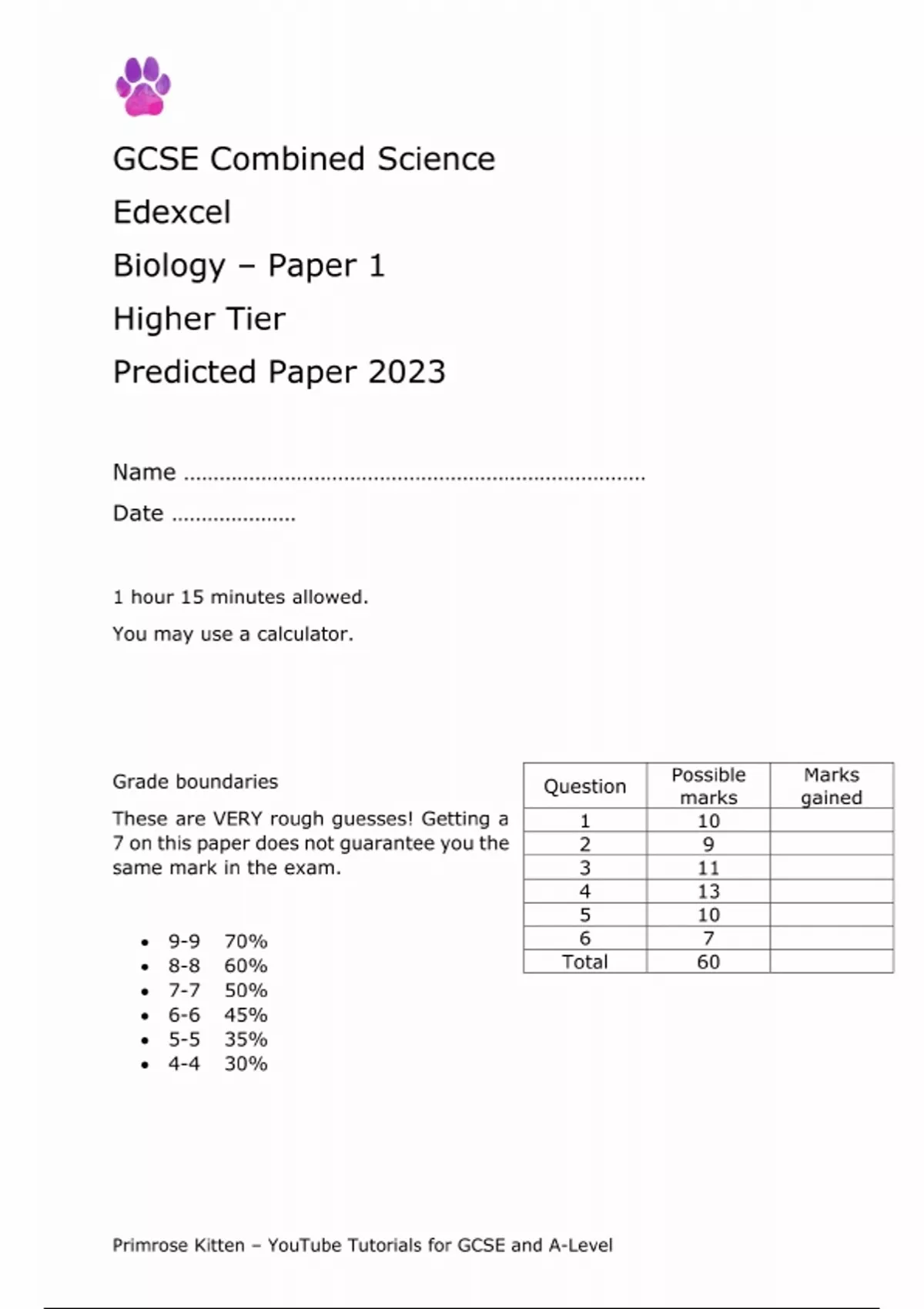 EDEXCEL GCSE COMBINED SCIENCE BIOLOGY PAPER 1 (HIGHER TIER PREDICTED) 2023. MOST RECENT WITH 100% SCORES