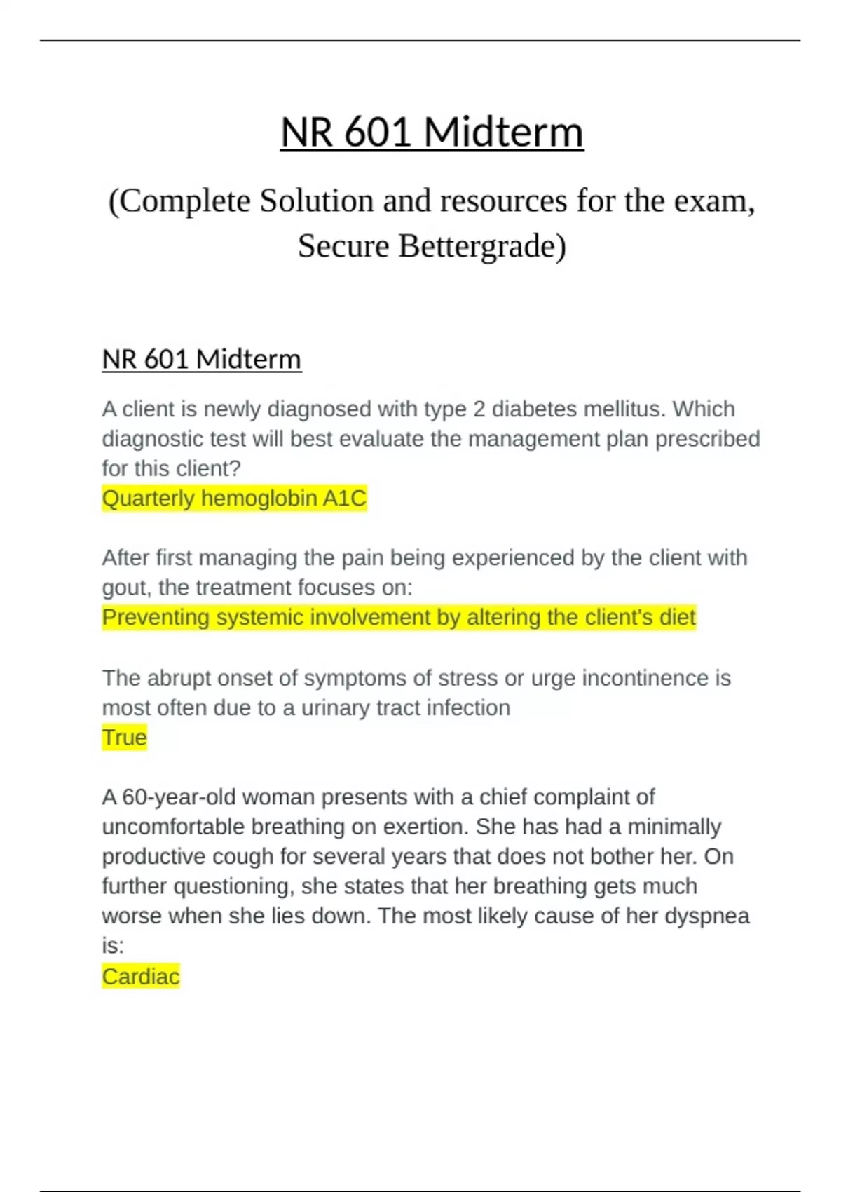 A client is newly diagnosed with type 2 diabetes mellitus. Which diagnostic test will best evaluate the management plan prescribed for this client? Quarterly hemoglobin A1C After first managing the pain being experienced by the client with gout, the treatment focuses on: Preventing systemic involvement by altering the client's diet The abrupt onset of symptoms of stress or urge incontinence is most often due to a urinary tract infection True A 60-year-old woman presents with a chief complaint of uncomfortable breathing on exertion. She has had a minimally productive cough for several years that does not bother her. On further questioning, she states that her breathing gets much worse when she lies down. The most likely cause of her dyspnea is: Cardiac