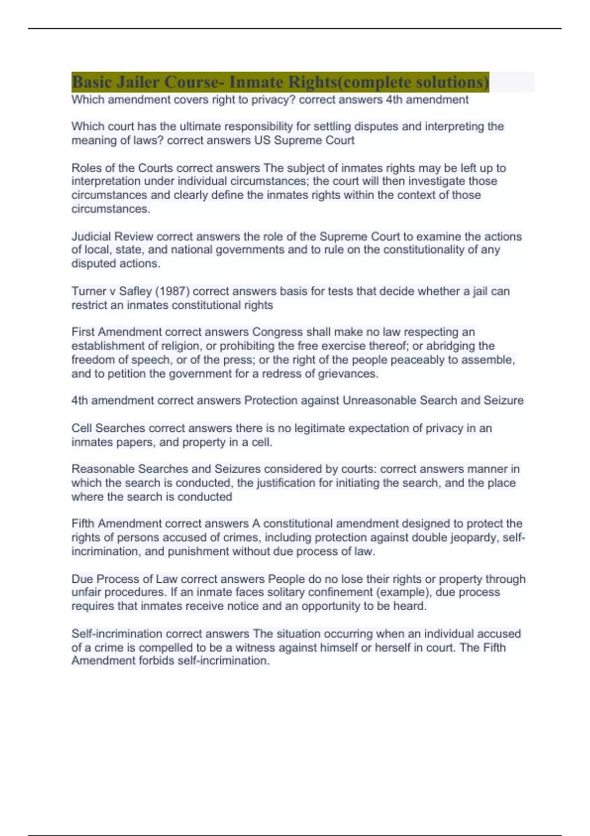 Which amendment covers right to privacy? correct answers 4th amendment Which court has the ultimate responsibility for settling disputes and interpreting the meaning of laws? correct answers US Supreme Court Roles of the Courts correct answers The subject of inmates rights may be left up to interpretation under individual circumstances; the court will then investigate those circumstances and clearly define the inmates rights within the context of those circumstances. Judicial Review correct answers the role of the Supreme Court to examine the actions of local, state, and national governments and to rule on the constitutionality of any disputed actions. Turner v Safley (1987) correct answers basis for tests that decide whether a jail can restrict an inmates constitutional rights First Amendment correct answers Congress shall make no law respecting an establishment of religion, or prohibiting the free exercise thereof; or abridging the freedom of speech, or of the press; or the right of the people peaceably to assemble, and to petition the government for a redress of grievances. 4th amendment correct answers Protection against Unreasonable Search and Seizure Cell Searches correct answers there is no legitimate expectation of privacy in an inmates papers, and property in a cell. Reasonable Searches and Seizures considered by courts: correct answers manner in which the search is conducted, the justification for initiating the search, and the place where the search is conducted Fifth Amendment correct answers A constitutional amendment designed to protect the rights of persons accused of crimes, including protection against double jeopardy, self-incrimination, and punishment without due process of law. Due Process of Law correct answers People do no lose their rights or property through unfair procedures. If an inmate faces solitary confinement (example), due process requires that inmates receive notice and an opportunity to be heard. Self-incrimination correct answers The situation occurring when an individual accused of a crime is compelled to be a witness against himself or herself in court. The Fifth Amendment forbids self-incrimination.
