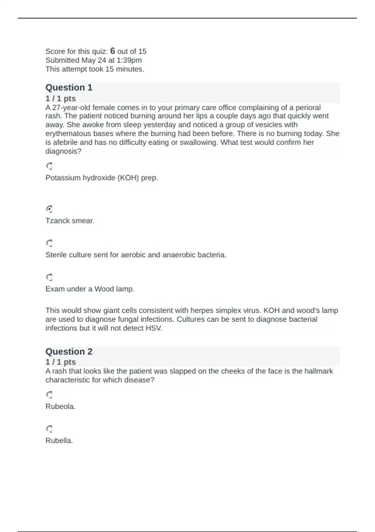 A 27-year-old female comes in to your primary care office complaining of a perioral rash. The patient noticed burning around her lips a couple days ago that quickly went away. She awoke from sleep yesterday and noticed a group of vesicles with erythematous bases where the burning had been before. There is no burning today. She is afebrile and has no difficulty eating or swallowing. What test would confirm her diagnosis? Potassium hydroxide (KOH) prep. Correct! Tzanck smear. Sterile culture sent for aerobic and anaerobic bacteria. Exam under a Wood lamp