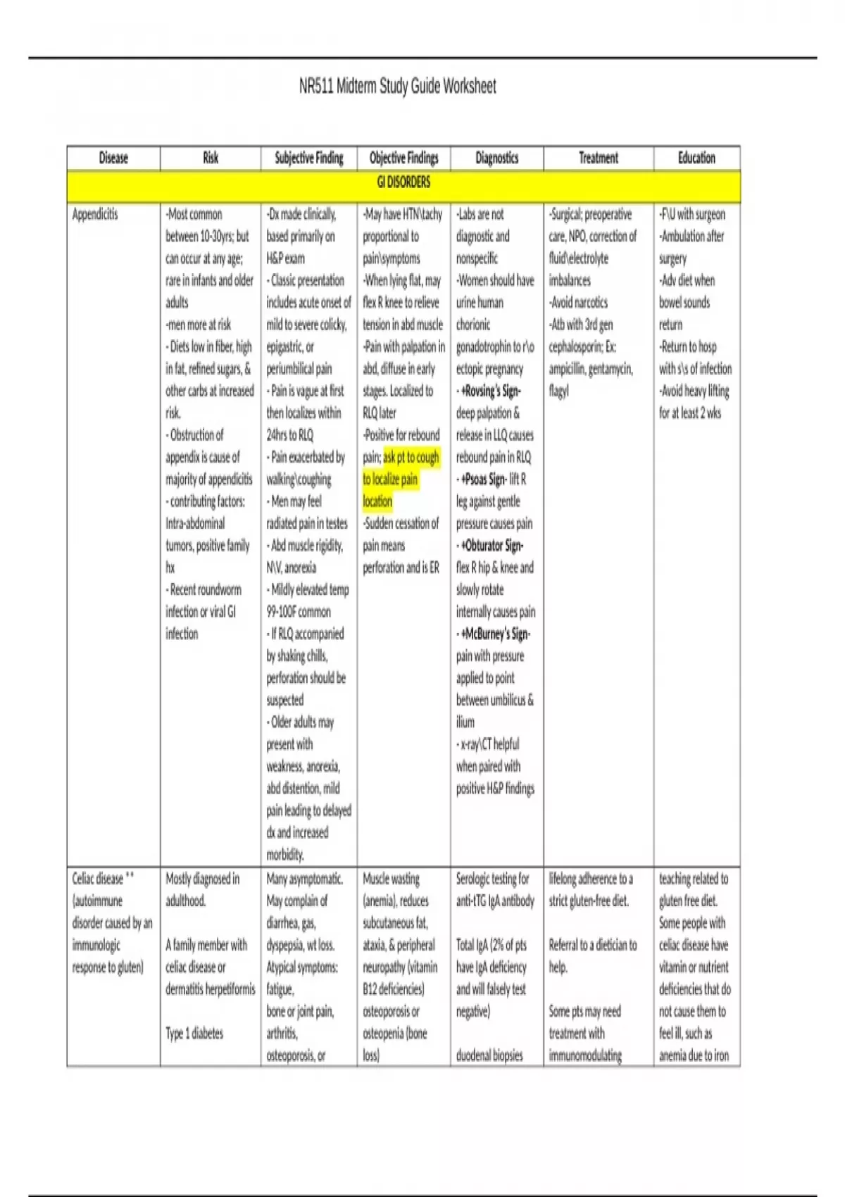 Disease Risk Subjective Finding Objective Findings Diagnostics Treatment Education GI DISORDERS Appendicitis -Most common between 10-30yrs; but can occur at any age; rare in infants and older adults -men more at risk - Diets low in fiber, high in fat, refined sugars, & other carbs at increased risk. - Obstruction of appendix is cause of majority of appendicitis - contributing factors: Intra-abdominal tumors, positive family hx - Recent roundworm infection or viral GI infection -Dx made clinically, based primarily on H&P exam - Classic presentation includes acute onset of mild to severe colicky, epigastric, or periumbilical pain - Pain is vague at first then localizes within 24hrs to RLQ - Pain exacerbated by walkingcoughing - Men may feel radiated pain in testes - Abd muscle rigidity, NV, anorexia - Mildly elevated temp 99-100F common - If RLQ accompanied by shaking chills, perforation should be suspected - Older adults may present with weakness, anorexia, abd distention, mild pain leading to delayed dx and increased morbidity. -May have HTNtachy proportional to painsymptoms -When lying flat, may flex R knee to relieve tension in abd muscle -Pain with palpation in abd, diffuse in early stages. Localized to RLQ later -Positive for rebound pain; ask pt to cough to localize pain location -Sudden cessation of pain means perforation and is ER -Labs are not diagnostic and nonspecific -Women should have urine human chorionic gonadotrophin to ro ectopic pregnancy - +Rovsing’s Signdeep palpation & release in LLQ causes rebound pain in RLQ - +Psoas Sign- lift R leg against gentle pressure causes pain - +Obturator Signflex R hip & knee and slowly rotate internally causes pain - +McBurney’s Signpain with pressure applied to point between umbilicus & ilium - x-rayCT helpful when paired with positive H&P findings -Surgical; preoperative care, NPO, correction of fluidelectrolyte imbalances -Avoid narcotics -Atb with 3rd gen cephalosporin; Ex: ampicillin, gentamycin, flagyl -FU with surgeon -Ambulation after surgery -Adv diet when bowel sounds return -Return to hosp with ss of infection -Avoid heavy lifting for at least 2 wk