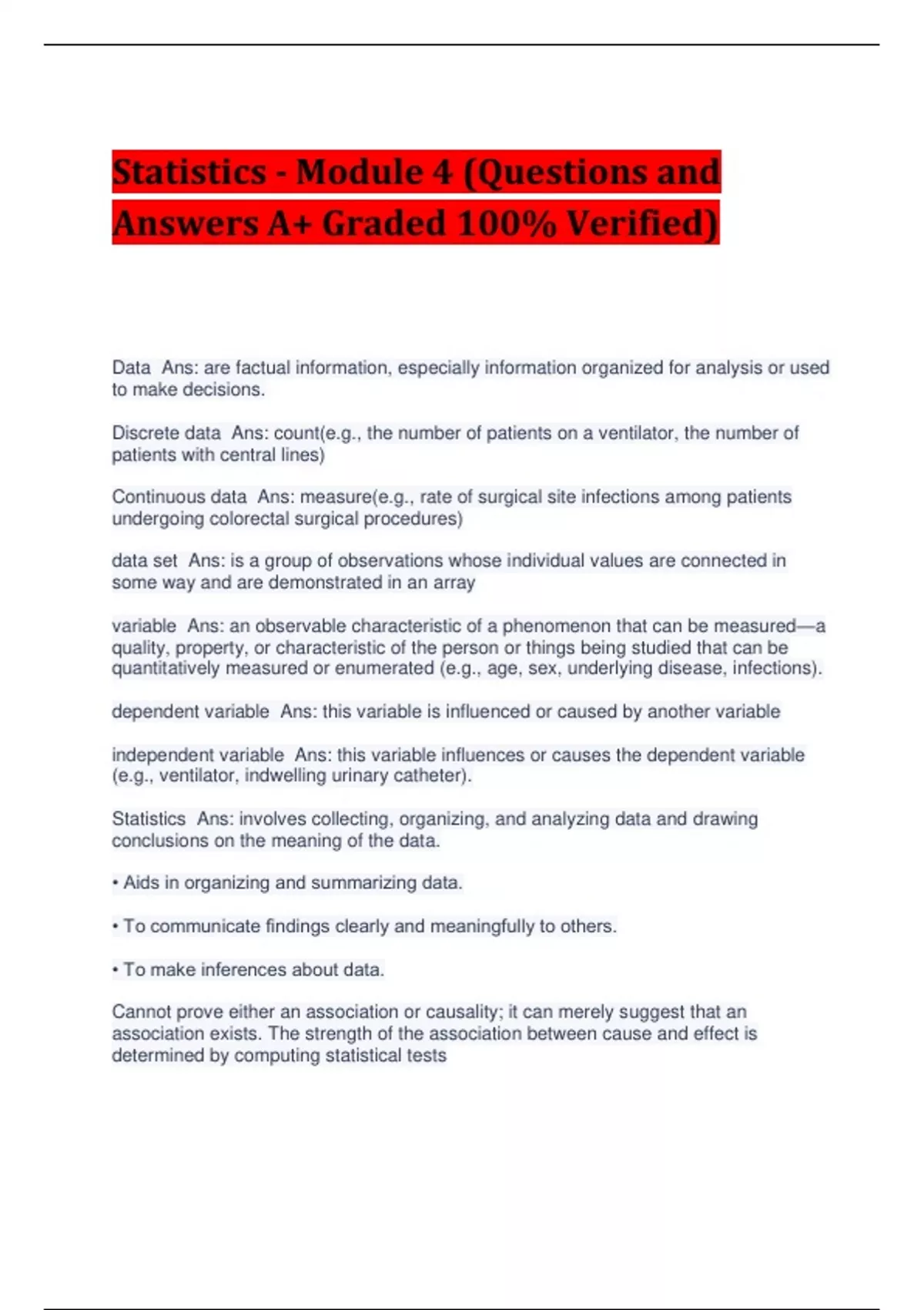Statistics - Module 4 (Questions and Answers A+ Graded 100% Verified) Data Ans: are factual information, especially information organized for analysis or used to make decisions. Discrete data Ans: count(e.g., the number of patients on a ventilator, the number of patients with central lines) Continuous data Ans: measure(e.g., rate of surgical site infections among patients undergoing colorectal surgical procedures) data set Ans: is a group of observations whose individual values are connected in some way and are demonstrated in an array variable Ans: an observable characteristic of a phenomenon that can be measured—a quality, property, or characteristic of the person or things being studied that can be quantitatively measured or enumerated (e.g., age, sex, underlying disease, infections). dependent variable Ans: this variable is influenced or caused by another variable independent variable Ans: this variable influences or causes the dependent variable (e.g., ventilator, indwelling urinary catheter). Statistics Ans: involves collecting, organizing, and analyzing data and drawing conclusions on the meaning of the data. • Aids in organizing and summarizing data. • To communicate findings clearly and meaningfully to others. • To make inferences about data. Cannot prove either an association or causality; it can merely suggest that an association exists. The strength of the association between cause and effect is determined by computing statistical tests The IP will need some basic statistical skills to: Ans: • Describe an outbreak (mean, attack rate, possibly standard deviation). • Select control subjects who are similar to case subjects in regard to possible exposure. • Identify the distribution of the data (normal, skewed, or unknown) in order to select the appropriate test to determine statistical significance. • Generate test hypotheses to establish statistical significance of an exposure or increase/decrease in rates. • Determine the correct graphic display based on type of data (discrete versus continuous). Some commonly used statistical methods: Ans: • Numeric summaries that describe characteristics of the population being studied (e.g., mean, average number of days of catheterization before development of a urinary tract infection) • Frequency distributions displayed as tables, graphs, or charts • Infection rates Types of statistics Ans: 1) Descriptive statistics 2) Inferential statistics Descriptive statistics Ans: Statistics that provide numerical information about variables. In simple terms, it uses numbers to describe characteristics of a data set. Types of descriptive statistics Ans: 1) Discrete data 2) Continuous data Discrete data Ans: data that contains whole numbers and are mutually exclusive (e.g., infected or not infected, male or female, blood type). Continuous data Ans: data that require the process of measuring, rather than counting data. Contains information that can be measured on a continuum or scale and can have numeric values between the minimum and maximum value (e.g., age; serum cholesterol level; temperature; infection rates). Continuous Inferential statistics Ans: make an assumption about a population based on a sample or calculates strength of association between cause and effect. Descriptive Statistics- Scales of Measurement Nominal Scale Ans: The nominal scale is the simplest or crudest level of measurement. Categories are used to classify observations into mutually exclusive groups or classes. No order is implied among the classifications. These observations are known as nominal data Descriptive Statistics- Scales of Measurement Ordinal Scale Ans: If observations are ranked so that each category is distinct and stands in some definite relationship to each of the other categories, the observations are known as ordinal data Descriptive Statistics- Scales of Measurement Interval Scales Ans: When data meet all the requirements for ordinal data and the exact distance between any two observations on the scale is known, they are called interval data. Frequency Measures Measures of Central Tendency Ans: Measures of central tendency describe how observations cluster around a middle value and locate only the center of a distribution measure. The methods include mean, median, and mode. mean(average) Ans: The most commonly used parameter. Symbols used include μ for population mean and x-bar (x) for sample mean. The formula to calculate the sample mean is: Median Ans: is the point at which 50 percent of the values fall below a middle value and 50 percent of values occur above the middle value. Mode Ans: represents the observation(s) that occur(s) most frequently in a data set and determines the height and shape of a curve. Data sets may have more than one mode and can be bimodal or multimodal. Small data sets may be nonmodal (e.g., there are no repeated values). The mode is most useful for describing qualitative data (used for nominal data and bimodal distributions). It is the least stable of the three measures of central tendency.