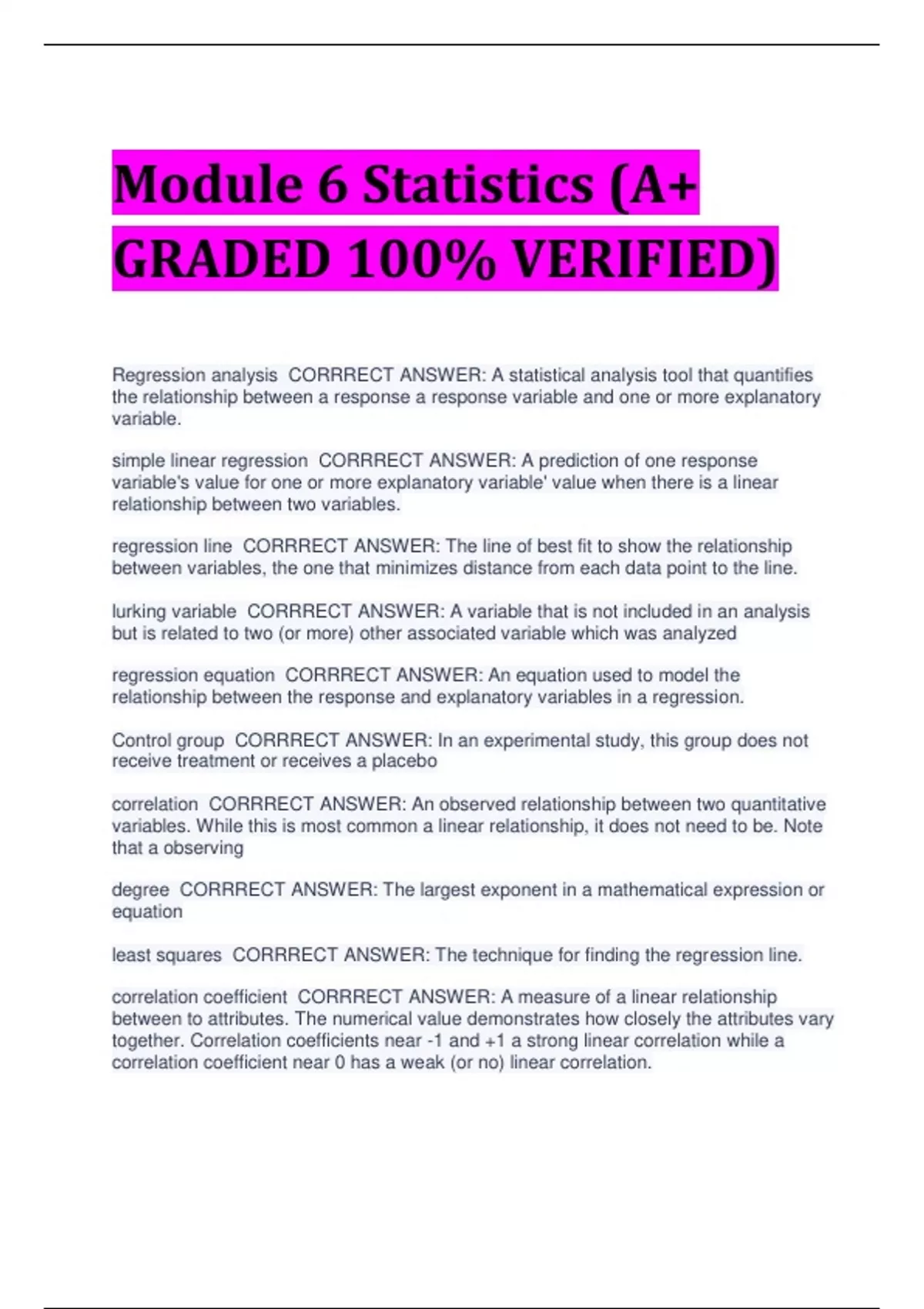 Module 6 Statistics (A+ GRADED 100% VERIFIED) Regression analysis CORRRECT ANSWER: A statistical analysis tool that quantifies the relationship between a response a response variable and one or more explanatory variable. simple linear regression CORRRECT ANSWER: A prediction of one response variable's value for one or more explanatory variable' value when there is a linear relationship between two variables. regression line CORRRECT ANSWER: The line of best fit to show the relationship between variables, the one that minimizes distance from each data point to the line. lurking variable CORRRECT ANSWER: A variable that is not included in an analysis but is related to two (or more) other associated variable which was analyzed regression equation CORRRECT ANSWER: An equation used to model the relationship between the response and explanatory variables in a regression. Control group CORRRECT ANSWER: In an experimental study, this group does not receive treatment or receives a placebo correlation CORRRECT ANSWER: An observed relationship between two quantitative variables. While this is most common a linear relationship, it does not need to be. Note that a observing degree CORRRECT ANSWER: The largest exponent in a mathematical expression or equation least squares CORRRECT ANSWER: The technique for finding the regression line. correlation coefficient CORRRECT ANSWER: A measure of a linear relationship between to attributes. The numerical value demonstrates how closely the attributes vary together. Correlation coefficients near -1 and +1 a strong linear correlation while a correlation coefficient near 0 has a weak (or no) linear correlation. experimental study CORRRECT ANSWER: The researcher applies a treatment to one group and no treatment (or placebo) to a control group, to determine if there is causation between variables. coordinate plane CORRRECT ANSWER: A tool for graphing consisting of a horizontal x-axis and a vertical y x-axis Simpson paradox CORRRECT ANSWER: A counterintuitive in which a trend in different groups of data disappears or reverses when the groups are combined. positive correlation CORRRECT ANSWER: a linear relationship between quantitative variables in which the dependent variable increases as the independent variable increases negative correlation CORRRECT ANSWER: A linear relationship between quantitative variables in which the dependent variable increases as the independent variable decreases. linear interpolation CORRRECT ANSWER: Estimation using the linear regression equation is between known data points. linear extrapolation CORRRECT ANSWER: Estimation using the linear regression equation is made outside know data points. slope-intercept form CORRRECT ANSWER: A common format for the equation of a line: y=mx + b, where m is the slope and b is the y-intercept extrapolate CORRRECT ANSWER: Using information for a data set to make predictions about data outside the original set. observational study CORRRECT ANSWER: The researcher observes if there is an association between variables. There is no treatment or control group. population CORRRECT ANSWER: An entire pool from which a sample is drawn causation CORRRECT ANSWER: A relationship between cause and effect between two or more variables. statistically significant CORRRECT ANSWER: The presumption that a given result or relationship is caused by more than just random chance scatterplot CORRRECT ANSWER: A graph that uses dots on a coordinate plane to show the relationship between variables. association CORRRECT ANSWER: A pattern or relationship between two variables Significant difference CORRRECT ANSWER: A measurable difference between two groups or samples that reflects a real difference, rather the difference being by chance. Hypothesis test CORRRECT ANSWER: A statistical test that tells us whether a result is significant. p-value CORRRECT ANSWER: The probability that the result was caused by chance significant level CORRRECT ANSWER: The p-value cutoff for statistical significance. Any p-value below the set significant level is considered statistical significant. casual relationship CORRRECT ANSWER: A relationship between two variables that can be classified as cause-and-effect. degrees of freedom CORRRECT ANSWER: A number whose value is one less than the sample size, when conducting the hypothesis test.