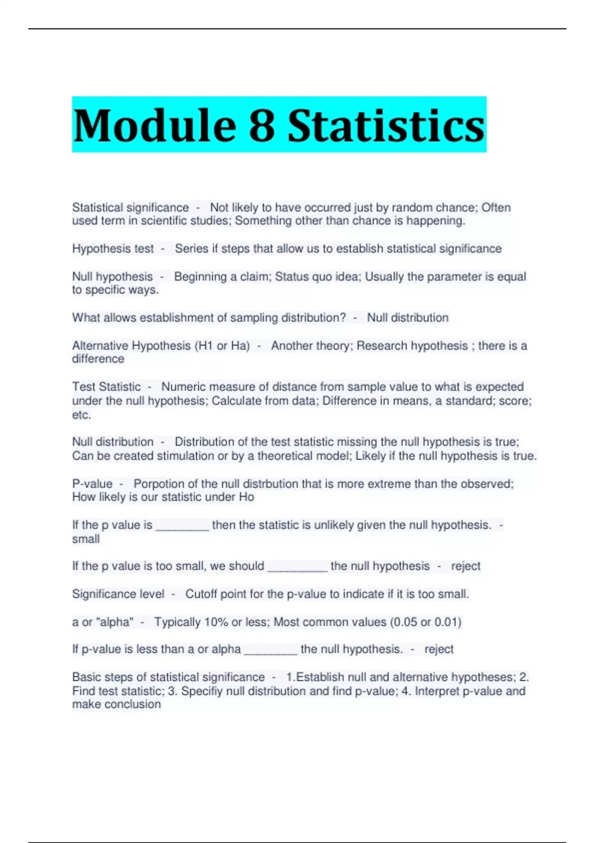 Module 8 Statistics Statistical significance - Not likely to have occurred just by random chance; Often used term in scientific studies; Something other than chance is happening. Hypothesis test - Series if steps that allow us to establish statistical significance Null hypothesis - Beginning a claim; Status quo idea; Usually the parameter is equal to specific ways. What allows establishment of sampling distribution? - Null distribution Alternative Hypothesis (H1 or Ha) - Another theory; Research hypothesis ; there is a difference Test Statistic - Numeric measure of distance from sample value to what is expected under the null hypothesis; Calculate from data; Difference in means, a standard; score; etc. Null distribution - Distribution of the test statistic missing the null hypothesis is true; Can be created stimulation or by a theoretical model; Likely if the null hypothesis is true. P-value - Porpotion of the null distrbution that is more extreme than the observed; How likely is our statistic under Ho If the p value is ________ then the statistic is unlikely given the null hypothesis. - small If the p value is too small, we should _________ the null hypothesis - reject Significance level - Cutoff point for the p-value to indicate if it is too small. a or "alpha" - Typically 10% or less; Most common values (0.05 or 0.01) If p-value is less than a or alpha ________ the null hypothesis. - reject Basic steps of statistical significance - 1.Establish null and alternative hypotheses; 2. Find test statistic; 3. Specifiy null distribution and find p-value; 4. Interpret p-value and make conclusion How do you know when it is a test for proportion? - Subjects are asked a yes/no question; Hypothesis is about a specific proportion; Po (P naught) - A specific proportion of interest like (0.20) P is value is found on the ___ table . - Z