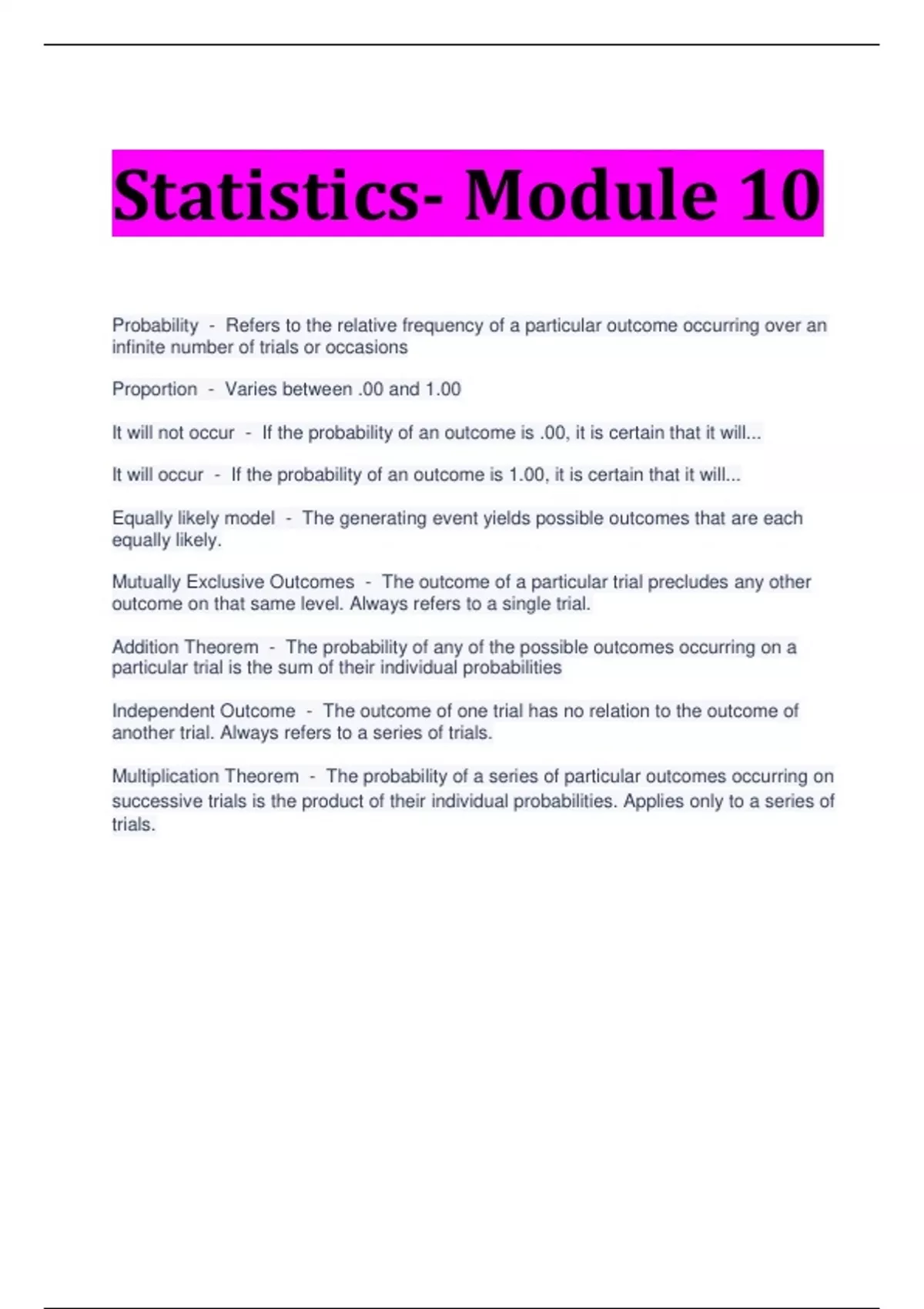 Statistics- Module 10 Probability - Refers to the relative frequency of a particular outcome occurring over an infinite number of trials or occasions Proportion - Varies between .00 and 1.00 It will not occur - If the probability of an outcome is .00, it is certain that it will... It will occur - If the probability of an outcome is 1.00, it is certain that it will... Equally likely model - The generating event yields possible outcomes that are each equally likely. Mutually Exclusive Outcomes - The outcome of a particular trial precludes any other outcome on that same level. Always refers to a single trial. Addition Theorem - The probability of any of the possible outcomes occurring on a particular trial is the sum of their individual probabilities Independent Outcome - The outcome of one trial has no relation to the outcome of another trial. Always refers to a series of trials. Multiplication Theorem - The probability of a series of particular outcomes occurring on successive trials is the product of their individual probabilities. Applies only to a series of trials.