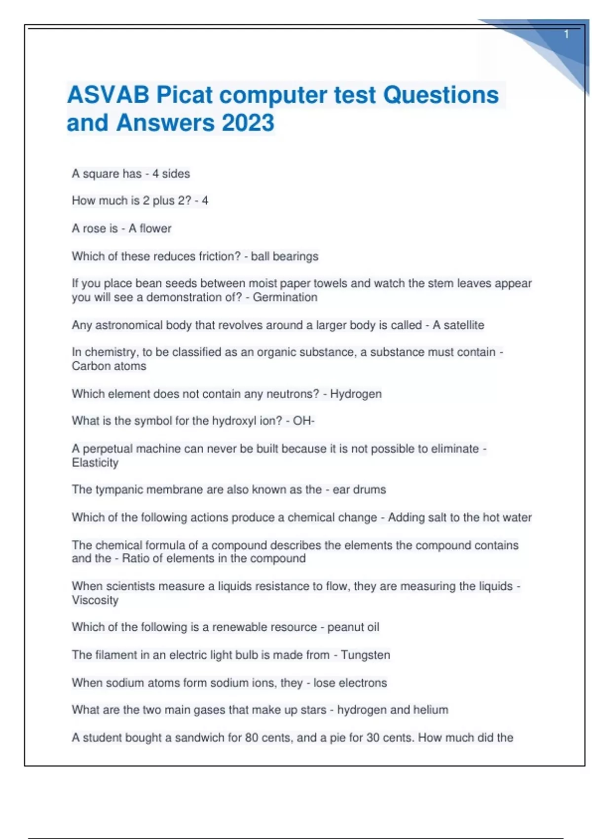 ASVAB Picat computer test Questions and Answers 2023