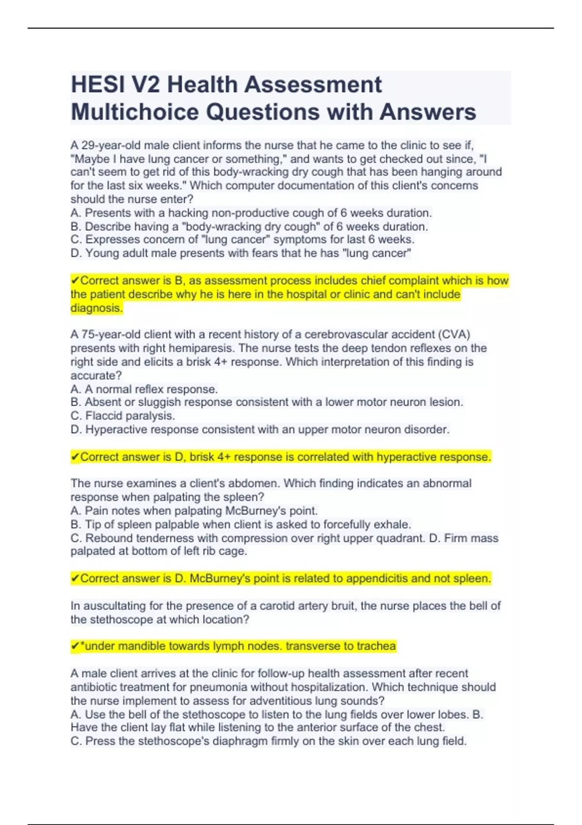 HESI V2 Health Assessment Multichoice Questions with Answers.