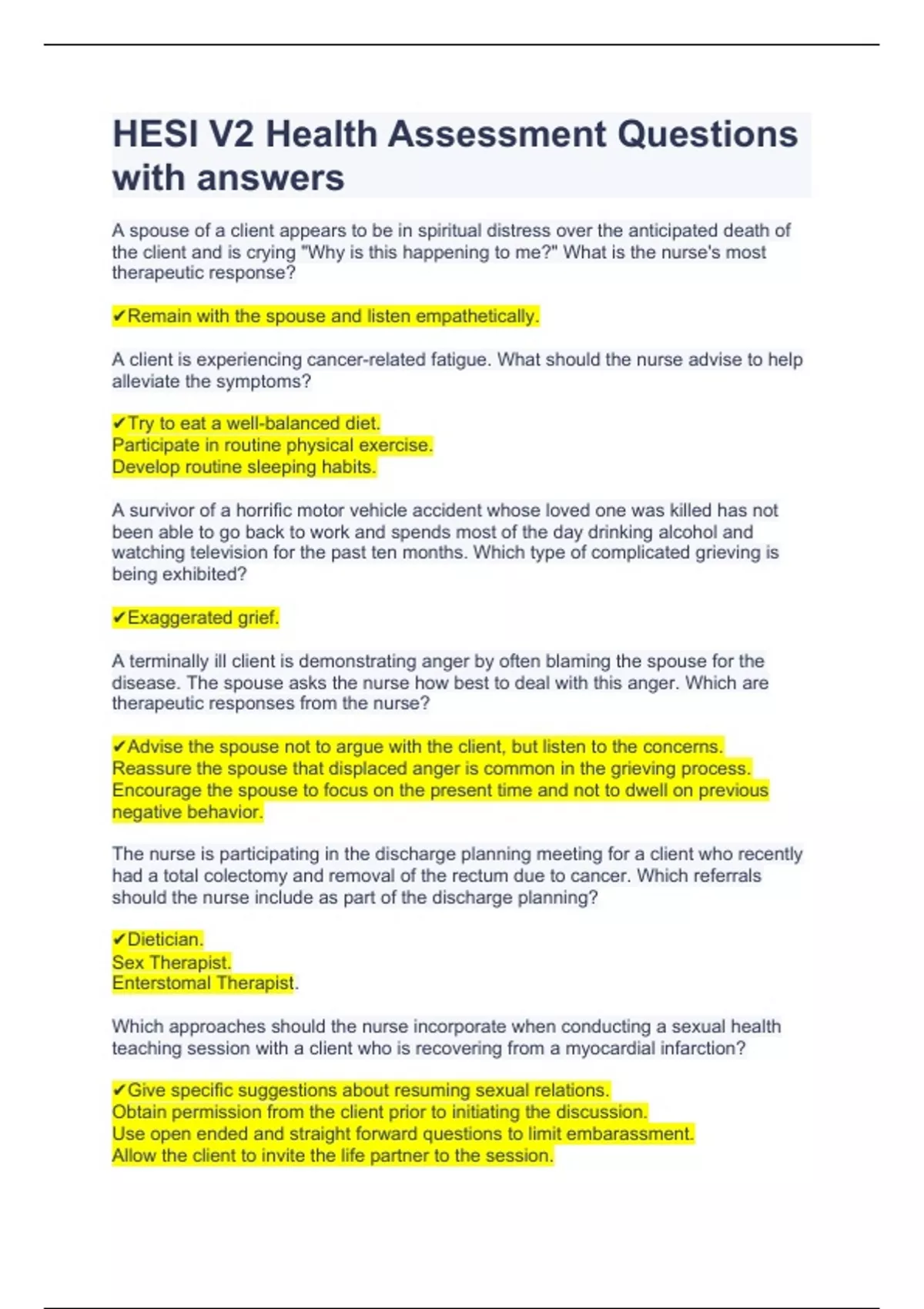 HESI V2 Health Assessment Questions with answers