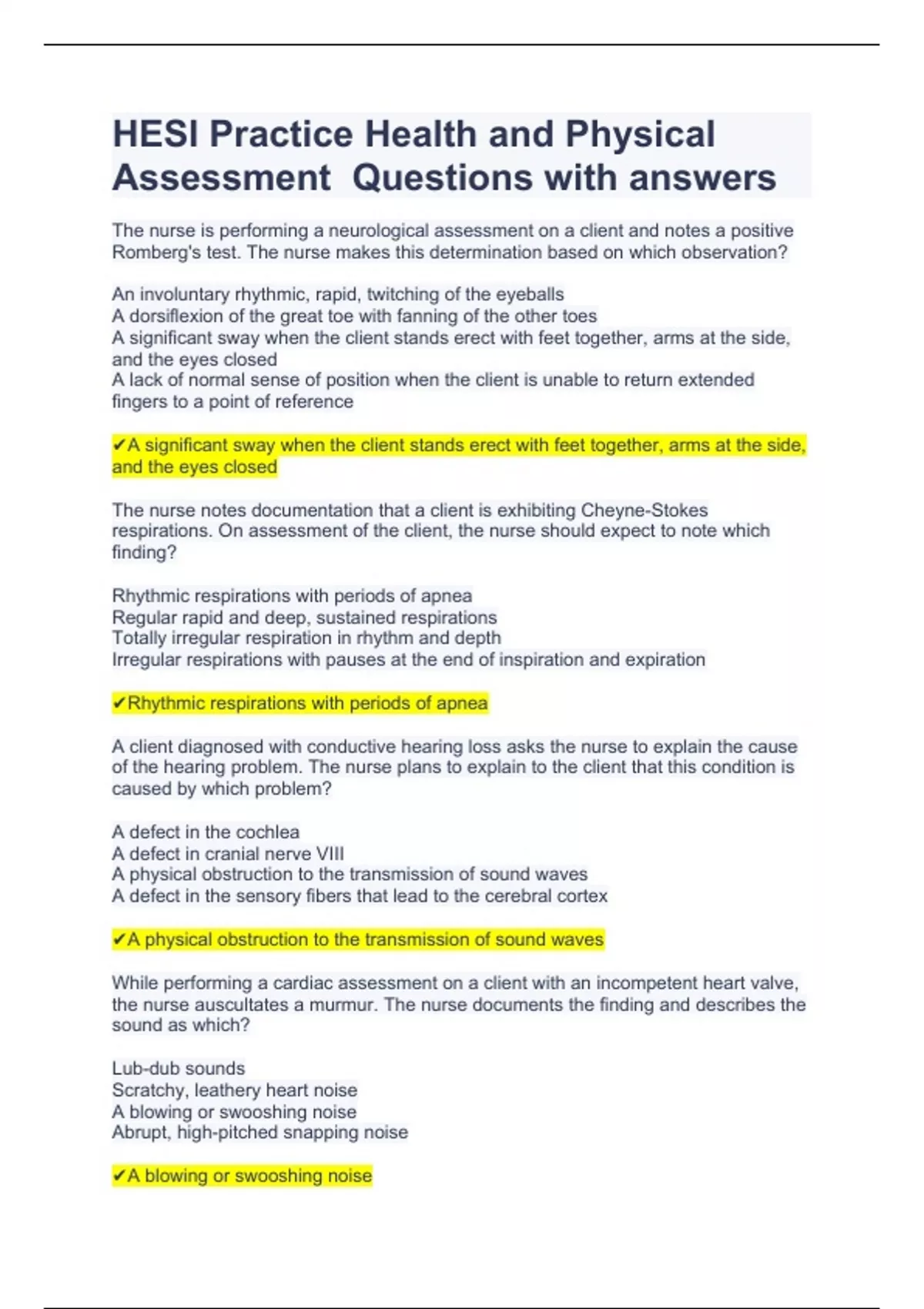HESI Practice Health and Physical Assessment Questions with answers