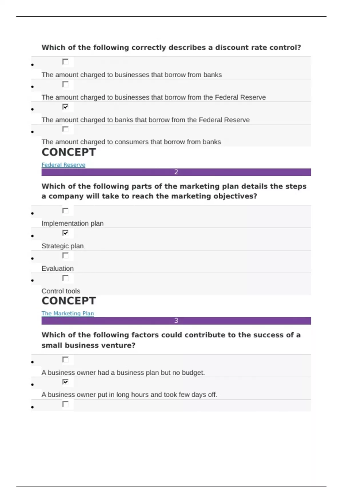Which of the following correctly describes a discount rate control? The amount charged to businesses that borrow from banks The amount charged to businesses that borrow from the Federal Reserve The amount charged to banks that borrow from the Federal Reserve The amount charged to consumers that borrow from banks CONCEPT Federal Reserve 2 Which of the following parts of the marketing plan details the steps a company will take to reach the marketing objectives? Implementation plan Strategic plan Evaluation Control tools