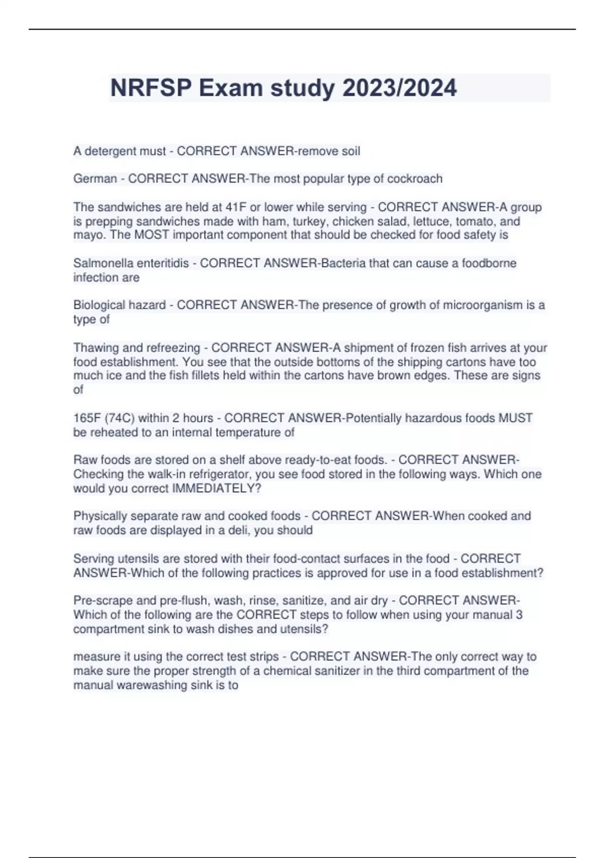 NRFSP Exam study 2023/2024 A detergent must - CORRECT ANSWER-remove soil German - CORRECT ANSWER-The most popular type of cockroach The sandwiches are held at 41F or lower while serving - CORRECT ANSWER-A group is prepping sandwiches made with ham, turkey, chicken salad, lettuce, tomato, and mayo. The MOST important component that should be checked for food safety is Salmonella enteritidis - CORRECT ANSWER-Bacteria that can cause a foodborne infection are Biological hazard - CORRECT ANSWER-The presence of growth of microorganism is a type of Thawing and refreezing - CORRECT ANSWER-A shipment of frozen fish arrives at your food establishment. You see that the outside bottoms of the shipping cartons have too much ice and the fish fillets held within the cartons have brown edges. These are signs of 165F (74C) within 2 hours - CORRECT ANSWER-Potentially hazardous foods MUST be reheated to an internal temperature of Raw foods are stored on a shelf above ready-to-eat foods. - CORRECT ANSWERChecking the walk-in refrigerator, you see food stored in the following ways. Which one would you correct IMMEDIATELY? Physically separate raw and cooked foods - CORRECT ANSWER-When cooked and raw foods are displayed in a deli, you should Serving utensils are stored with their food-contact surfaces in the food - CORRECT ANSWER-Which of the following practices is approved for use in a food establishment? Pre-scrape and pre-flush, wash, rinse, sanitize, and air dry - CORRECT ANSWERWhich of the following are the CORRECT steps to follow when using your manual 3 compartment sink to wash dishes and utensils? measure it using the correct test strips - CORRECT ANSWER-The only correct way to make sure the proper strength of a chemical sanitizer in the third compartment of the manual warewashing sink is to containers without covers - CORRECT ANSWER-Which of the following conditions in an outside waste disposal area needs to be corrected IMMEDIATELY? A hand washing sink in the kitchen is being used to hold a tray of cookies that are cooling - CORRECT ANSWER-During a self-inspection, you see the following situation. Which should you correct at once? using hand sanitizer instead of washing their hands - CORRECT ANSWER-Corrective action needs to be taken IMMEDIATELY if you see a food handler prevent food handlers from contaminating their hands by touching their hair - CORRECT ANSWER-The MOST important reason for having food handlers wear hair restraints is to have them do it for you - CORRECT ANSWER-The best method for teaching employees how to clean a slicer is to show the skill and then have them put on a watertight bandage over the cut and wear gloves - CORRECT ANSWER-You see that the food handler you assigned to prepare the salad has a small cut on their hand. You should The Food and Drug Administration - CORRECT ANSWER-Which agency is responsible for producing the model Food Code? a well-organized food safety and sanitation program - CORRECT ANSWER-In order to assure a safe food handling environment, what should a food establishment have in place before it opens for business? All personnel - CORRECT ANSWER-Who has legal responsibilities for ensuring that food is safe? The management responsibility to take all possible reasonable precautions and care to avoid committing a violation - CORRECT ANSWER-Which definition best explains the concept of reasonable care? Food containing a poisonous or deleterious substance or ingredient - CORRECT ANSWER-Which definition best describes the adulteration of food? safe, unadultered, and honestly presented - CORRECT ANSWER-Which three combination of words best outlines the principles behind food safety legislation? the process by which food becomes unacceptable for human consumption - CORRECT ANSWER-Spoilage is come from reputable vendors who obtain the food from approved sources - CORRECT ANSWER-To help ensure that food is safe to eat, food purchased for your establishment must: using products with the shortest shelf life before using similar products with a longer shelf life - CORRECT ANSWER-FIFO is the stock rotation principle that involves: at 5C (41F) or below - CORRECT ANSWER-TCS and perishable foods must be stored: between 10C and 21C (50F and 70F) - CORRECT ANSWER-The ideal temperature for storing dry goods is: allocate tasks that do not involve exposed food - CORRECT ANSWER-A food handler is just starting a cold. What should a manager do? He wears a waterproof dressing and single use gloves - CORRECT ANSWER-A food handlers causes a small cut on one of his fingers. What is it good practice for a manager to ensure? exclude her from work until approval is given by the regulatory authority - CORRECT ANSWER-A food handler returns to work from a tropical holiday overseas telling a story about everyone in her holiday group, including her partner, getting Salmonella Typhi food poisoning after a festival meal. The holiday ended three days ago. What should a manager do to ensure food safety? suitable for the task, clean, and in good repair - CORRECT ANSWER-Which of these groups of features are the key requirements for protective clothing? Shigella species, Salmonella Typhi, Shigatoxin-producing E. coli, and Hepatitis A - CORRECT ANSWER-Which of the following conditions must be reported to the regulatory authorities if a food employee is diagnosed with one of them? bird feces - CORRECT ANSWER-Which of the following is a physical hazard? Cleaning chemicals stored in a soda bottle - CORRECT ANSWER-Which of the following is a chemical hazard? is present at a food establishment at the time of an inspection and is responsible for the operation at that time - CORRECT ANSWER-The FDA Food Code defines the person in charge as the person who any edible substance or ingredients that is intended for human consumption - CORRECT ANSWER-For the purposes of food safety, food is defined as: eating contaminated food - CORRECT ANSWER-Foodborne illness are diseases caused by: wear clothing that is lightly