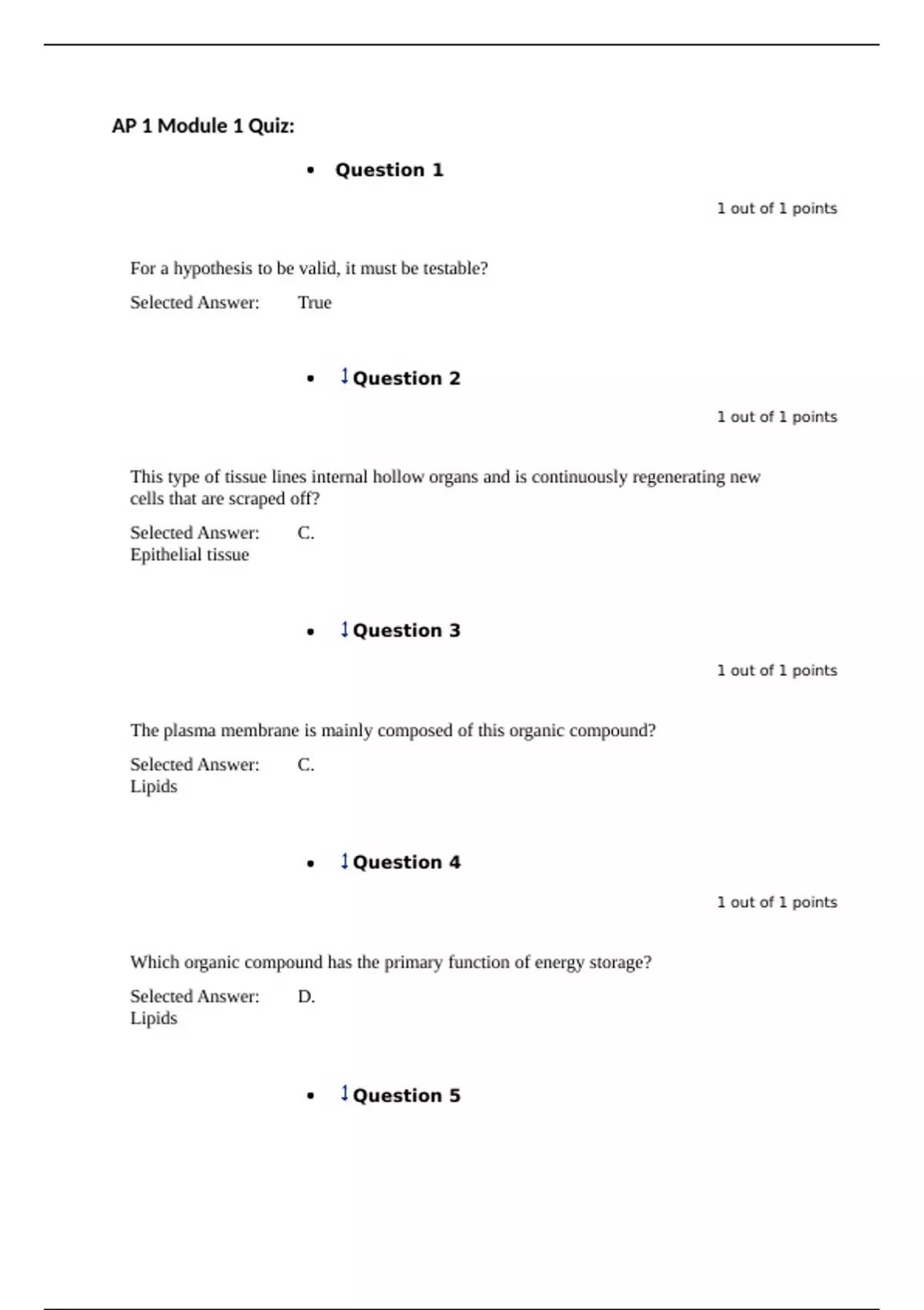 For a hypothesis to be valid, it must be testable? Selected Answer: True · Question 2 1 out of 1 points This type of tissue lines internal hollow organs and is continuously regenerating new cells that are scraped off? Selected Answer: C. Epithelial tissue · Question 3 1 out of 1 points