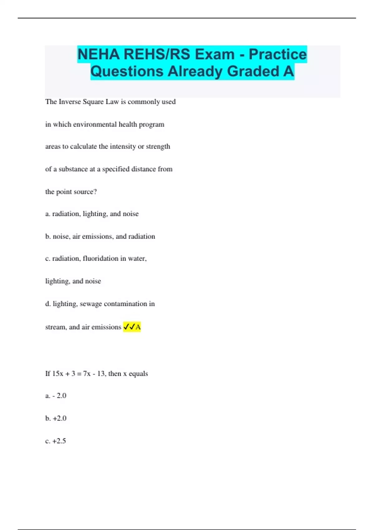 NEHA REHS/RS Exam - Practice Questions Already Graded A The Inverse Square Law is commonly used in which environmental health program areas to calculate the intensity or strength of a substance at a specified distance from the point source? a. radiation, lighting, and noise b. noise, air emissions, and radiation c. radiation, fluoridation in water, lighting, and noise d. lighting, sewage contamination in stream, and air emissions A If 15x + 3 = 7x - 13, then x equals a. - 2.0 b. +2.0 c. +2.5 d. +4.0 A What is the legal term which describes the failure to perform an official duty as an Environmental Health Specialist without sufficient excuse? a. malfeasance b. misfeasance c. nonfeasance d. criminal responsibility C In the field of public health law, state government's police power is an attribute of a sovereign government; whereas, the federal government is a government of a. absolute police power. b. delegated police power. c. limited delegated powers. d. constitutional police power. C An epidemiological study which follows a group of people over time is a _____ study. a. regressive b. prospective c. progressive d. retrospective B A sample collected over a short time period where the atmospheric concentration is assumed to be consistent throughout the sample period is called a(an) _____ sample. a. grab b. small c. partial d. integrated A Adequate cooking will not always prevent Clostridium perfringens food poisoning because a. the enterotoxin is heat stable. b. the spores are heat-resistant and may survive. c. it is a rapidly growing pyrophilic organism. d. incomplete heat distribution results in new bacterial colony formation. B The level that a vacuum breaker must be installed above the flood rim of the fixture or receptacle it is serving is called the _____ level. a. installation b. anti-siphoned c. critical d. backflow C Pursuant to the California Right to Know Law, facilities that handle hazardous materials are primarily required to submit a. Material Safety Data Sheets. b. a business plan. c. a list of all hazardous materials. d. a list of all acutely hazardous materials. B The Paint Filter Liquid Test is used at landfills to determine a. the soil permeability of cover material. b. the sludge content of incoming waste. c. if leachates have been formed. d. if wastes may be landfilled. D Which statement about hydraulic conductivity in soils is true? a. Hydraulic conductivity increases for all soils as they dry. b. Soils with small, discontinuous water-filled pores have high hydraulic conductivity. c. Unsaturated soils with large air-filled pores have a high hydraulic conductivity. d. As soils dry, the hydraulic conductivity of clay soils can become greater than that of sandy soils. D Assuming a high-rate sand filter is operated at 15 gallons per minute per square foot, the minimum size filter needed for a 36,000-gallon swimming pool operating with a six hour turnover rate is _____ square feet. a. 6.67 b. 12.72 c. 23.33 d. 40.01 A In the event of a natural disaster, the safest source of drinking water would be from a(an) a. toilet tank. b. open cistern. c. water heater. d. swimming pool. C Radon does not have the characteristic of a. being known to cause cancer. b. having a long half-life. c. having the ability to enter homes through a water well. d. occurring naturally in the soil. B The causative agent of Weil's Disease resulting from direct or indirect contact with the infected urine of rodents and certain other animals is _____ spp. a. Yersinia b. Leptospira c. Rickettsia d. Wuchereria B Inhalation of asbestos fibers may cause asbestosis, a. cancer, and mesothelioma. b. eye irritation, and skin rash. c. coughing, and pulmonary edema. d. lyphotheliomia, and sensitization. A The problems associated with pneumoconiosis are not heavily influenced by the a. rate of pressure rise. b. size of dust particles. c. length of particle exposure. d. concentration of airborne dusts. A The determination of overcrowding in residential units is based on the number of persons per a. bedroom. b. net square feet of habitable room. c. gross square feet of residential unit. d. cubic feet of airspace in dwelling unit. B Which situation best describes an incompatible land-use? a. One property is adversely impacted by the environmental pollutants generated on an adjacent parcel. b. The value of one property is greatly increased because of the presence of a more valuable land-use for nearby property or properties. c. The land-use allowed on one property adversely affects the health of the residents on an adjacent property. d. The land-use allowed on one parcel or property adversely impacts or restricts the use of an adjacent or nearby property or properties. D Two identical pumps located side-by-side produce a sound level of 80 dBA at a distance of 10 feet. If one of the pumps is turned off, the sound level at 10 feet is dBA. a. 40 b. 70 c. 77 d. 80 C