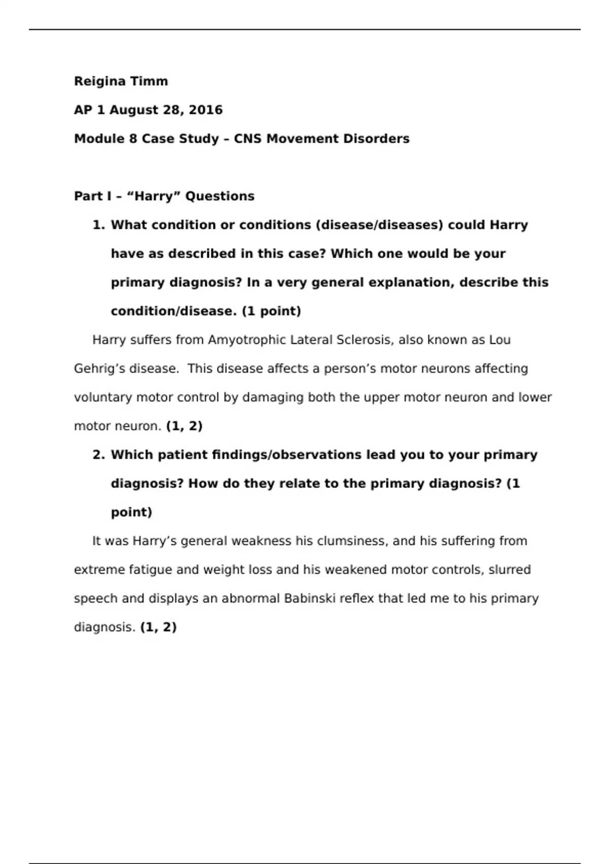 Part I – “Harry” Questions 1. What condition or conditions (disease/diseases) could Harry have as described in this case? Which one would be your primary diagnosis? In a very general explanation, describe this condition/disease. (1 point) Harry suffers from Amyotrophic Lateral Sclerosis, also known as Lou Gehrig’s disease. This disease affects a person’s motor neurons affecting voluntary motor control by damaging both the upper motor neuron and lower motor neuron. (1, 2) 2. Which patient findings/observations lead you to your primary diagnosis? How do they relate to the primary diagnosis? (1 point) It was Harry’s general weakness his clumsiness, and his suffering from extreme fatigue and weight loss and his weakened motor controls, slurred speech and displays an abnormal Babinski reflex that led me to his primary diagnosis. (1, 2)