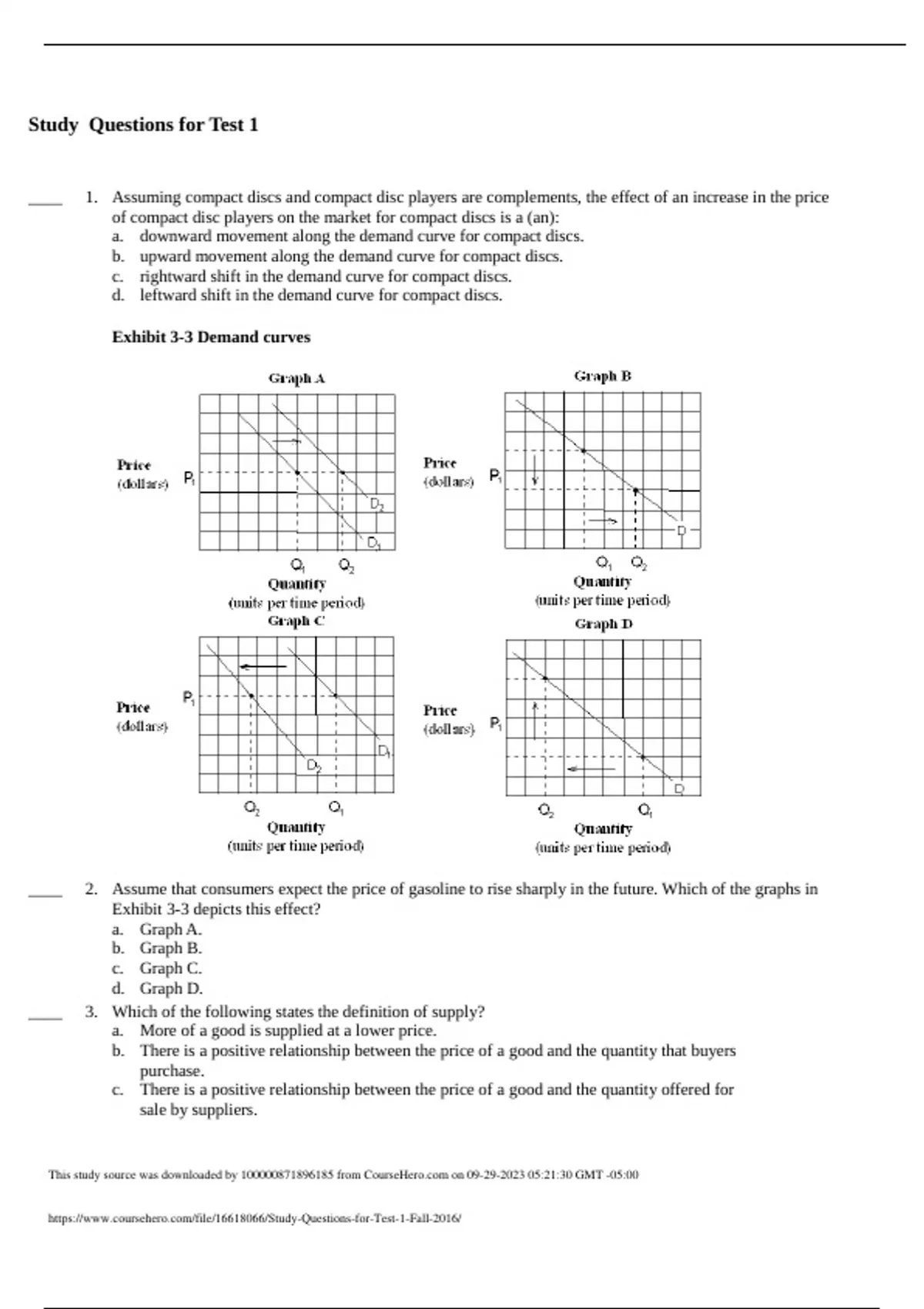 Assuming compact discs and compact disc players are complements, the effect of an increase in the price of compact disc players on the market for compact discs is a (an): a. downward movement along the demand curve for compact discs. b. upward movement along the demand curve for compact discs. c. rightward shift in the demand curve for compact discs. d. leftward shift in the demand curve for compact discs. Exhibit 3-3 Demand curves ____ 2. Assume that consumers expect the price of gasoline to rise sharply in the future. Which of the graphs in Exhibit 3-3 depicts this effect? a. Graph A. b. Graph B. c. Graph C