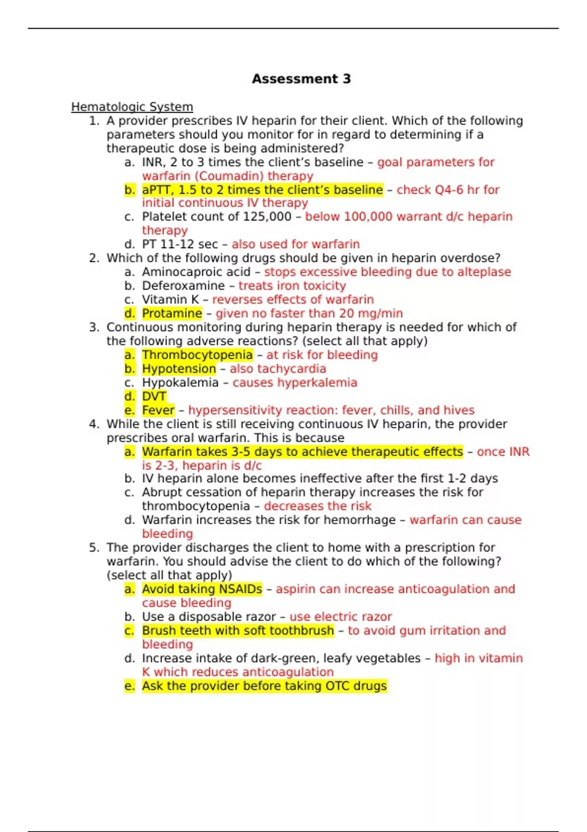 Hematologic System 1. A provider prescribes IV heparin for their client. Which of the following parameters should you monitor for in regard to determining if a therapeutic dose is being administered? a. INR, 2 to 3 times the client’s baseline – goal parameters for warfarin (Coumadin) therapy b. aPTT, 1.5 to 2 times the client’s baseline – check Q4-6 hr for initial continuous IV therapy c. Platelet count of 125,000 – below 100,000 warrant d/c heparin therapy d. PT 11-12 sec – also used for warfarin 2. Which of the following drugs should be given in heparin overdose? a. Aminocaproic acid – stops excessive bleeding due to alteplase b. Deferoxamine – treats iron toxicity c. Vitamin K – reverses effects of warfarin d. Protamine – given no faster than 20 mg/min 3. Continuous monitoring during heparin therapy is needed for which of the following adverse reactions? (select all that apply) a. Thrombocytopenia – at risk for bleeding b. Hypotension – also tachycardia c. Hypokalemia – causes hyperkalemia