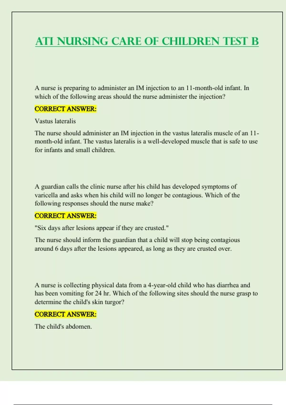 ATI Nursing Care of Children Test B Questions and Answers with Rationales A nurse is preparing to administer an IM injection to an 11-month-old infant. In which of the following areas should the nurse administer the injection? CORRECT ANSWER: Vastus lateralis The nurse should administer an IM injection in the vastus lateralis muscle of an 11-month-old infant. The vastus lateralis is a well-developed muscle that is safe to use for infants and small children. A nurse is caring for a toddler who has terminal cancer and is receiving hospice care. The child's parent tells the nurse, "I'm a bad parent, and I can't deal with this." Which of the following responses should the nurse make? CORRECT ANSWER: "Tell me more about what you are feeling." The nurse should use open-ended statements that will allow the parent to share his feelings and emotions. During times of grief, the parent needs to express his emotions. The use of an open-ended statement relays the message that it is safe to do so with the nurse. A nurse is collecting data from a child during a well-child visit. The nurse should recognize that which of the following findings places the child at a higher risk for abuse? CORRECT ANSWER: The child was born at 30 weeks of gestation. The nurse should identify that children who are born prematurely are at greater risk for abuse because of the potential for impaired bonding during early infancy. A nurse is reinforcing teaching about home care with the guardian of a 14-month-old toddler who has spastic cerebral palsy. Which of the following statements by the guardian indicates an understanding of the teaching? CORRECT ANSWER: "I will perform daily stretching exercises to my toddler's affected muscles." The nurse should reinforce that performing stretching exercises of the toddler's affected muscles will prevent muscle contractures. A nurse is collecting data from an 18-month-old toddler. Which of the following is a deviation from expected growth and development that the nurse should report to the provider? CORRECT ANSWER: The toddler is unable to recognize familiar objects by name. The nurse should report that the toddler is unable to recognize familiar objects by name, because this is a deviation from expected growth and development. The toddler should be able to accomplish this task by 12 months of age. A nurse is reinforcing teaching regarding the immunization schedule with the parent of a 6-month-old infant during a well-baby visit. Which of the following statements by the parent indicates an understanding of the teaching? CORRECT ANSWER: "My baby will receive his third DTaP vaccine today." The nurse should reinforce with the parent that the infant should receive his third diphtheria, tetanus, and pertussis (DTaP) immunization at 6 months of age.